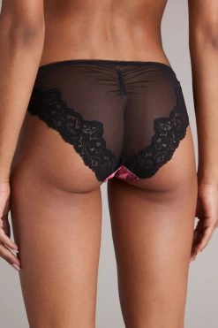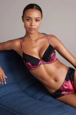 High-leg knickers. Floral satin. Lace overlay. Mesh back. Branded hardware.