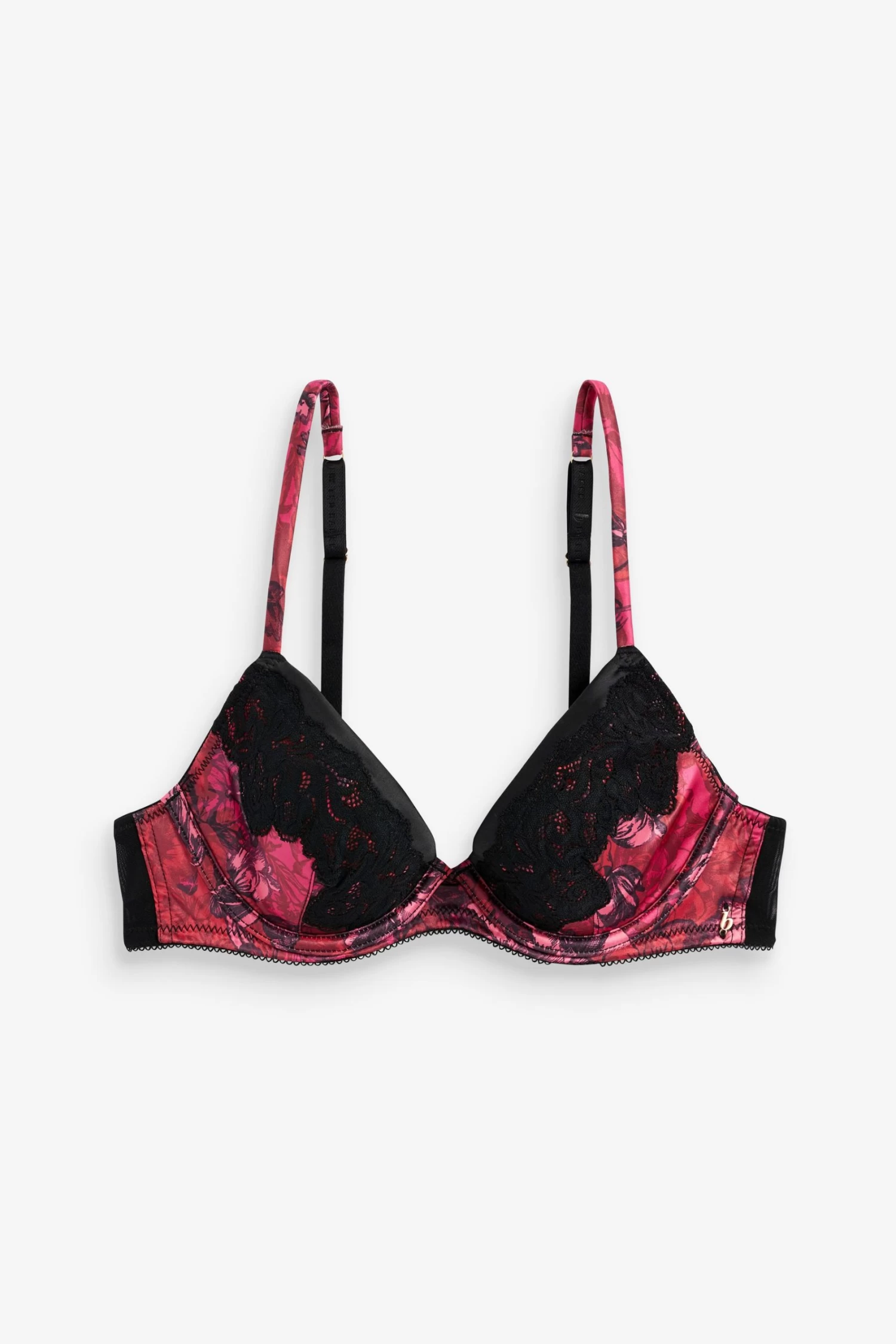 Branded embossed adjustable straps. Branded hardware. Lace overlay. Floral satin. Padded. Underwired. Hook and bar back closure.
