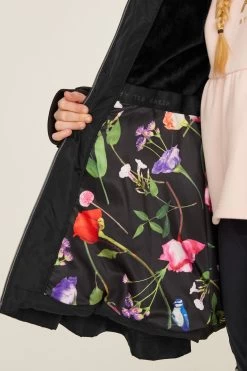 Get her ready for the autumn with this super chic coat from Baker by Ted Baker. The classic black silhouette is padded for extra warmth with an eye-catching glitter branded jacquard waistband that gives the jacket a charming silhouette while emphasising the skirted lower half and is adjustable for the perfect fit. This premium piece is finely finished with silver branded metal hardware, a front zip fastening and a soft faux fur trimmed hood to ensure she is wrapped up in style.