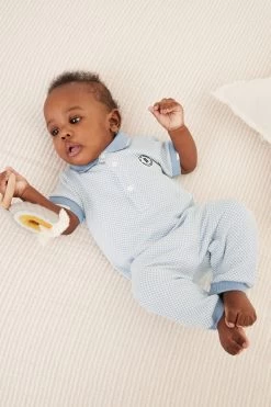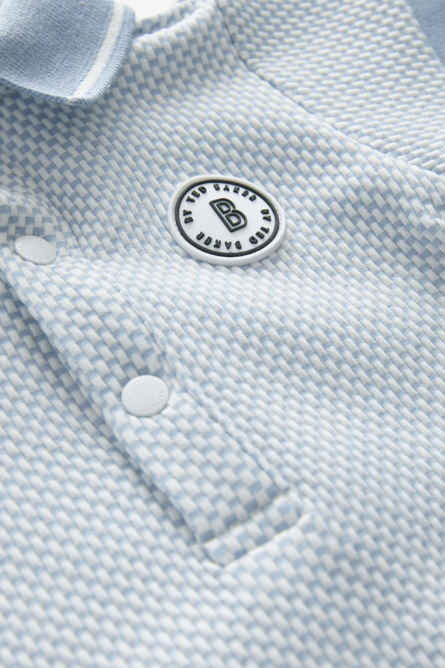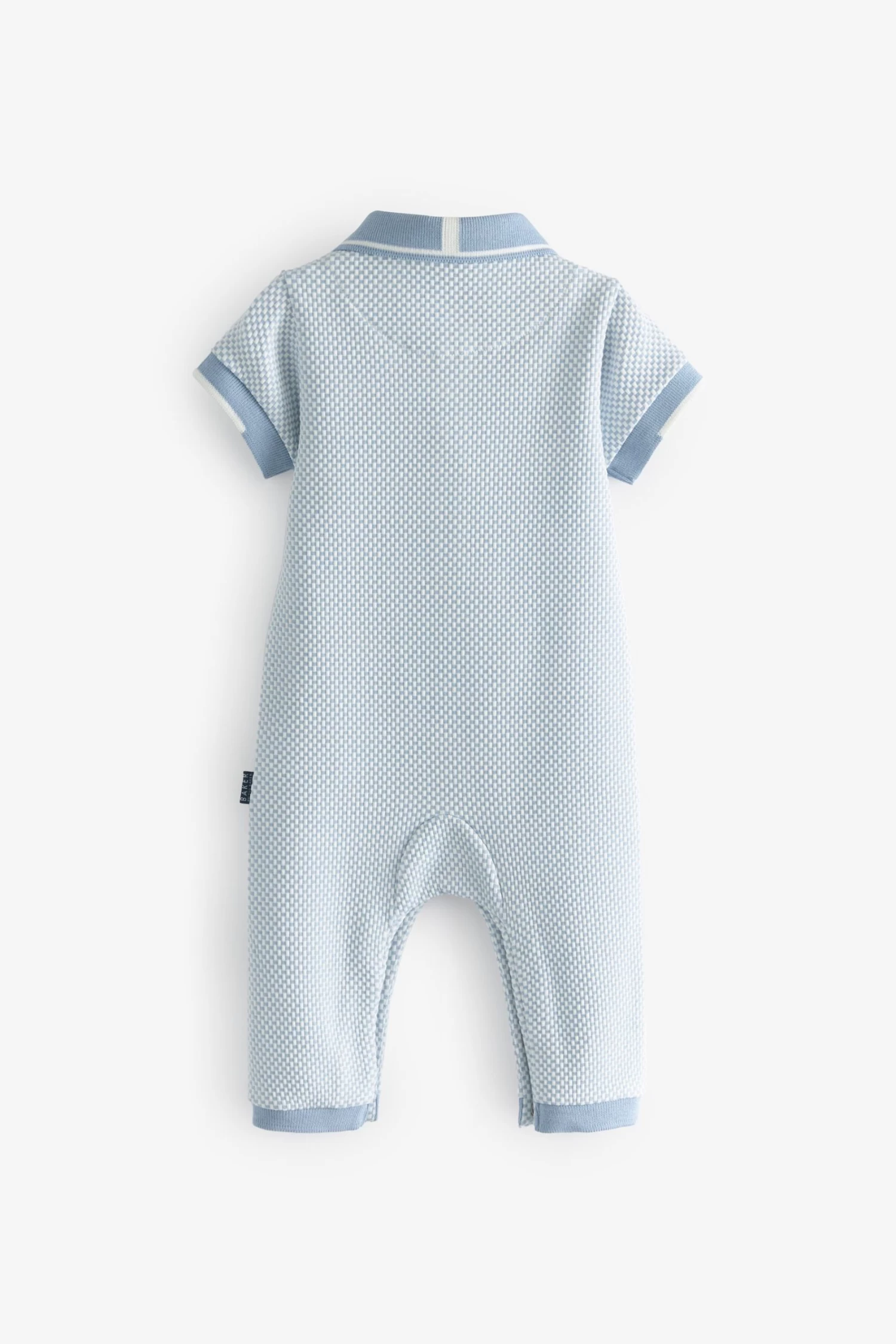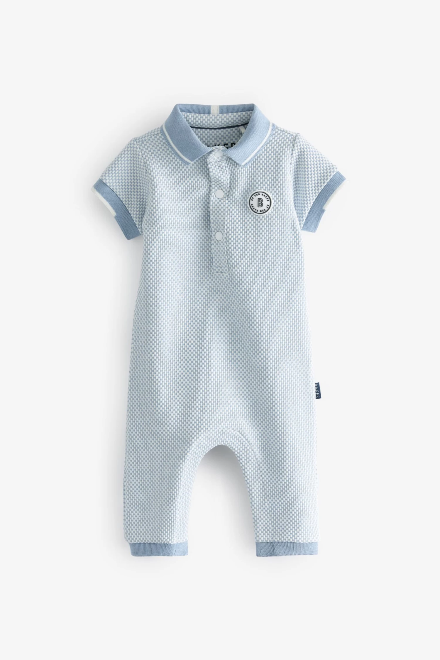Dress up your little one in style with this adorable romper suit from Baker by Ted Baker. Boasting a lovely textured finish, the soft polyester blend all-in-one in a charming shade of light blue also has a branded badge on the chest with a smart white trimmed collar, branded popper snaps at the neck and a woven side tab. There are also popper fastenings between the legs to help at changing times.