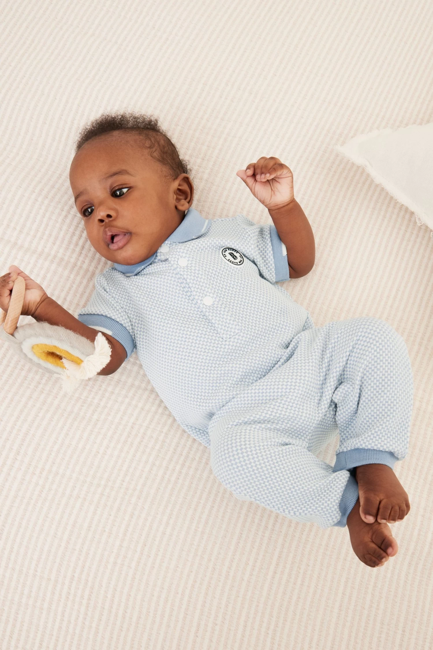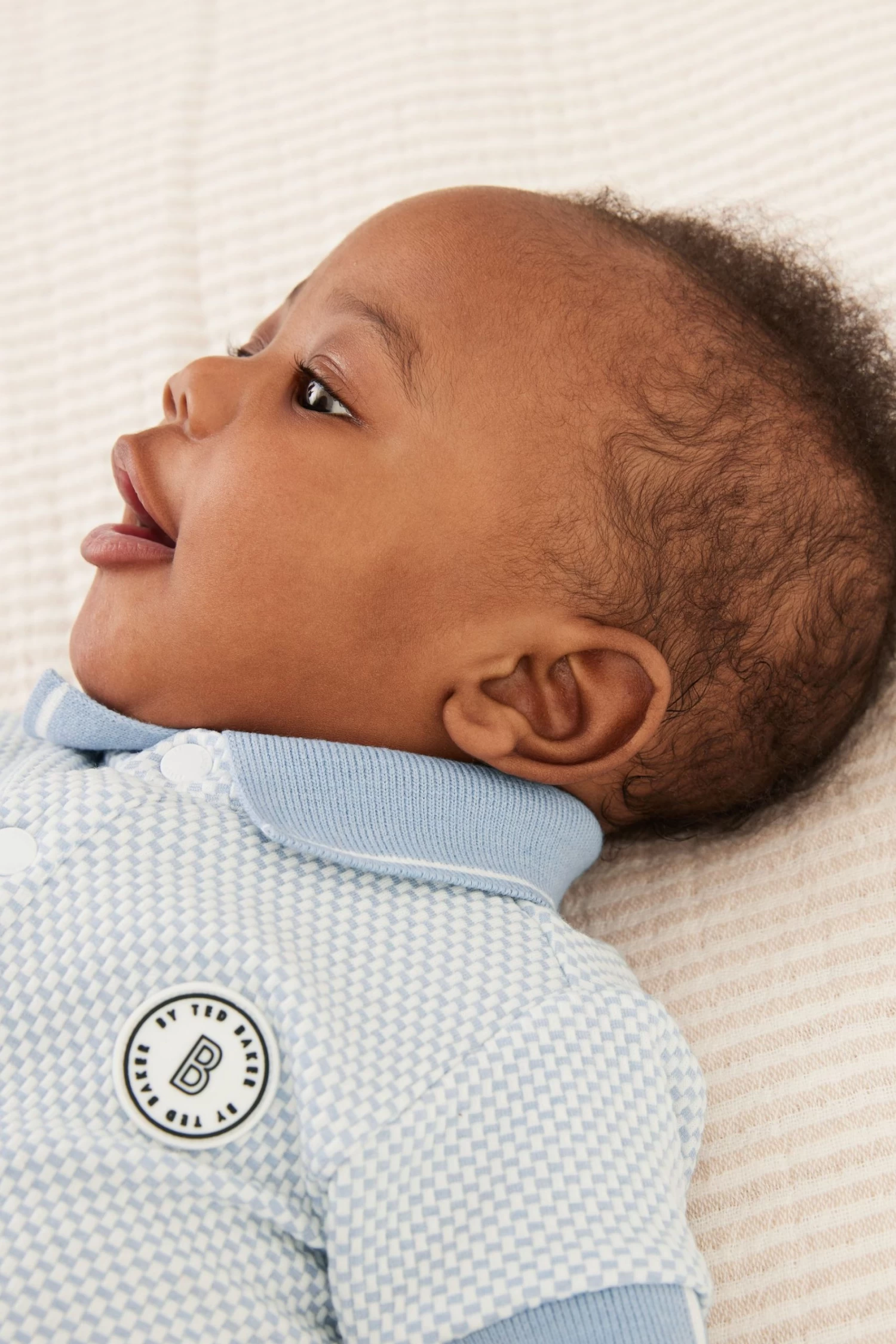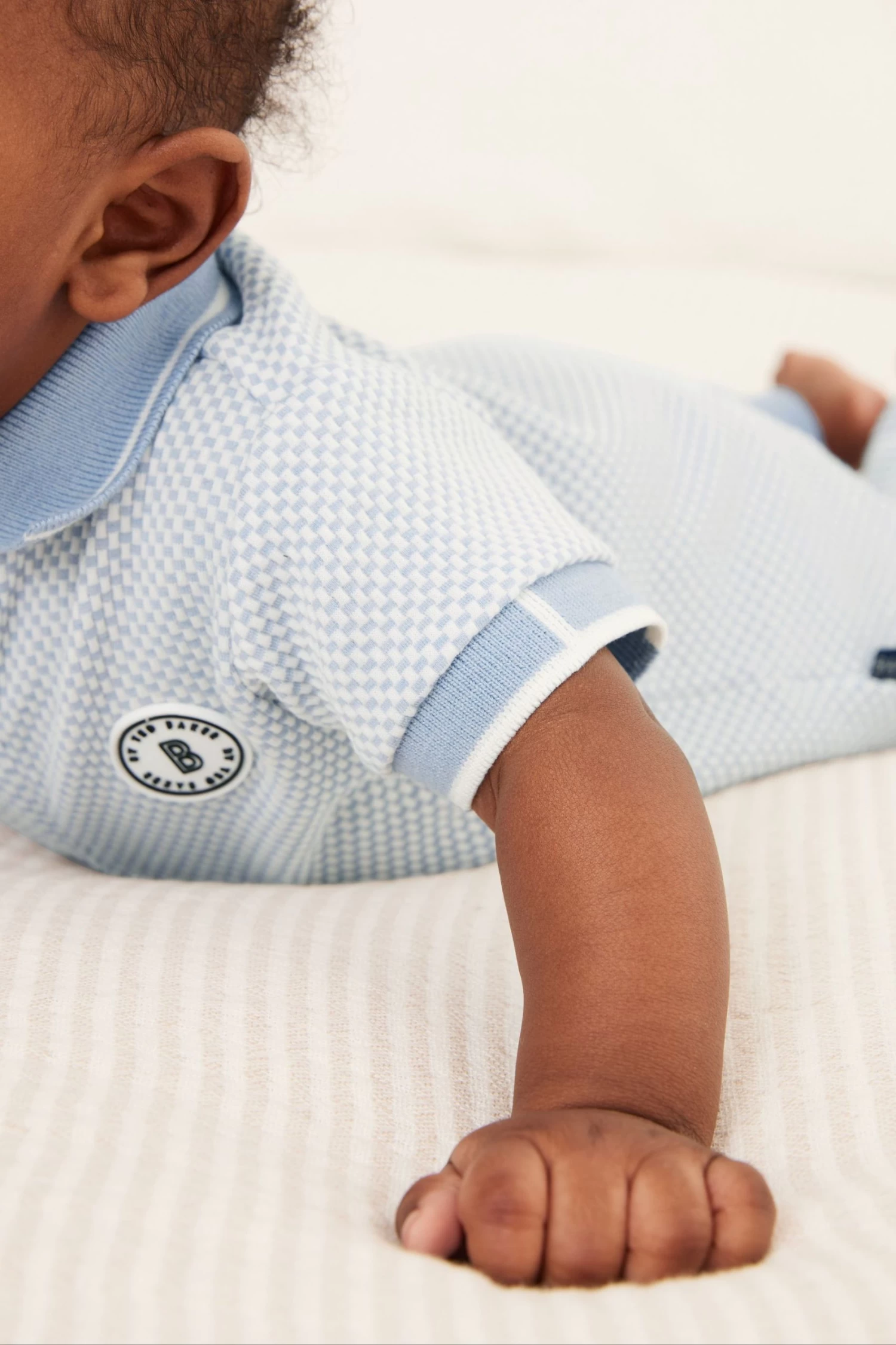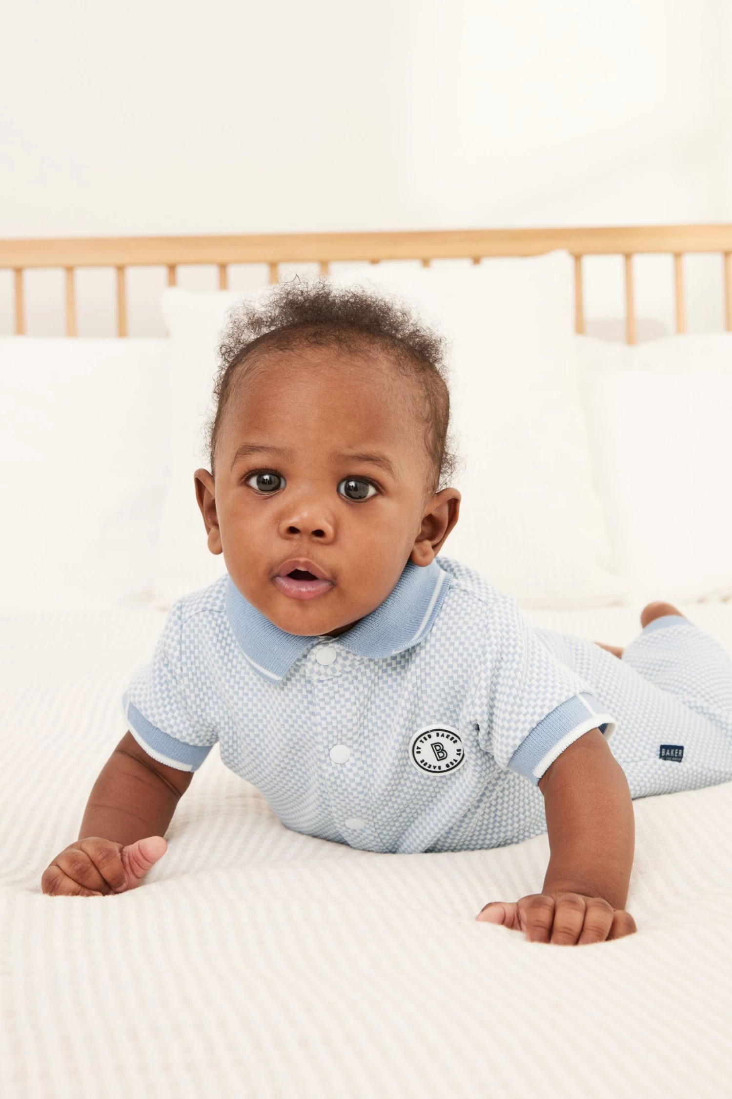 Dress up your little one in style with this adorable romper suit from Baker by Ted Baker. Boasting a lovely textured finish, the soft polyester blend all-in-one in a charming shade of light blue also has a branded badge on the chest with a smart white trimmed collar, branded popper snaps at the neck and a woven side tab. There are also popper fastenings between the legs to help at changing times.