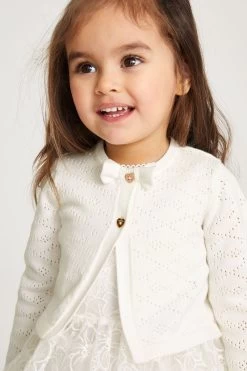 Layer up your little one with this adorable cardigan from Baker by Ted Baker. Made from a supersoft cotton in a pretty shade of pink, this woven piece is decorated all over with a charming diamond design and boasts a delicate bow detail on the collar with cute rose gold heart-shaped button fastenings down the front.