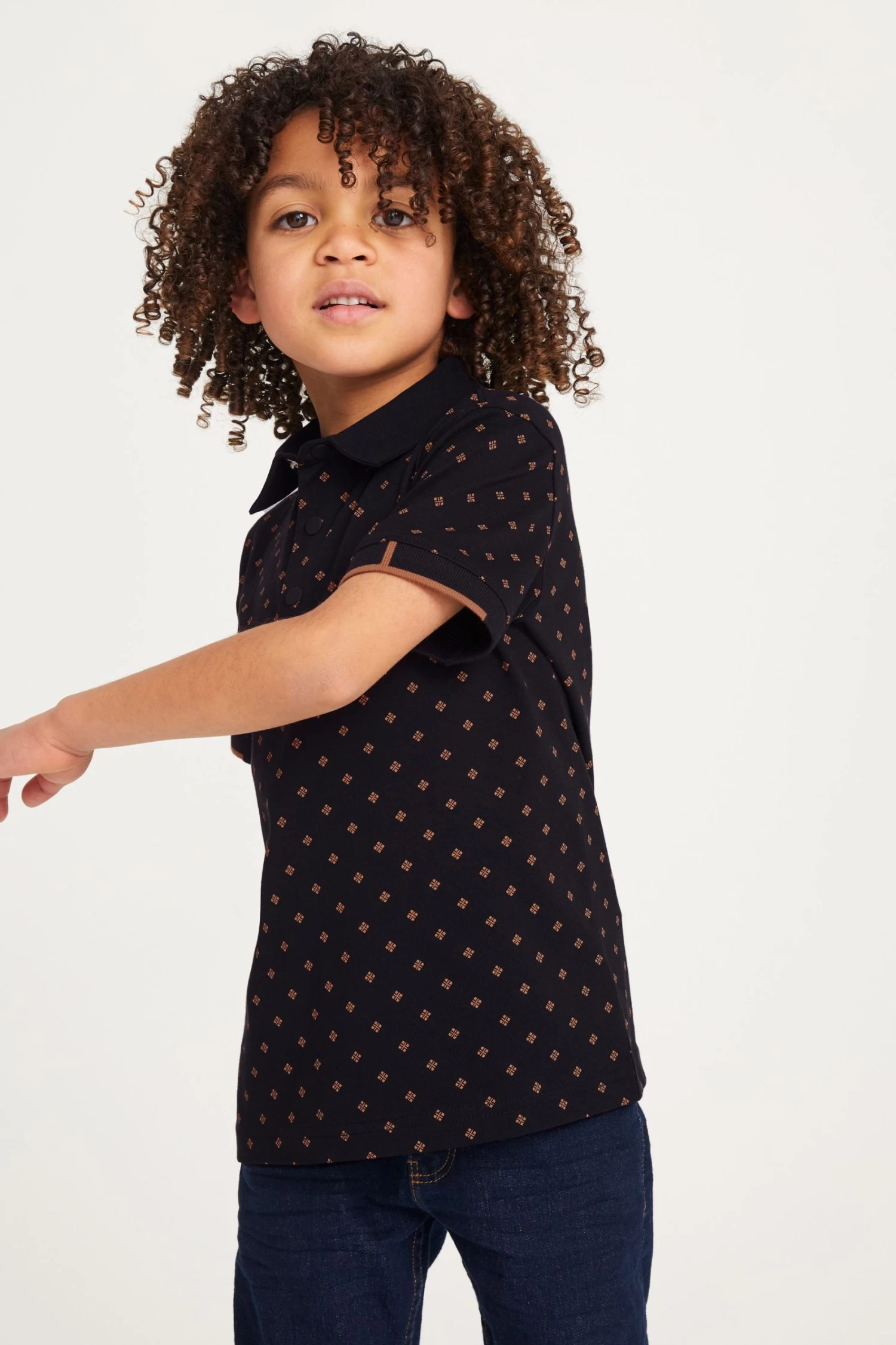 Smarten up your little man’s look with this polo shirt from Baker by Ted Baker. The updated classic is made from soft cotton with a stylish gold print all over it, black branded snaps on the neck and a gold edge detail on the sleeve cuffs. Offering a regular fit, this polo also boasts a stripe detail on the back of the collar and will look lovely dressed up or down.