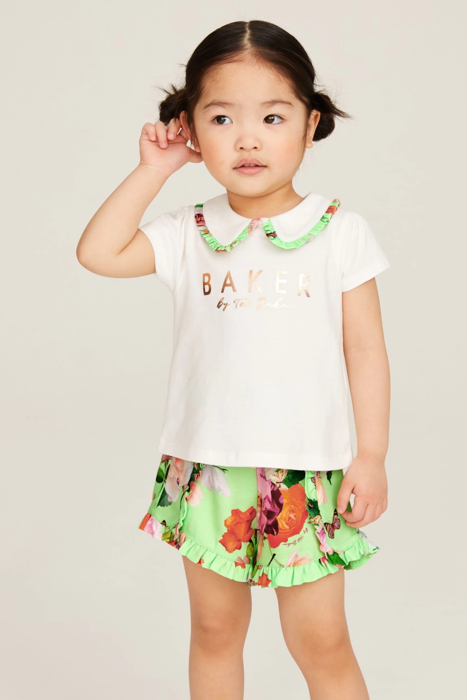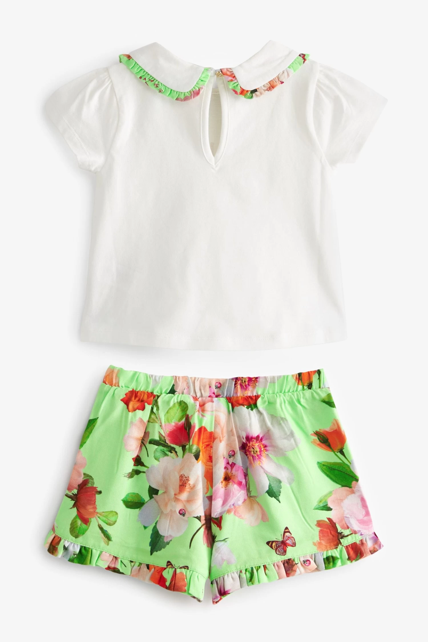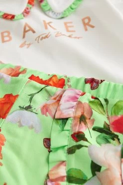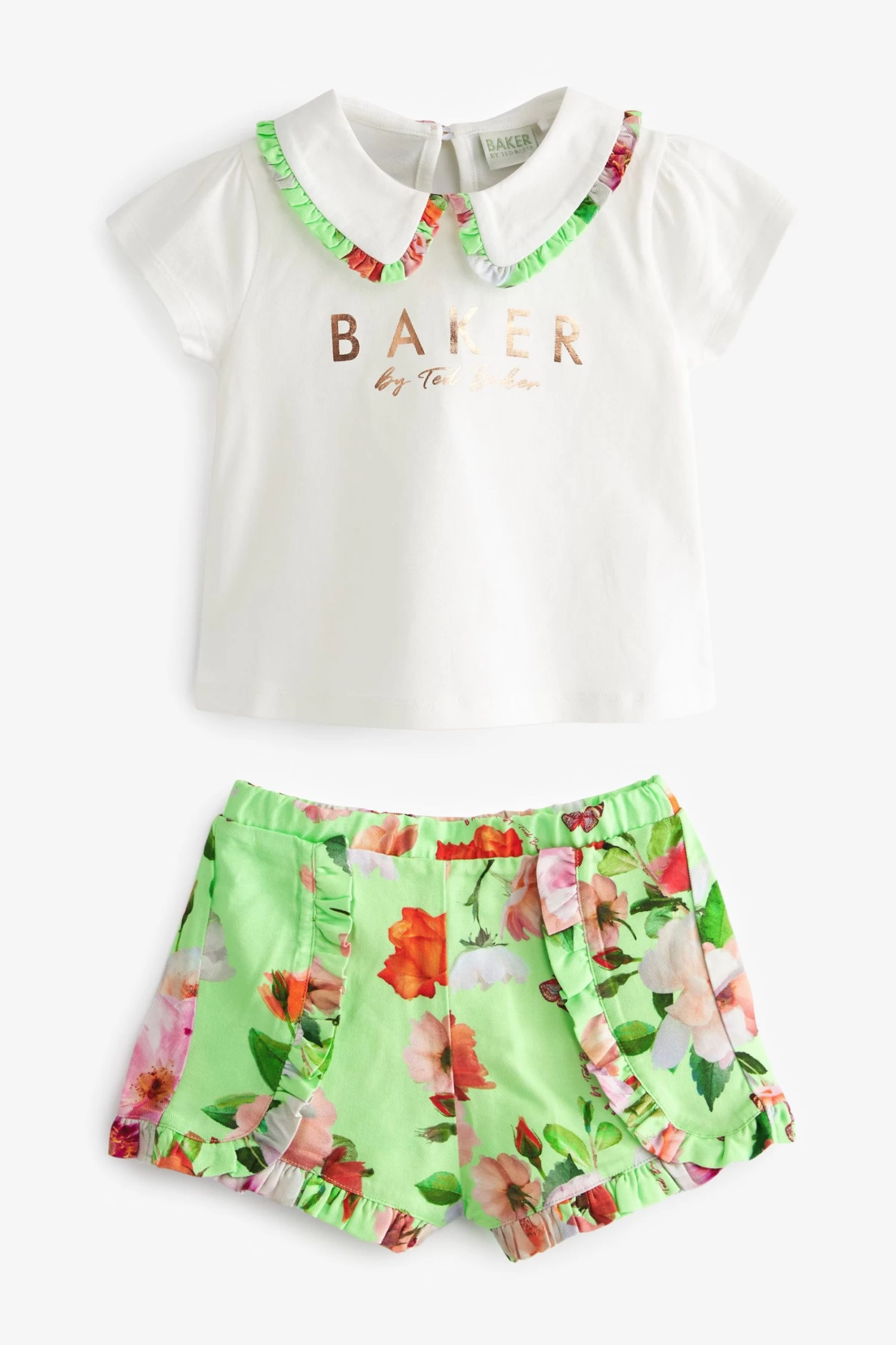 Made for warm sunny days, this charming set from Baker by Ted Baker will keep you little lady looking cute and cool this summer. The two-piece outfit includes a classic white t-shirt that features the iconic branding printed across the chest in rose gold foil and a pretty collar with a green floral trim. It comes with shorts made with the same green floral print and they are finished with frill details on the front and bottom of the hems.