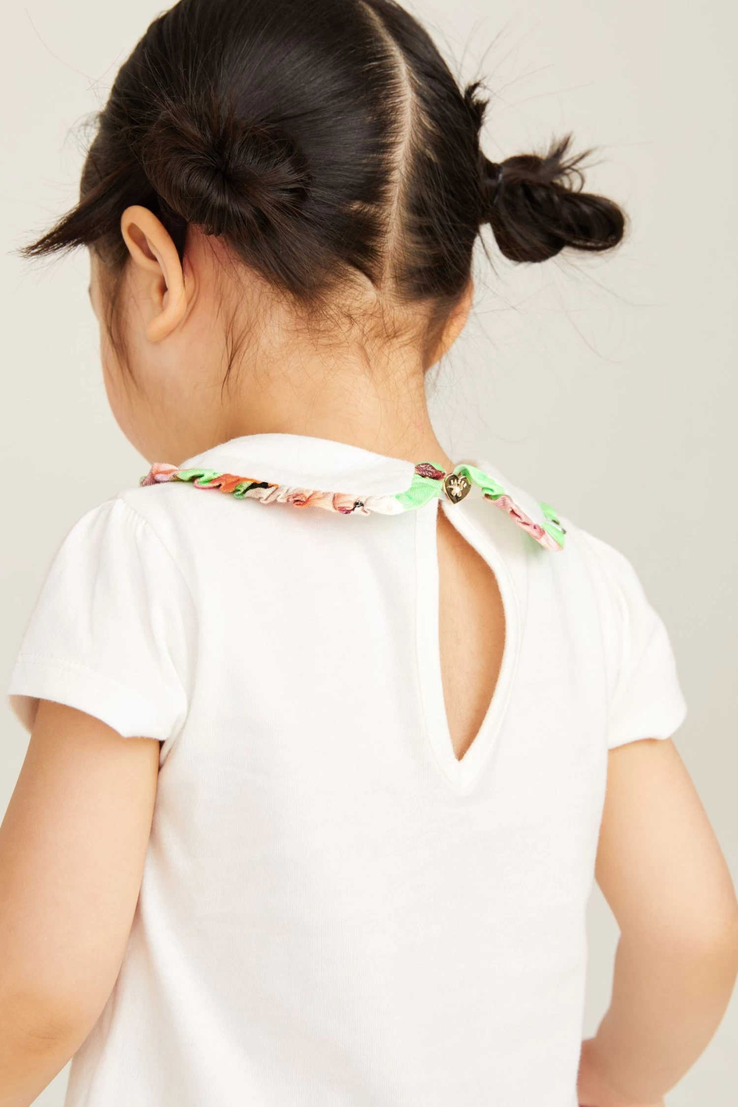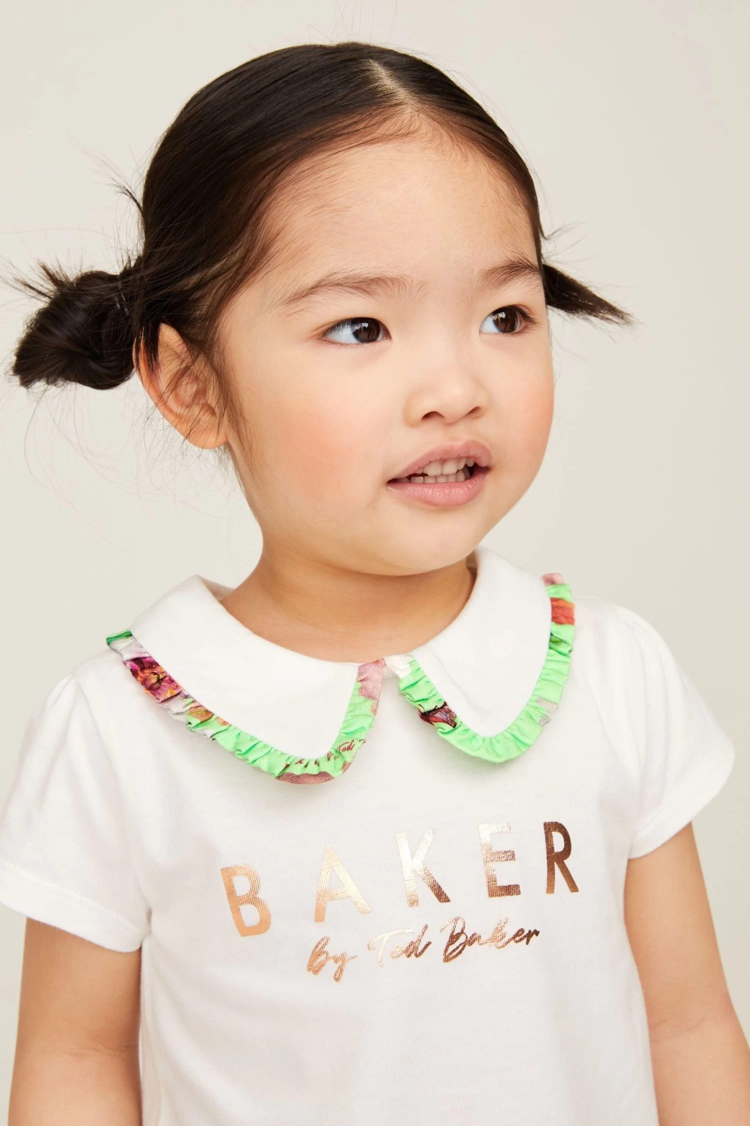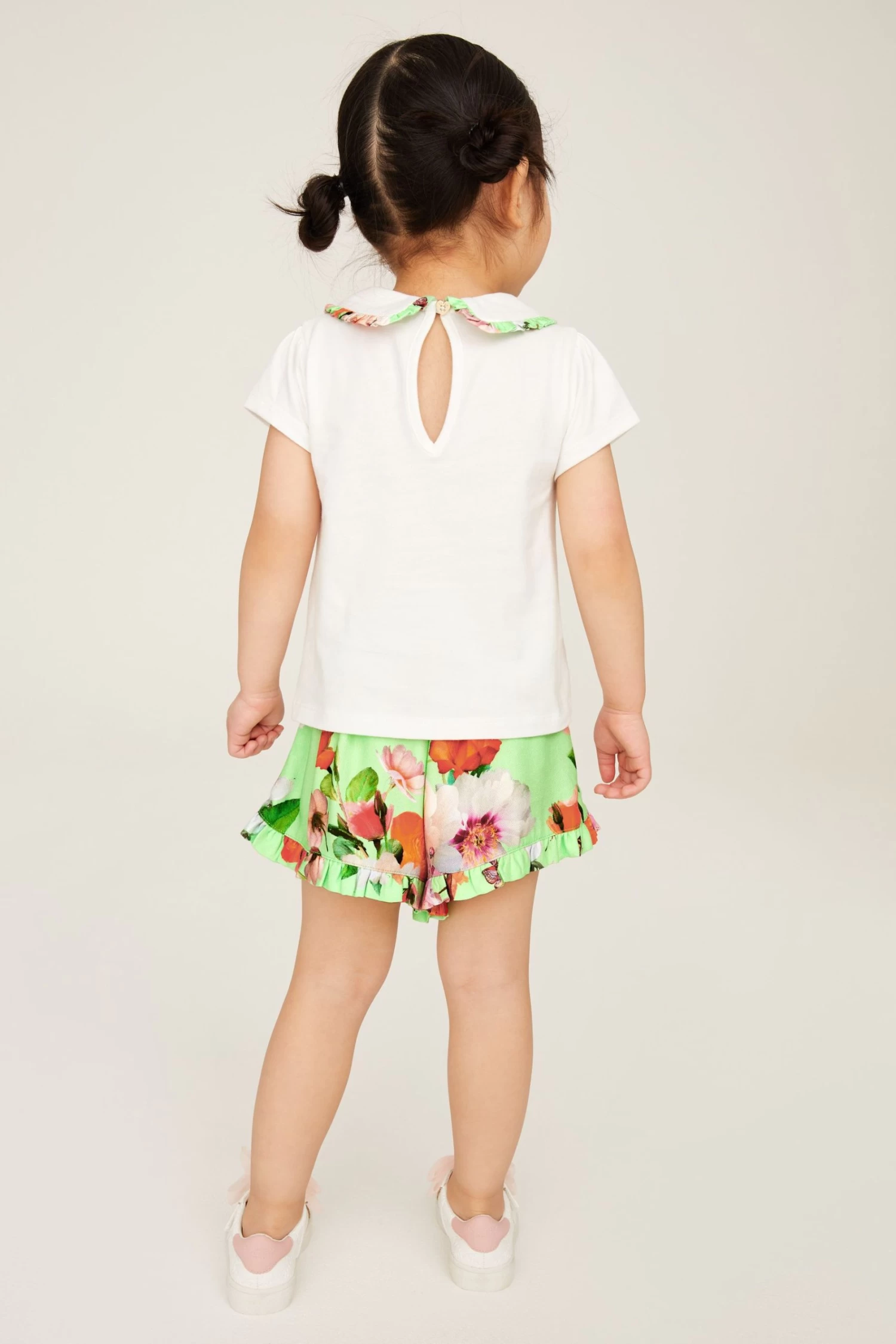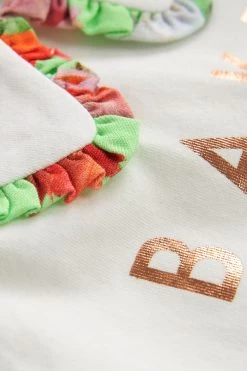 Made for warm sunny days, this charming set from Baker by Ted Baker will keep you little lady looking cute and cool this summer. The two-piece outfit includes a classic white t-shirt that features the iconic branding printed across the chest in rose gold foil and a pretty collar with a green floral trim. It comes with shorts made with the same green floral print and they are finished with frill details on the front and bottom of the hems.