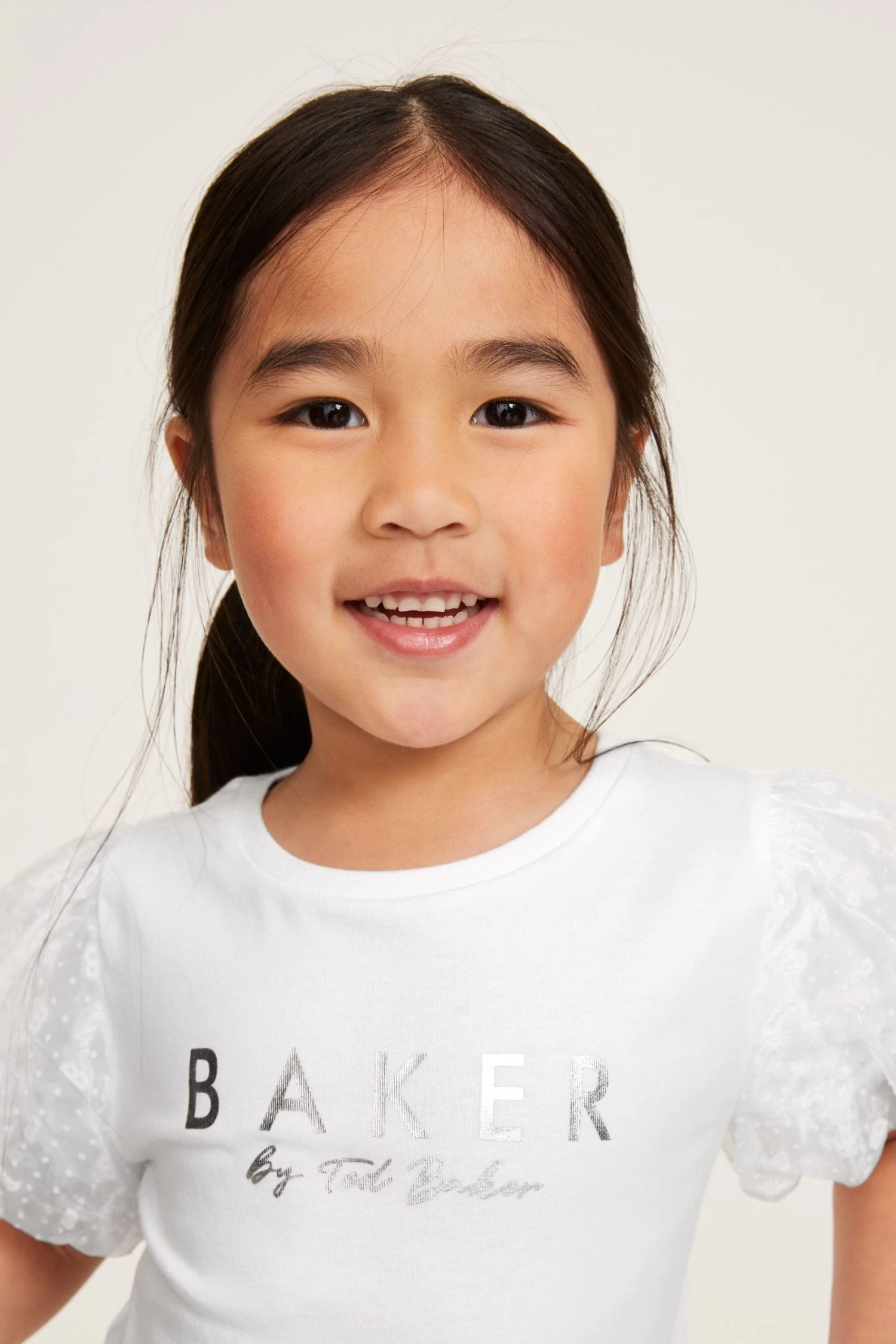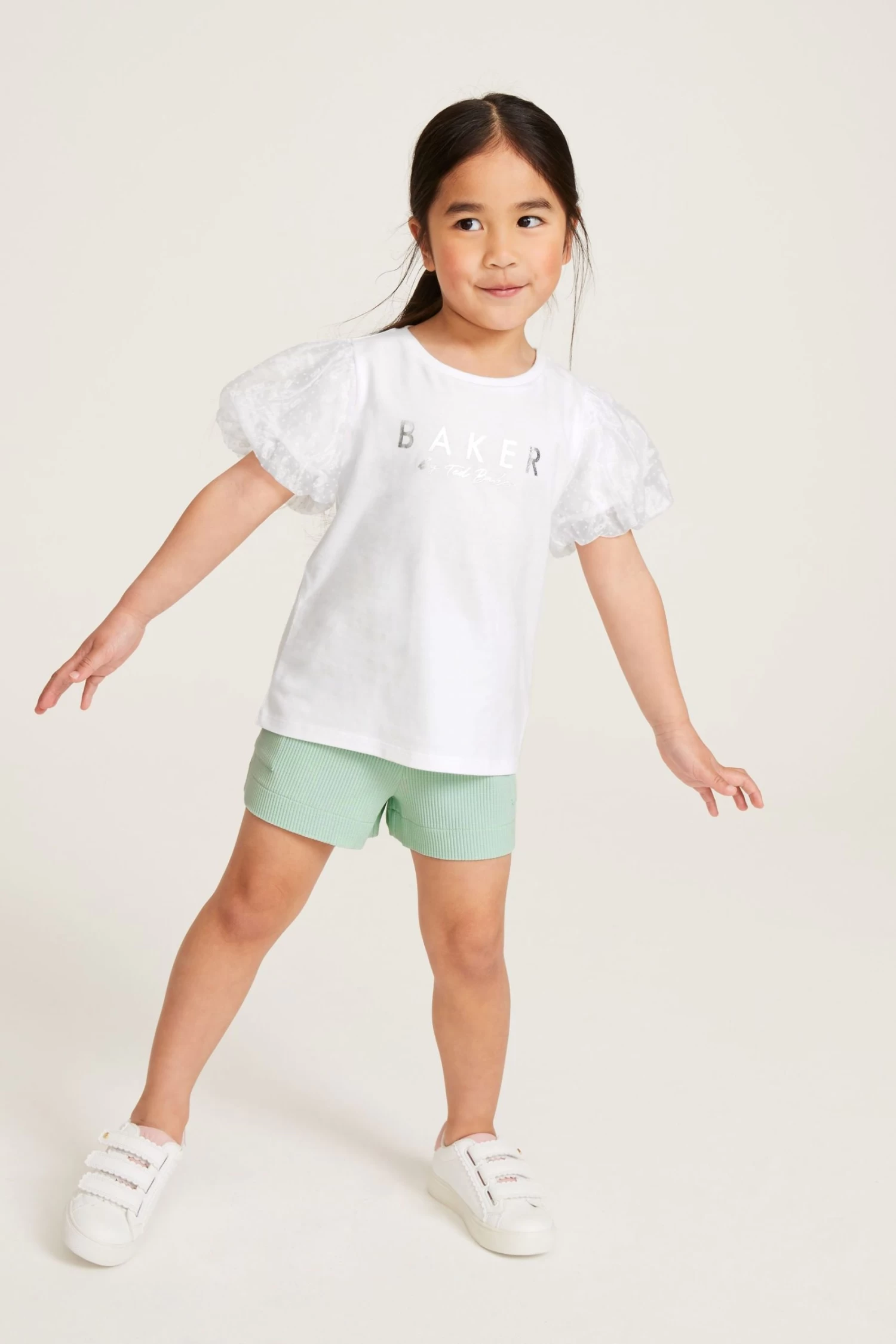 Perfect for playtime, this two-piece set from Baker by Ted Baker will be a summer must have. The outfit set includes a charming white top that has pretty branded organza sleeves and silver foil branding across the chest. It comes with a lovely pair of mint green shorts that have cargo style pockets and an elasticated waistband for a comfortable fit. Team them with a pair of trainers and she is ready to go.
