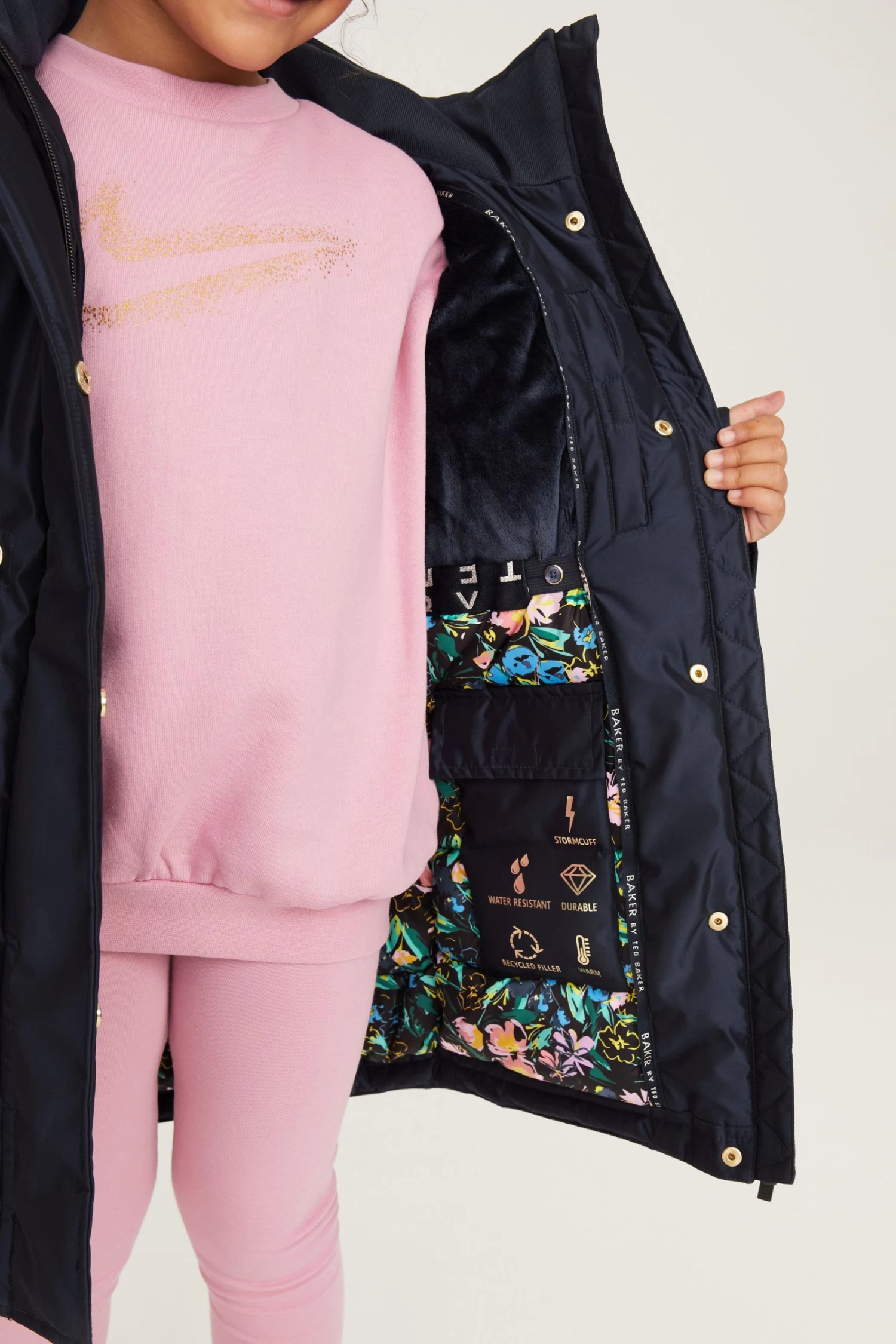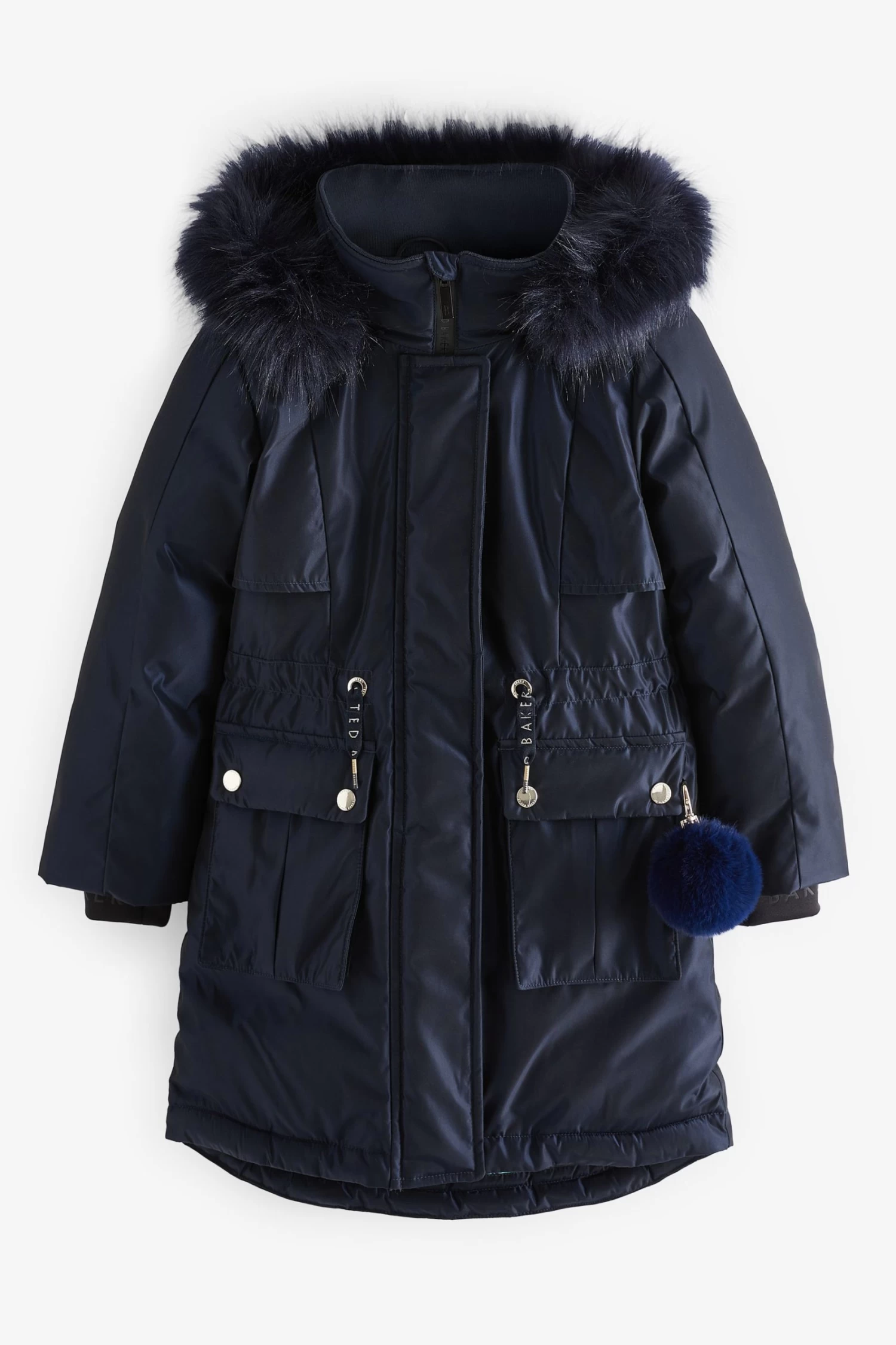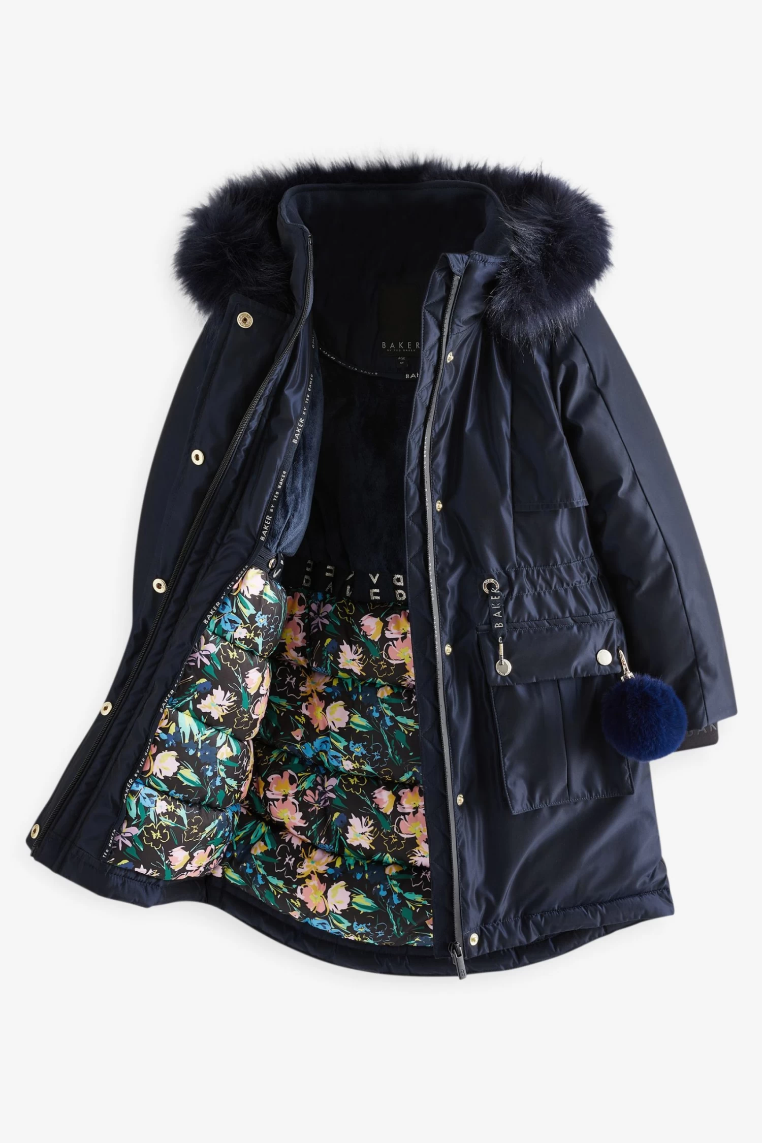This stylish coat from Baker by Ted Baker is made from a shower resistant fabric. With faux fur lined hood and upper body for extra warmth and signature printed lower body lining. Extra features include a luxe detachable faux fur hood trim, branded neoprene cuffs with thumb holes for extra warmth, pale gold coloured branded metalwork, branded coated zip, cosy fleece lined pockets, Baker reflective branding on back of hood and furry pom pom keyring.