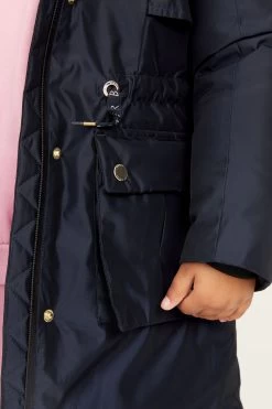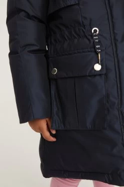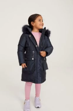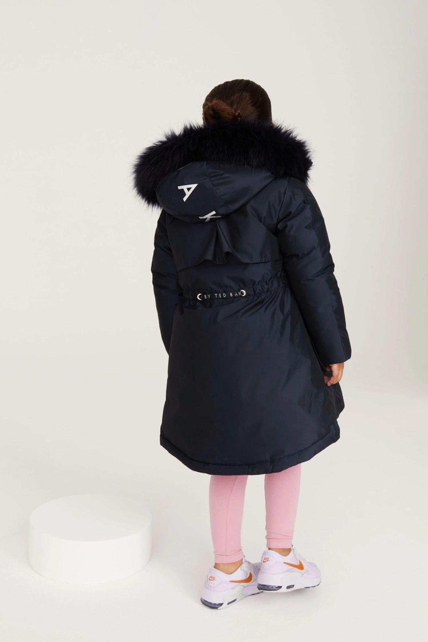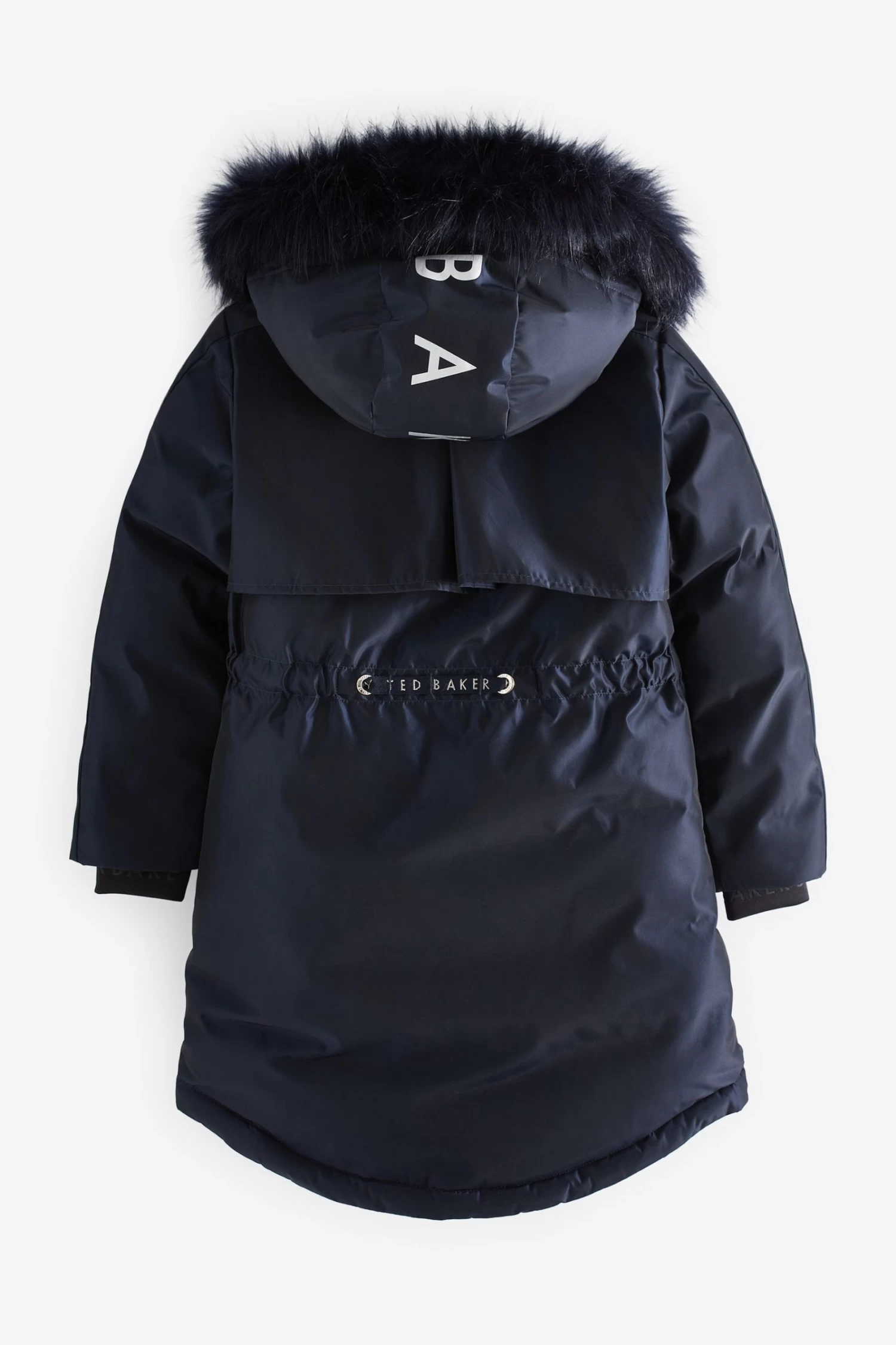 This stylish coat from Baker by Ted Baker is made from a shower resistant fabric. With faux fur lined hood and upper body for extra warmth and signature printed lower body lining. Extra features include a luxe detachable faux fur hood trim, branded neoprene cuffs with thumb holes for extra warmth, pale gold coloured branded metalwork, branded coated zip, cosy fleece lined pockets, Baker reflective branding on back of hood and furry pom pom keyring.