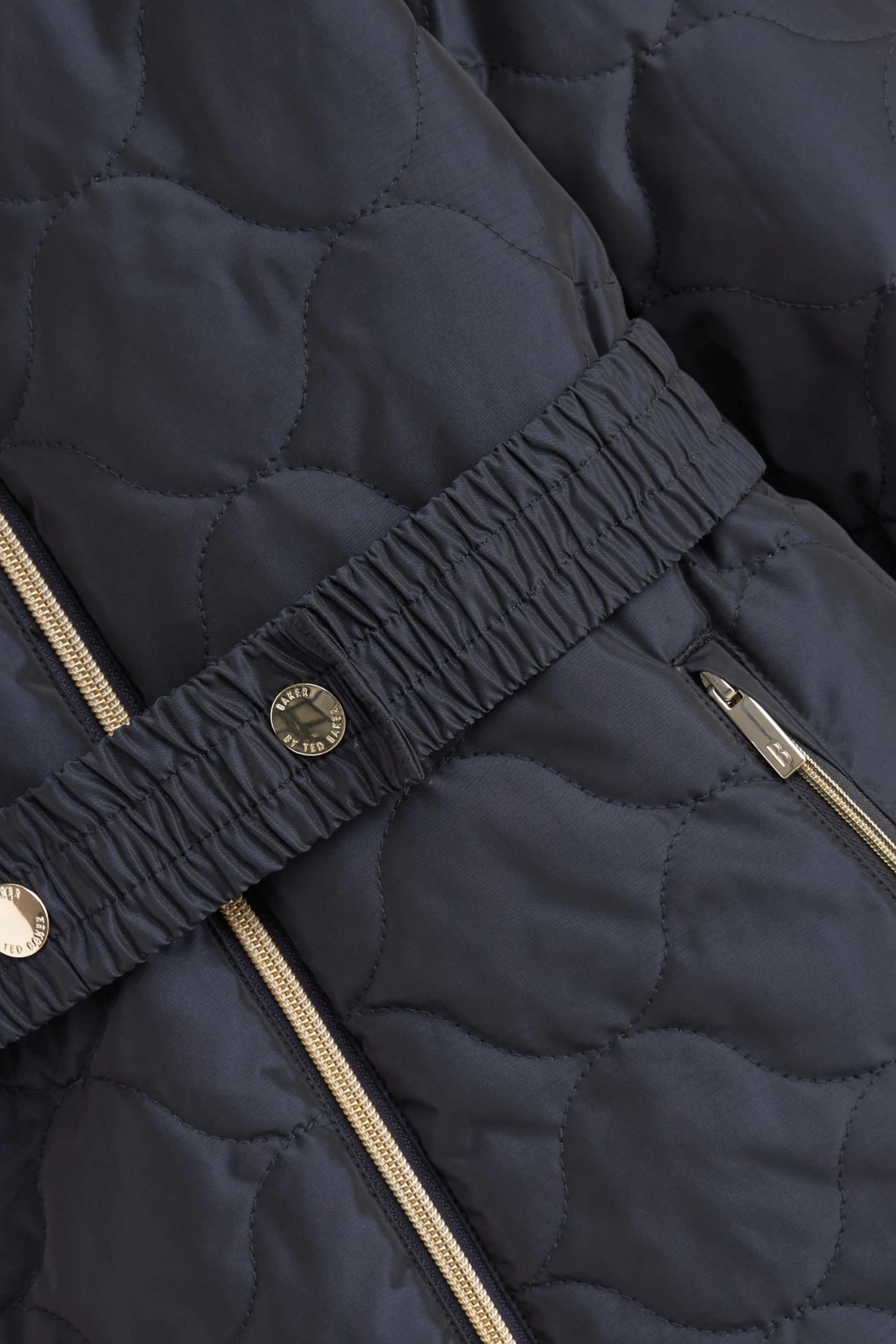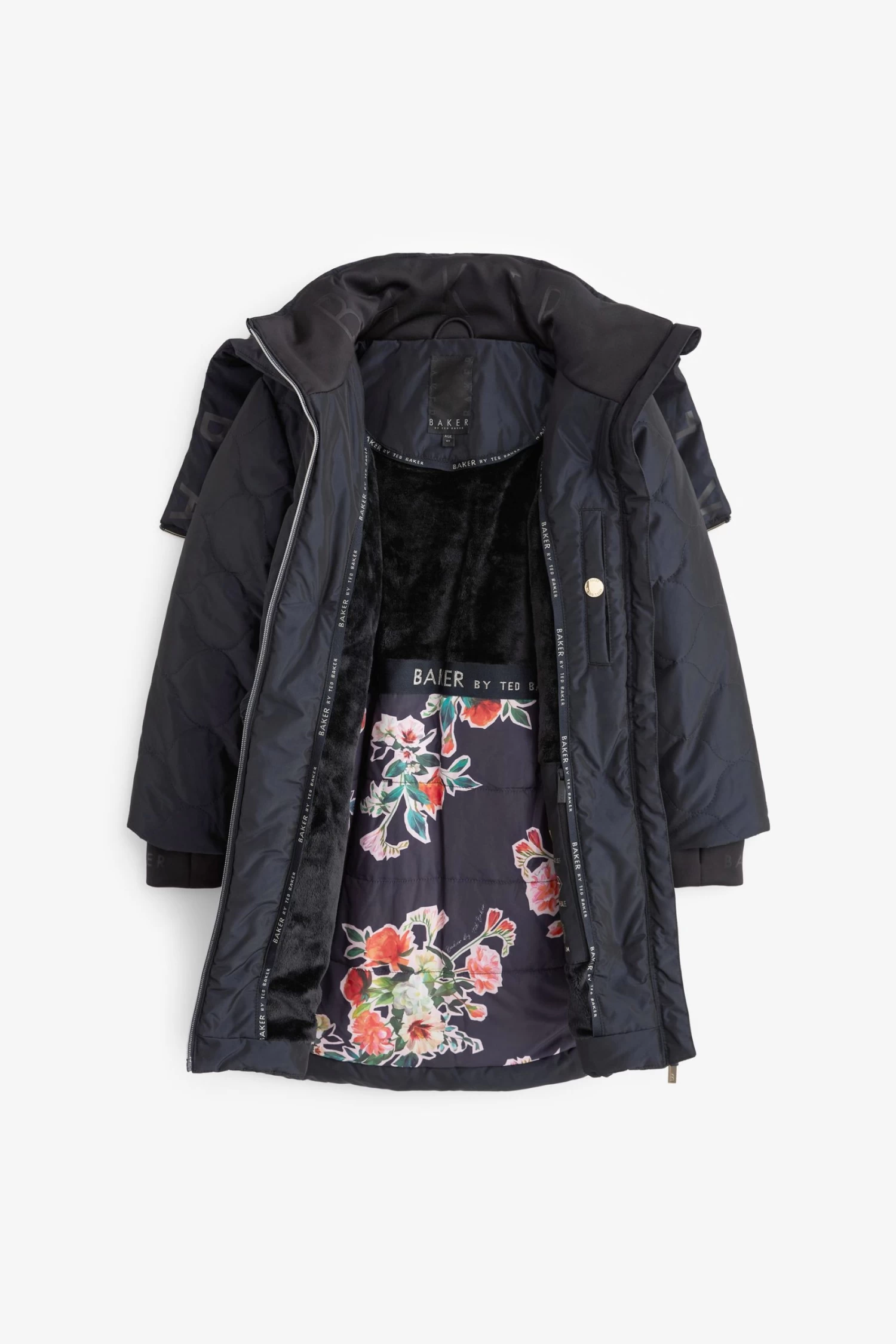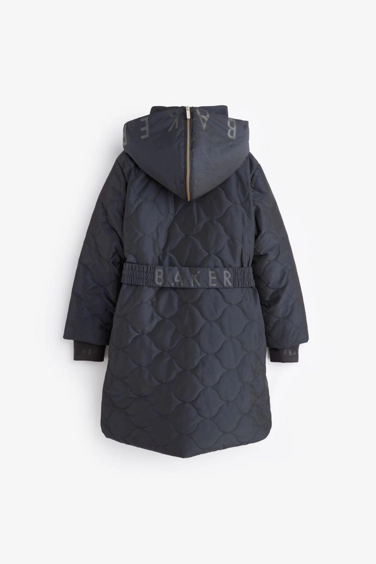 This quilted coat from Baker by Ted Baker is designed in their new luxe shower resistant fabric with faux fur body lining for extra warmth. Featuring printed lower lining, branded belt clasp, branded neoprene cuffs with thumb holes for extra warmth, branded faux fur split hood, cosy lined pockets, branded poppers at hem for extra leg room and gold coloured hardware detail.