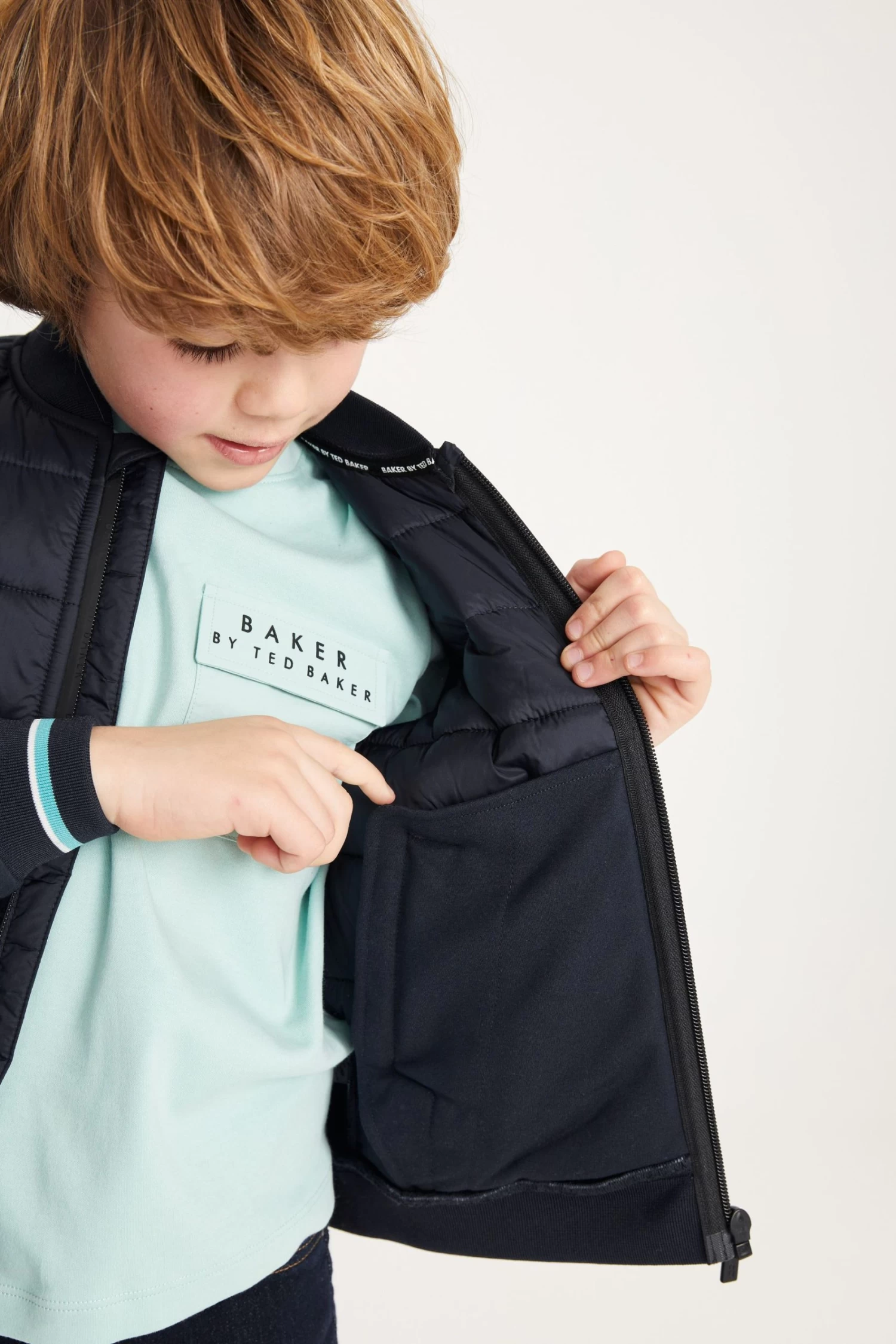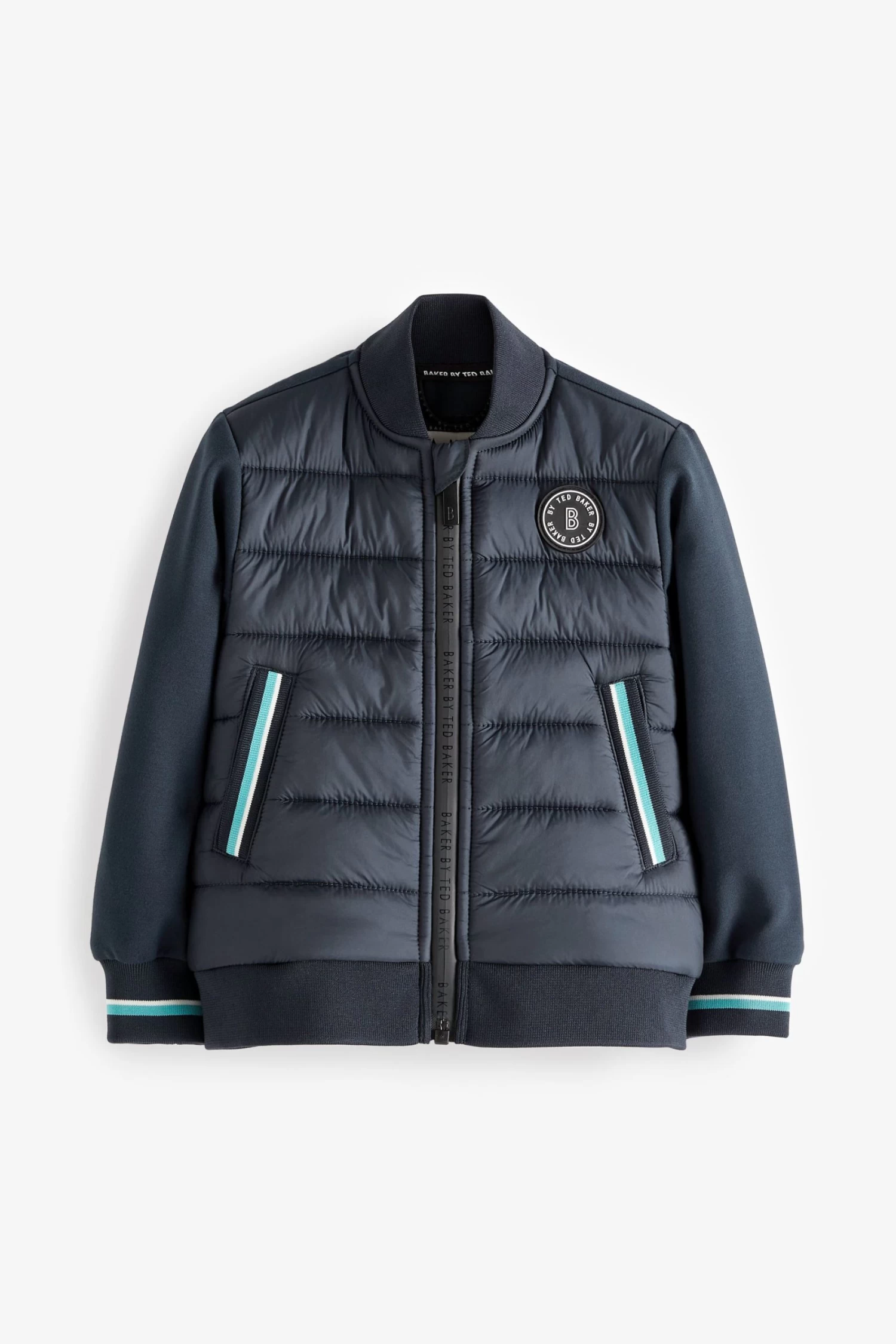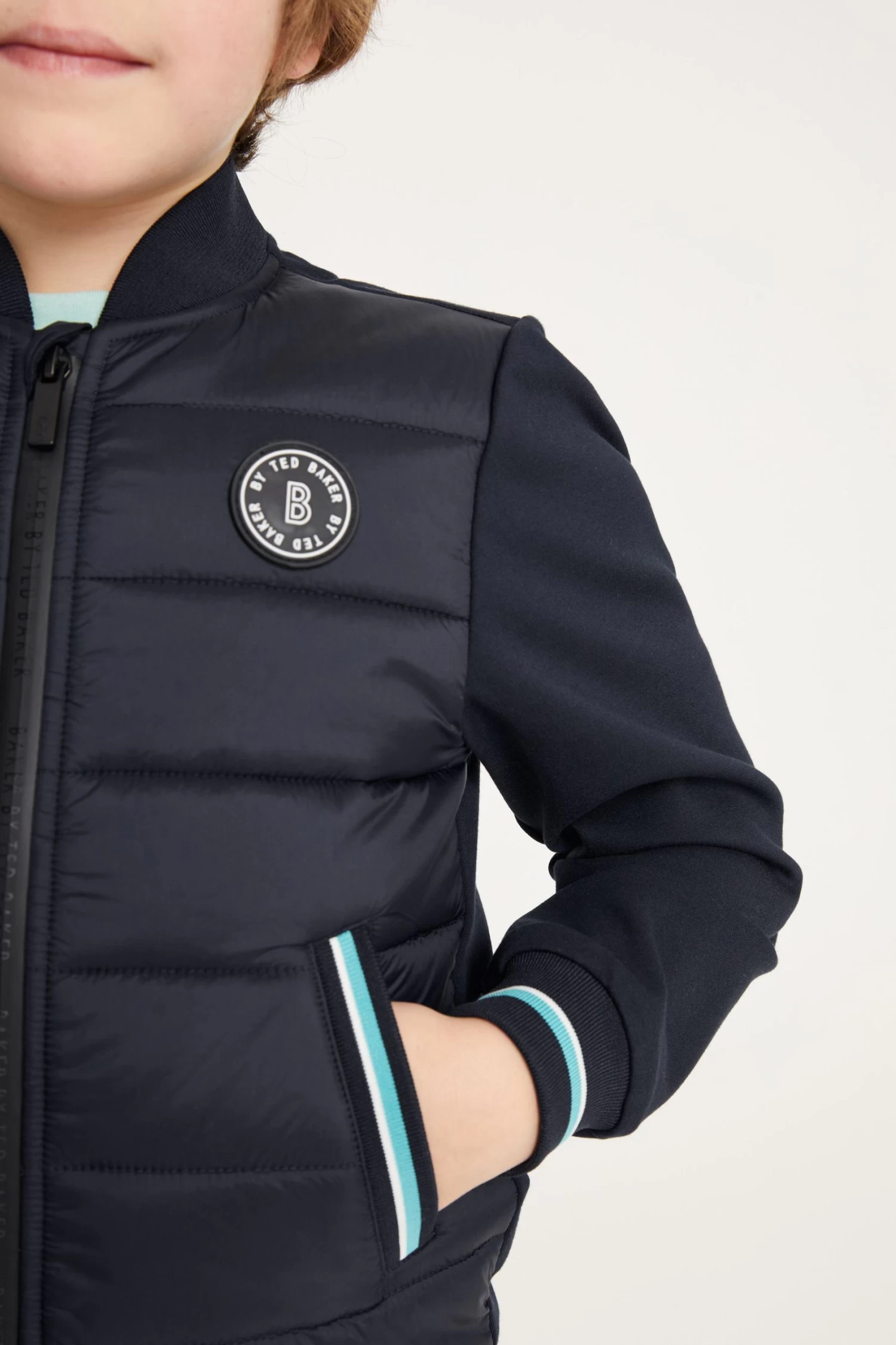 Wrap up your little boy in style with this sleek coat from Baker by Ted Baker. Padded for extra warmth, the navy jacket has sleeves made from a contrasting material and features a branded chest badge, blue edged pockets and cuff details and a zip fastening down the front.