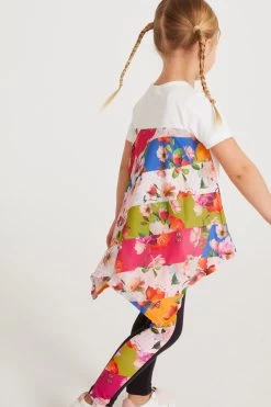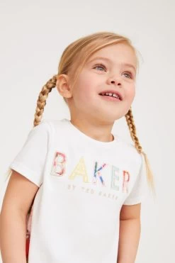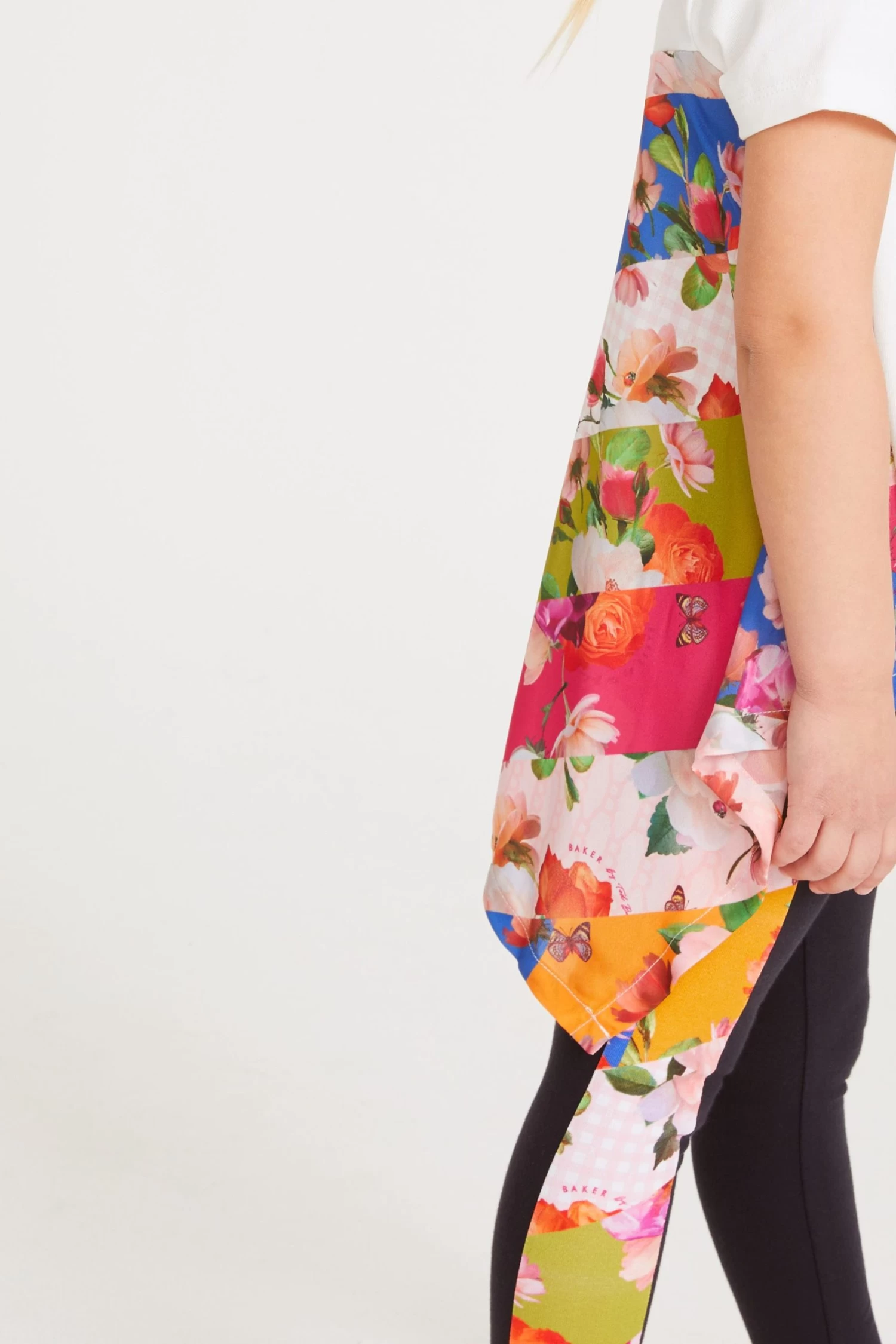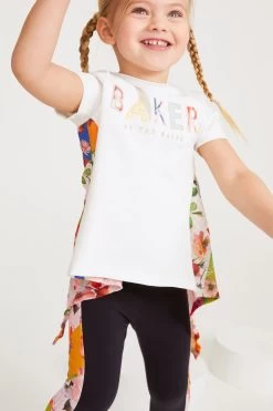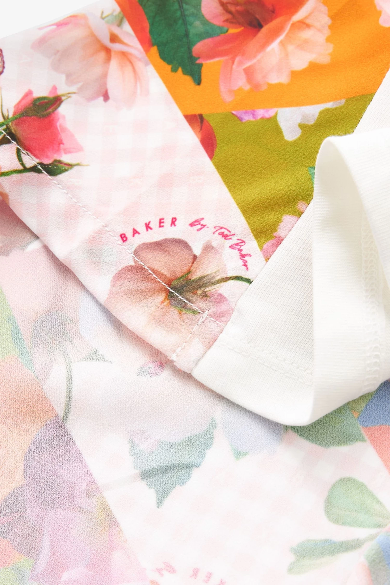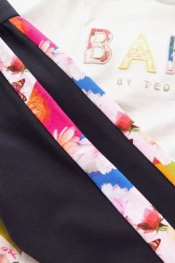 A gorgeous little outfit from Baker by Ted Baker to dress up your little lady in style. The two piece set includes a short sleeve t-shirt that boasts the iconic branding appliquéd across the front with a flowing chiffon hanky back detail in a bold floral print and it comes with a pair of navy leggings that feature panels down each leg in the same floral fabric with a branded Baker waistband.