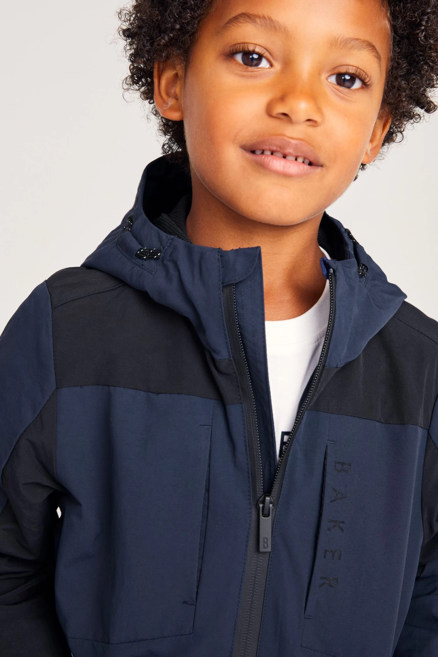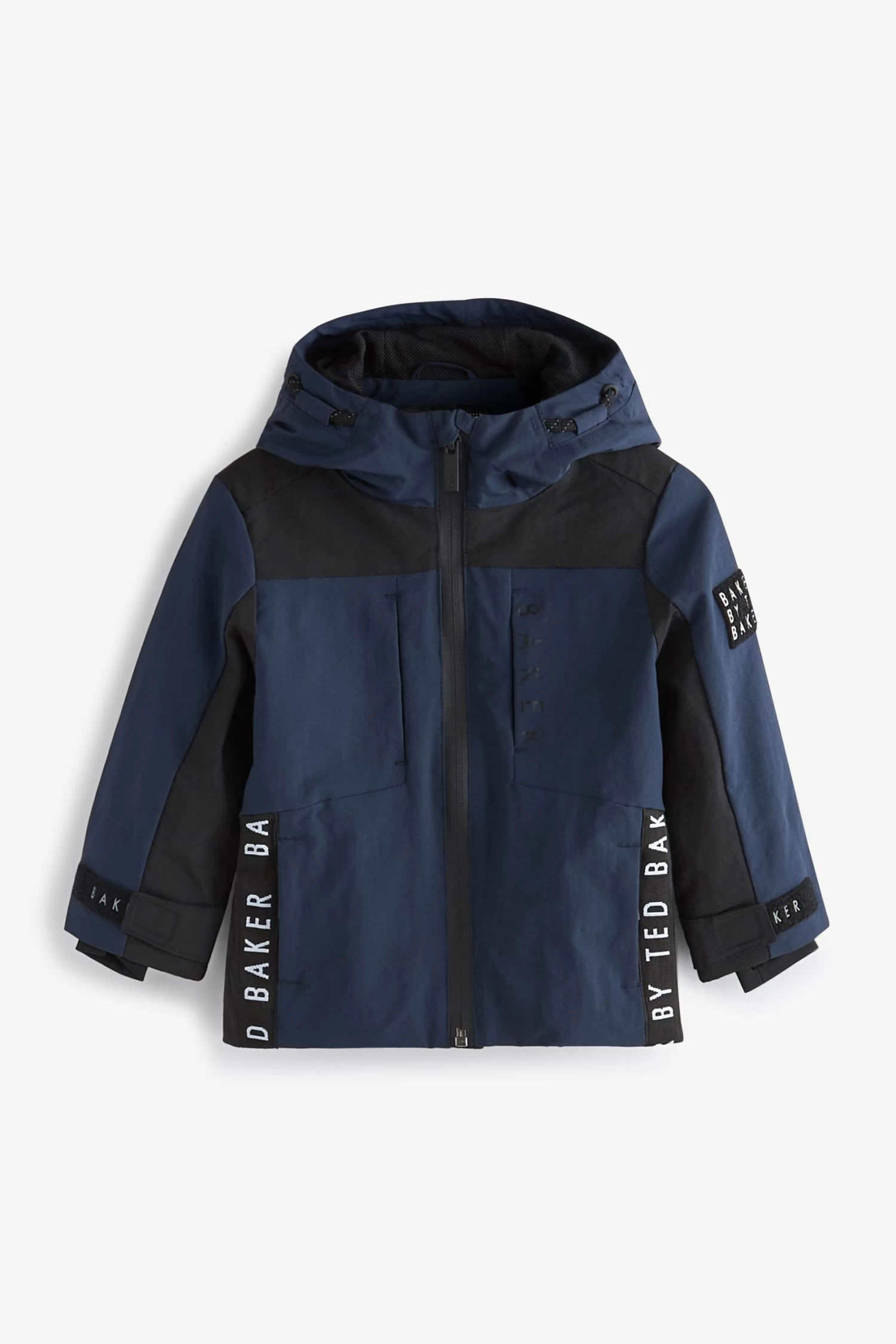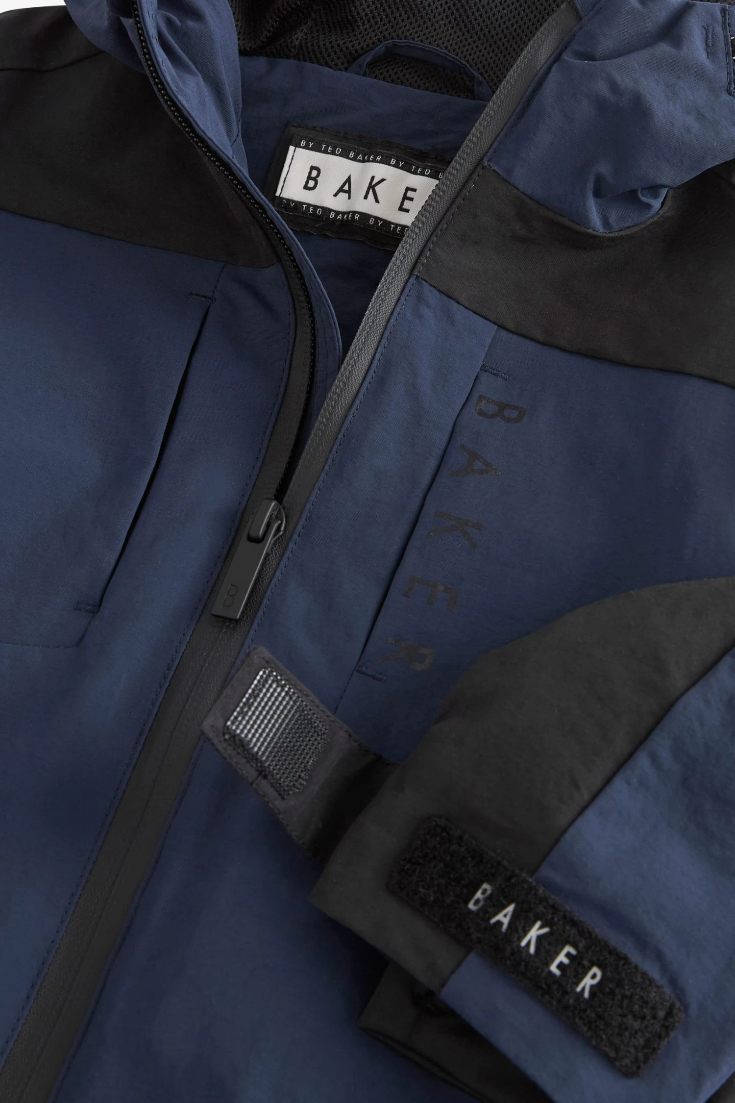 This navy colourblock jacket from Baker by Ted Baker is designed in a windproof, shower resistant fabric that is breathable and lightweight. Featuring internal pockets, branded zip, touch and close arm fastening, branded arm badge and cool branded tape detail.