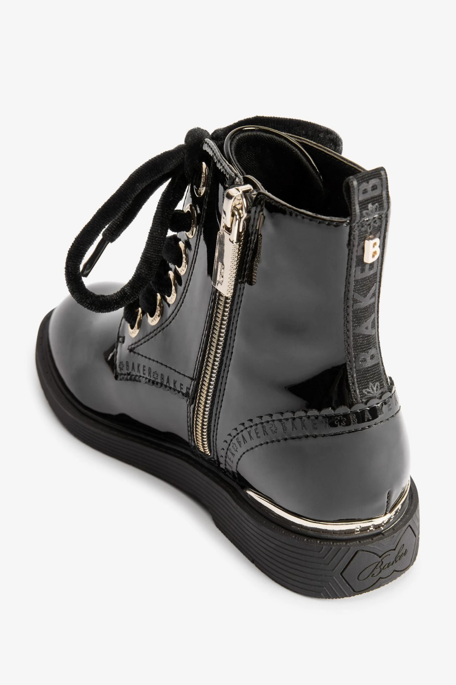 These black patent lace-up boots from Baker by Ted Baker have a side zip for easy dressing. Featuring gold metal hardware for a luxe look and branded zipper, eyelets and heel clip. Fashionable chunky and durable soles keep them comfy all day. With branded scallop brogue detailing and back tape. These wear on repeat favourites have gorgeous velvet laces for an elevated appearance.