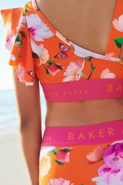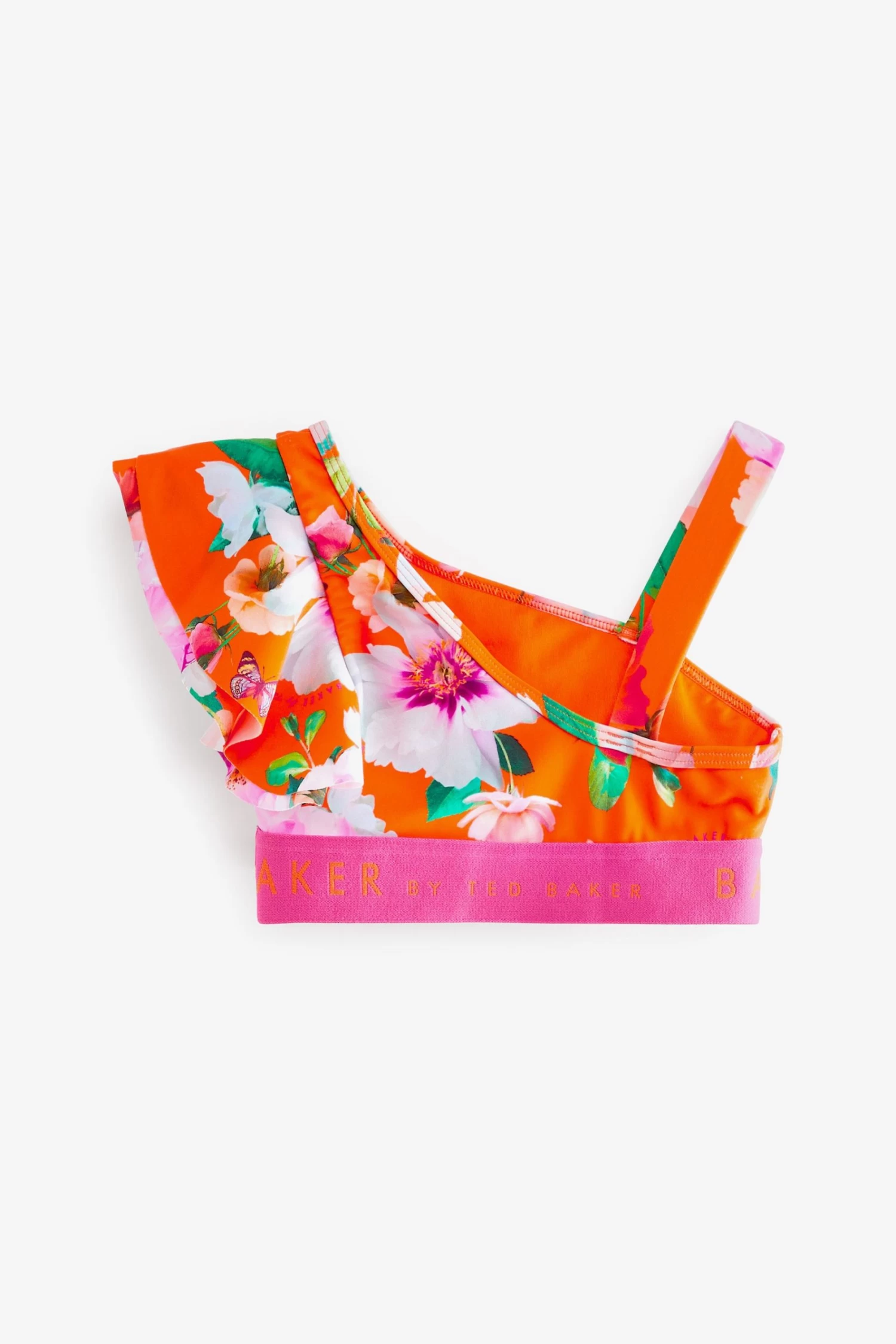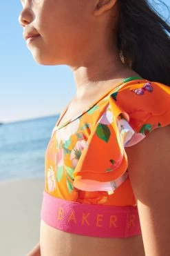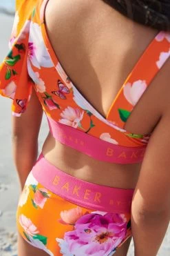 This fun and fabulous bikini from Baker by Ted Baker will be a key piece in her summer wardrobe. Made from a lightweight nylon, the two piece set boasts a bold orange base with a tropical floral print over the top and the two piece set includes a cute bikini top with a ruffle shoulder detail that comes with a matching pair of bottoms and each piece has a branded elasticated band.