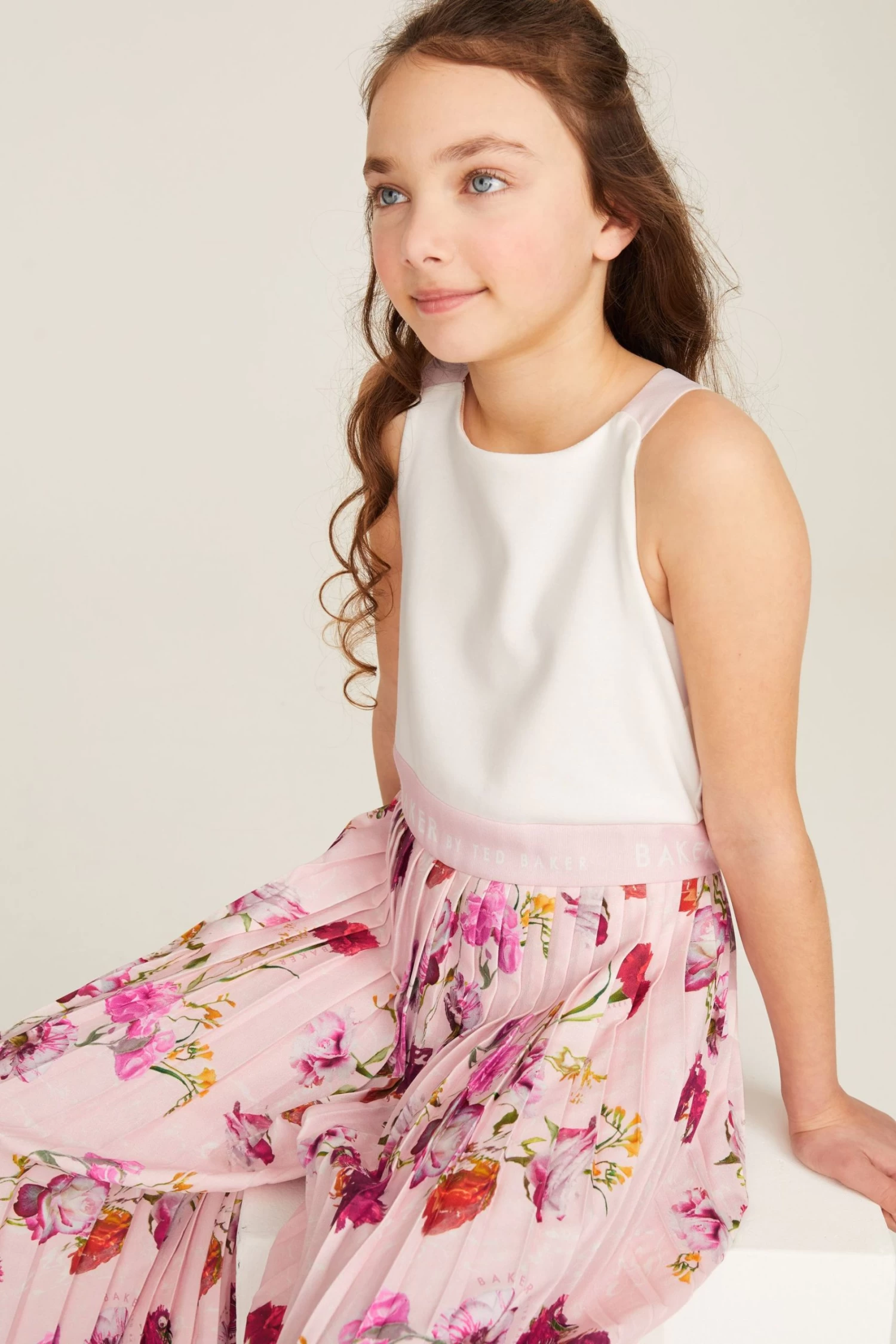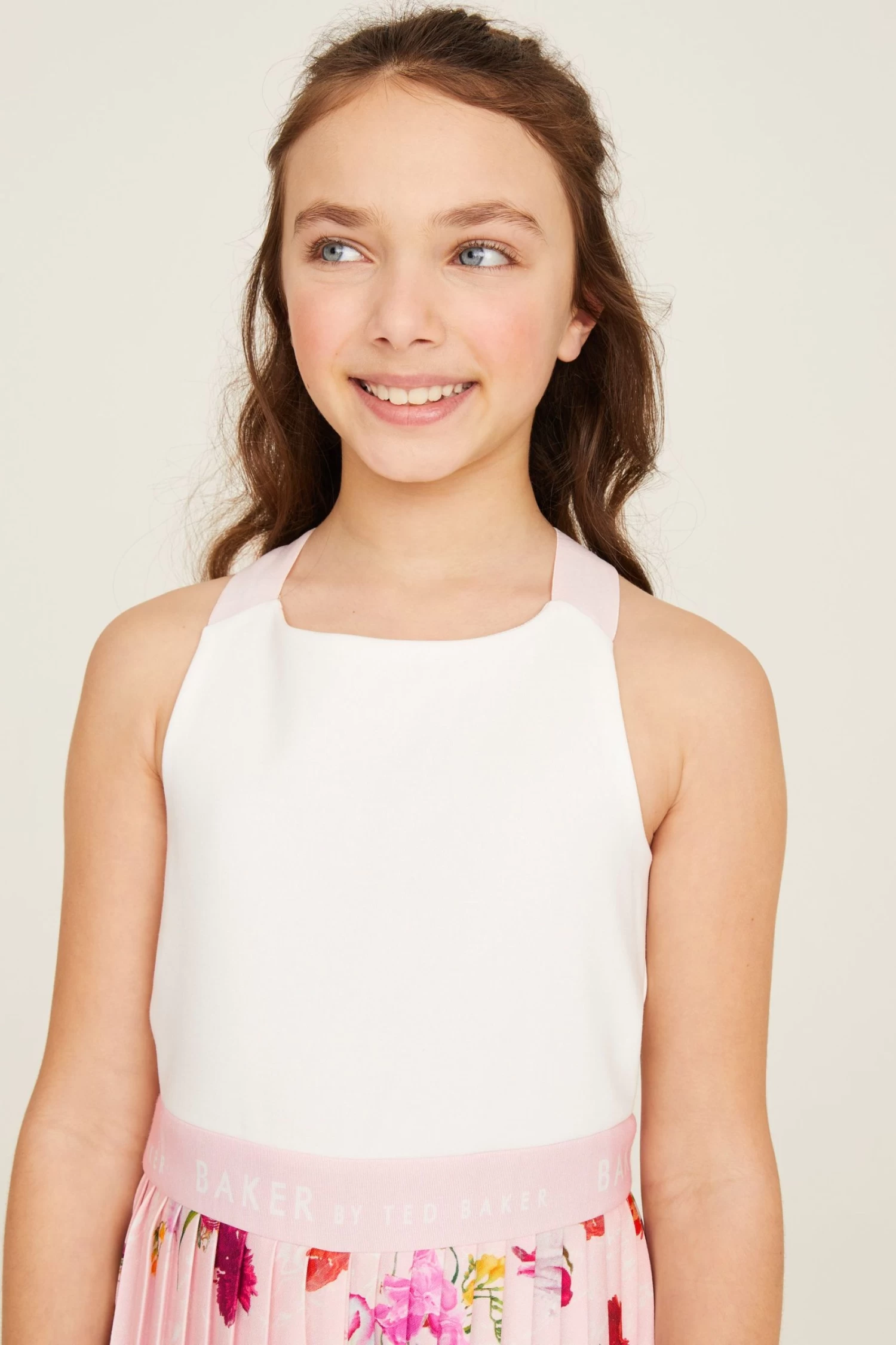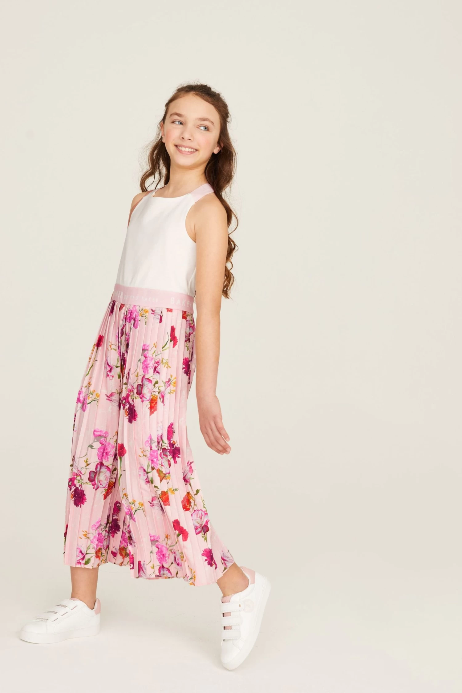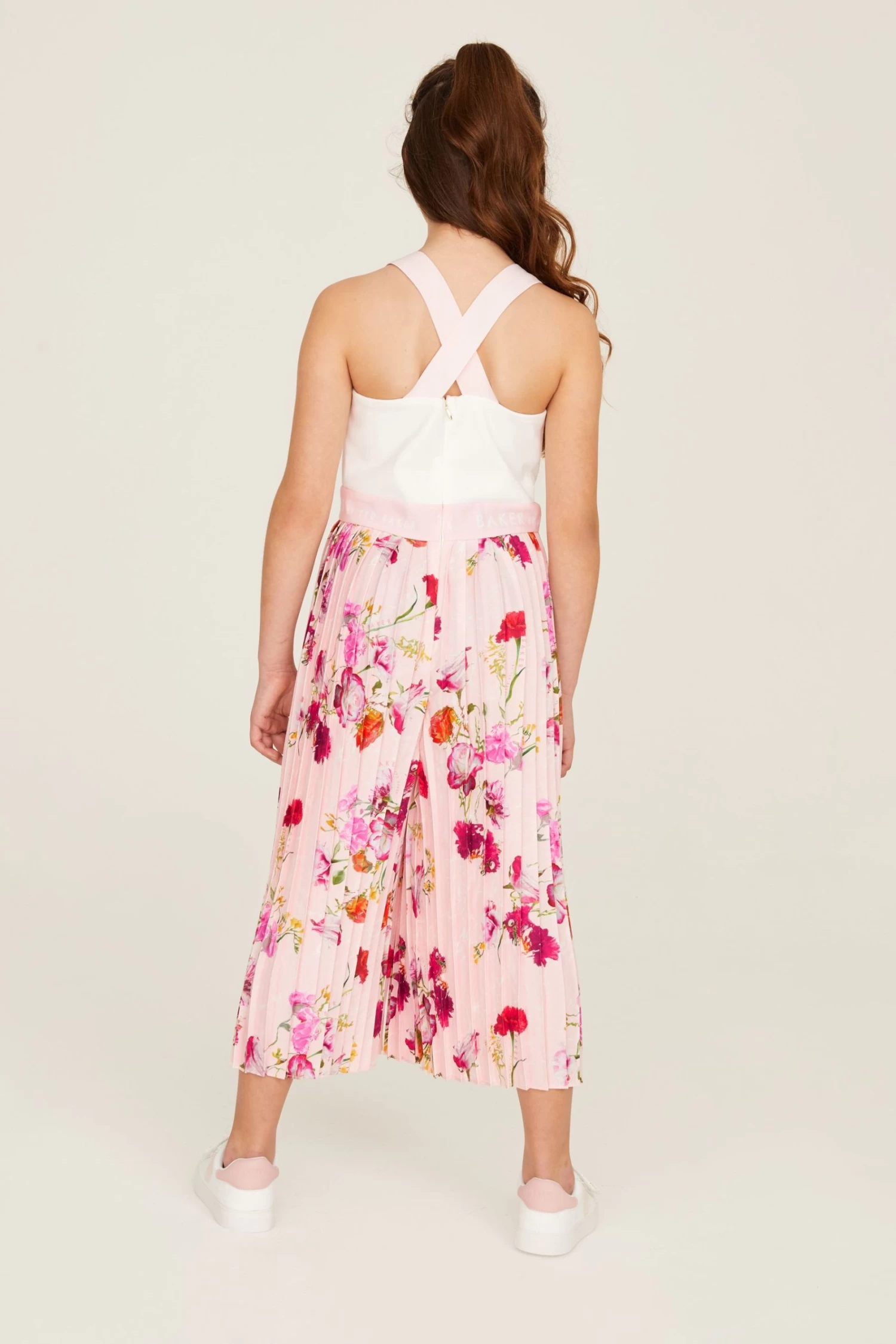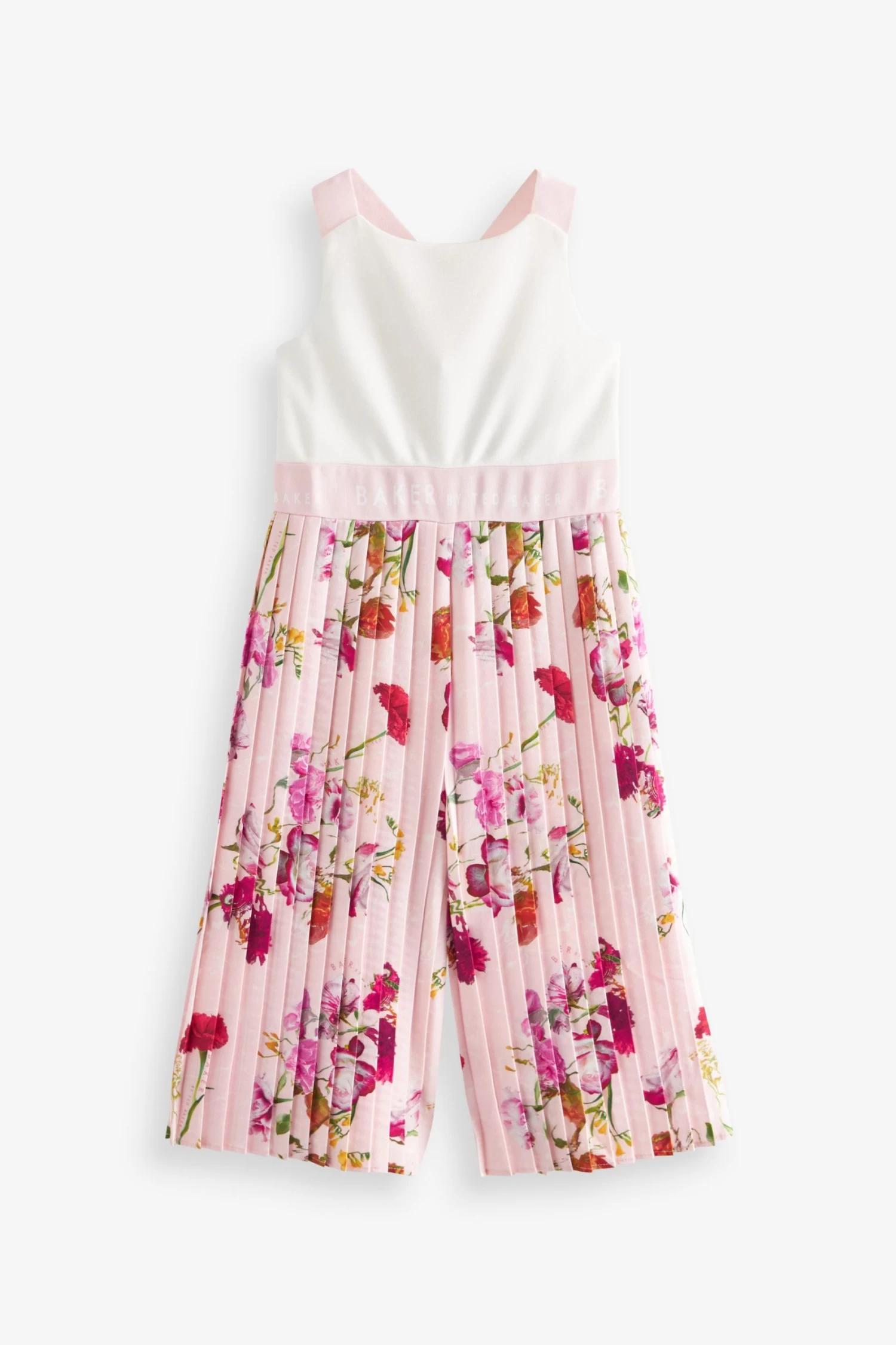 Nail her summer wardrobe with this stunning statement jumpsuit from Baker by Ted Baker. Boasting pretty plissé trousers with a bold floral print all over them on a pale pink base, the beautiful all-in-one is further complemented with a classic white bodice that has crossover straps at the back and a gently elasticated waistband for the perfect fit throughout the day. She will be cool and comfy all day long in this premium piece.
