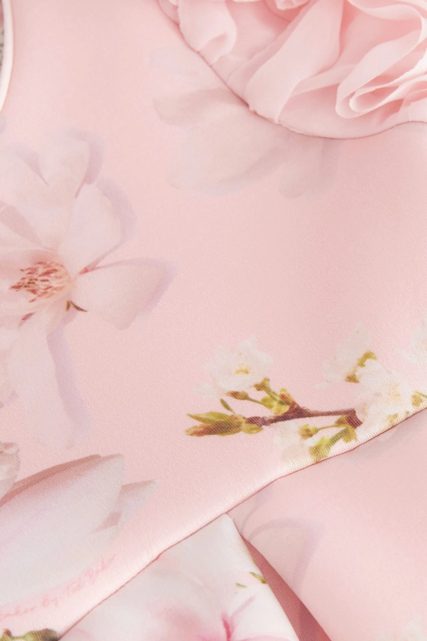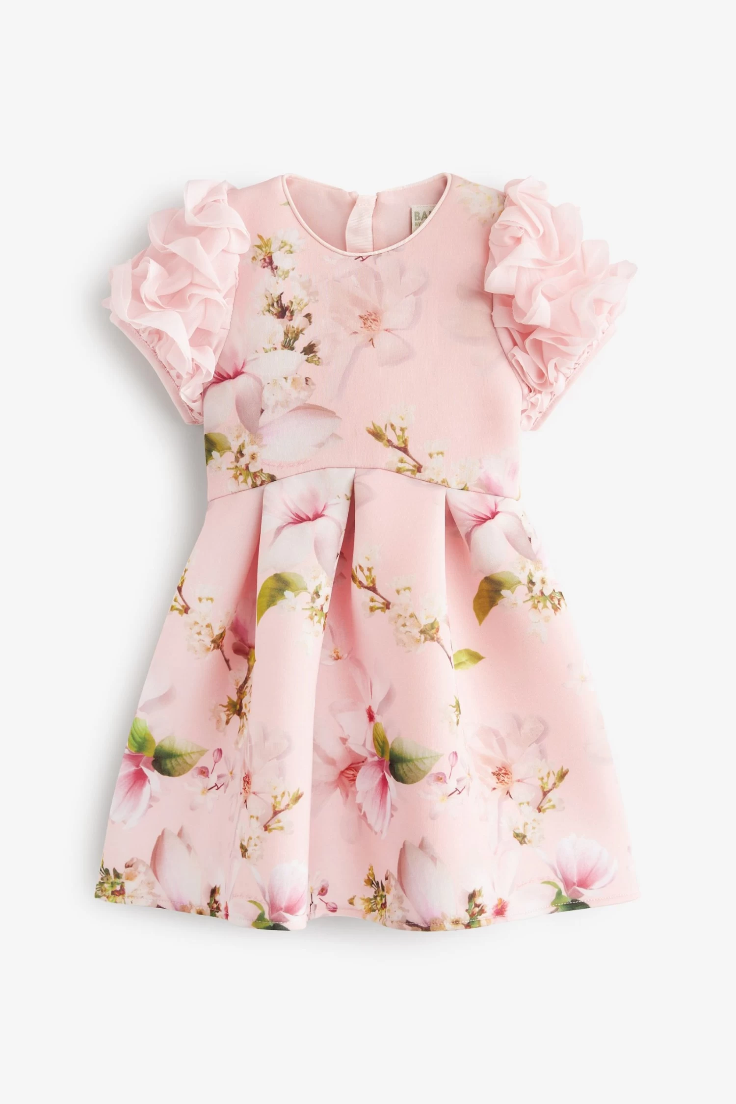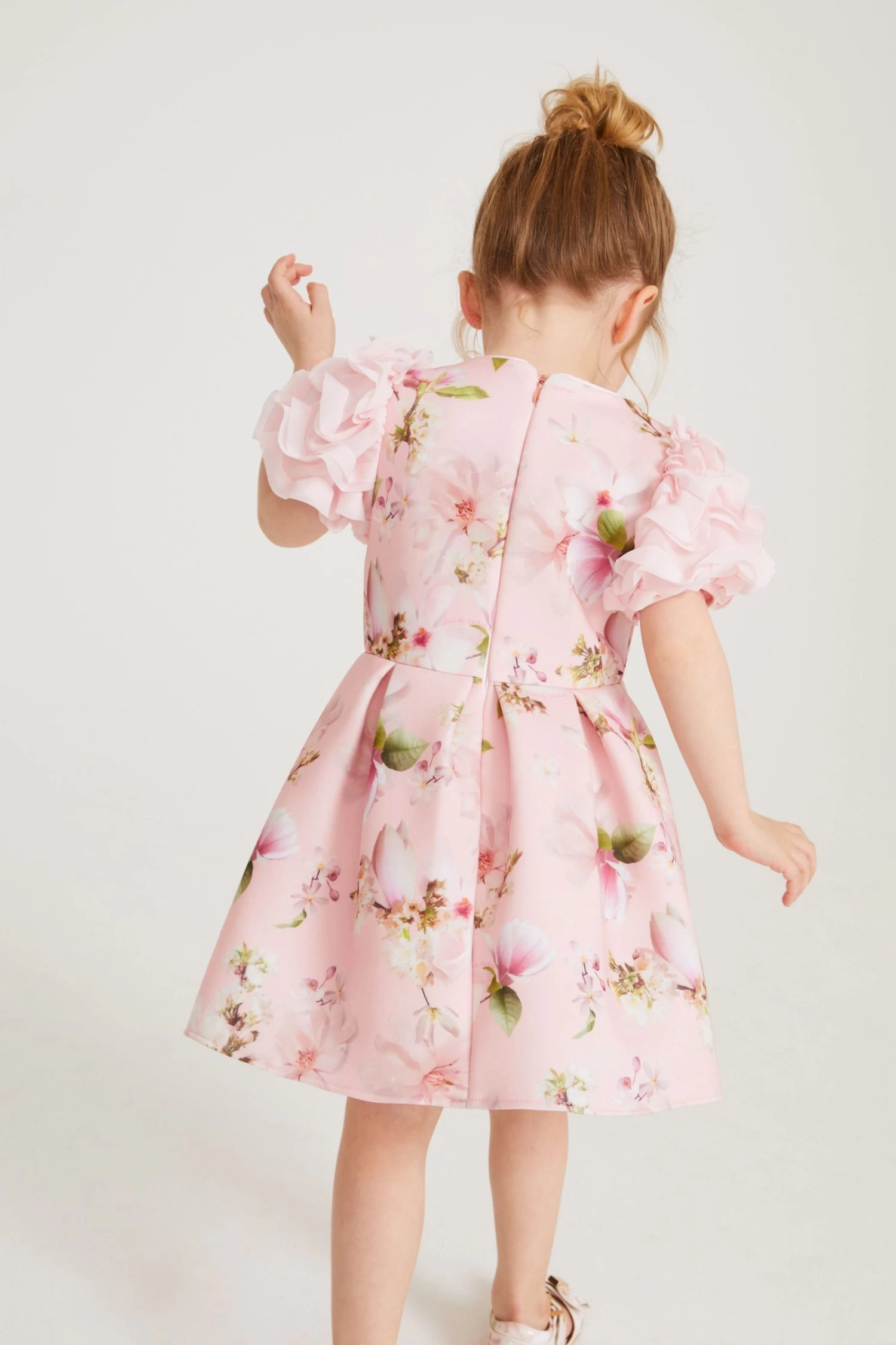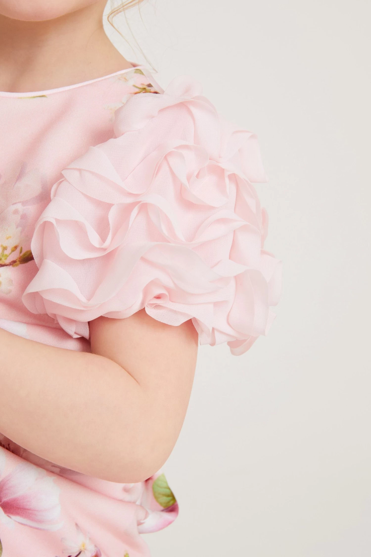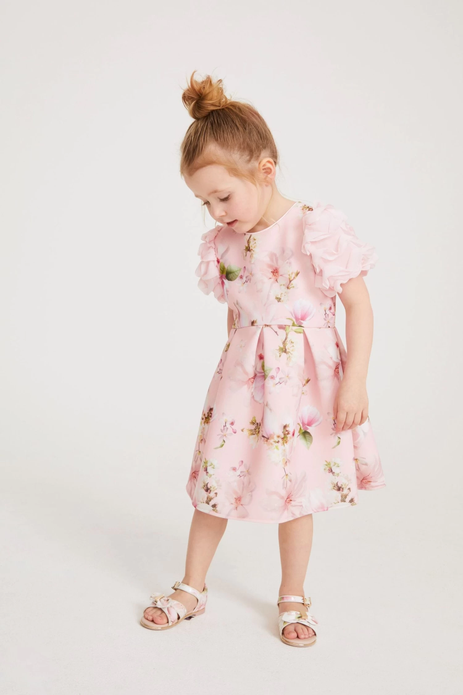 A charming dress made for your little girl from Baker by Ted Baker. Boasting a pretty all over floral print on a pale pink base, this adorable dress features a stunning mesh detail on the shoulders with a full skirt and a concealed zip fastening at the back. She will be the best dressed guest in this gorgeous piece.