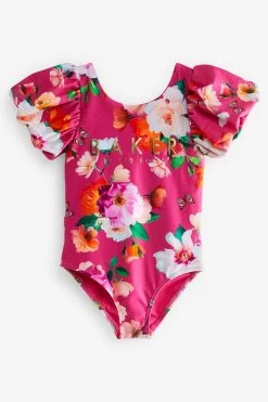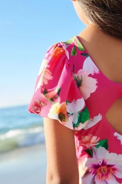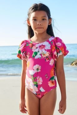 A gorgeous swimsuit for your little lady to enjoy from Baker by Ted Baker. The pretty pink one piece is decorated all over with the designer’s signature floral print and boasts puffball sleeves and a charming cut out detail on the back with a bow. It is finely finished with a gold foil logo printed across the chest.