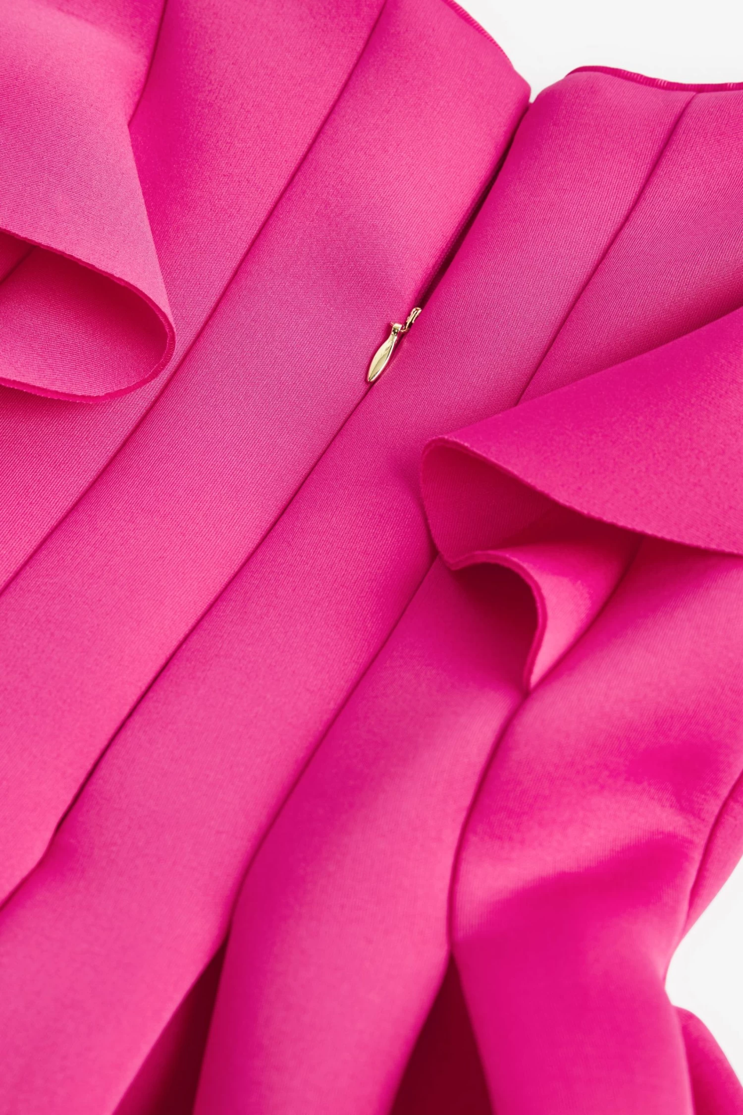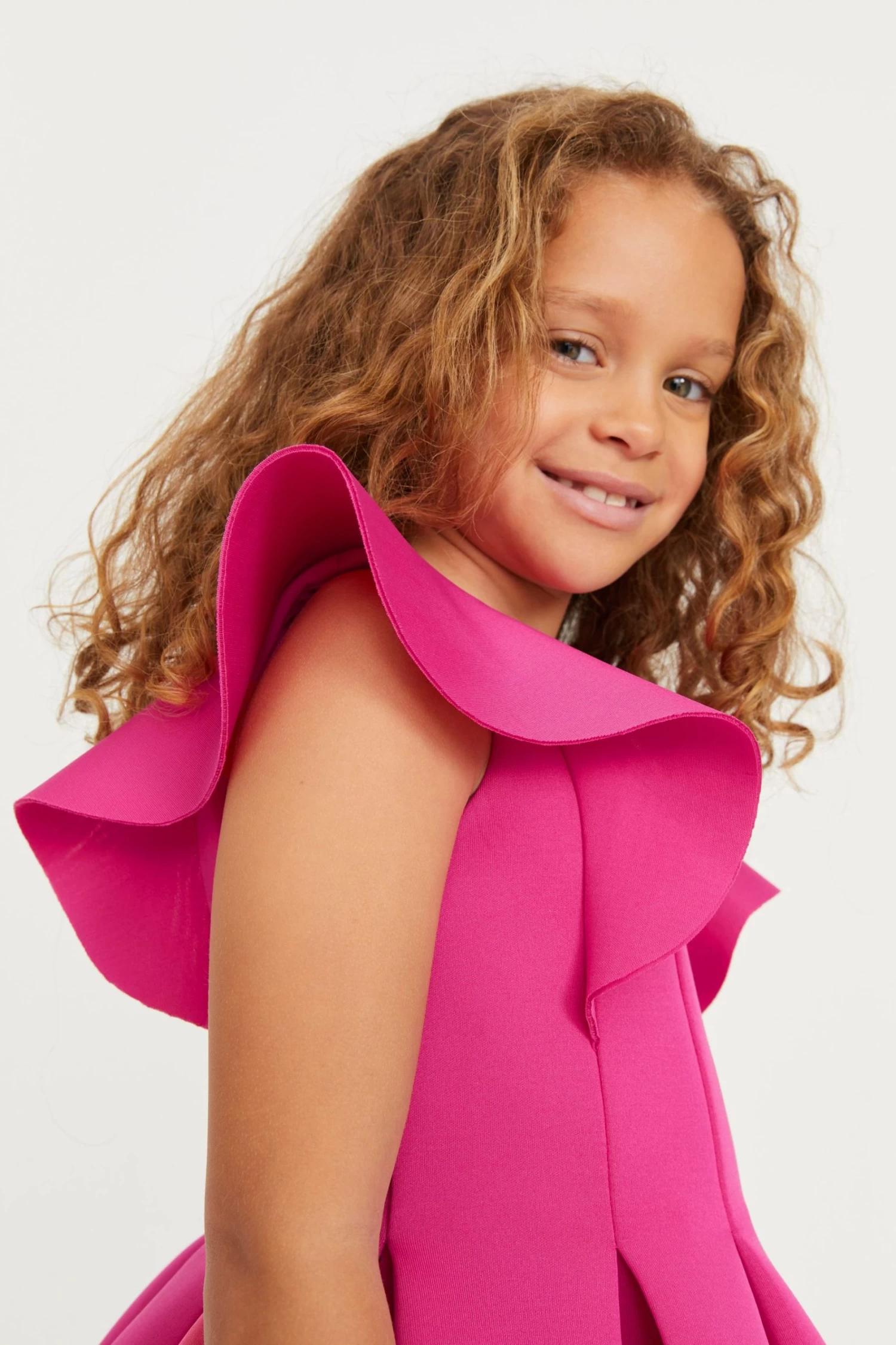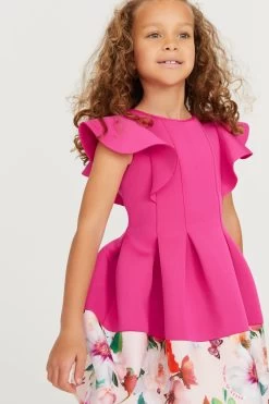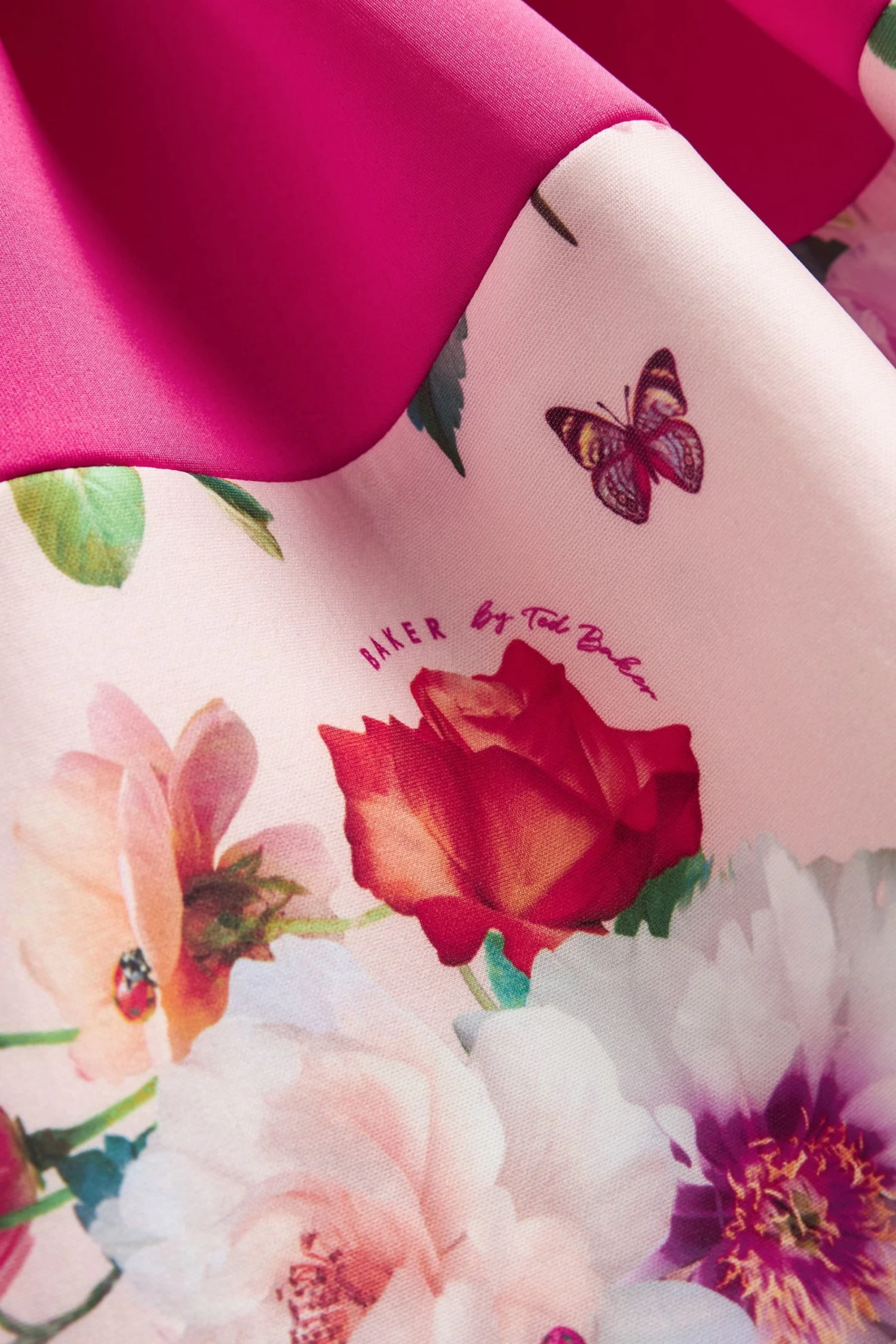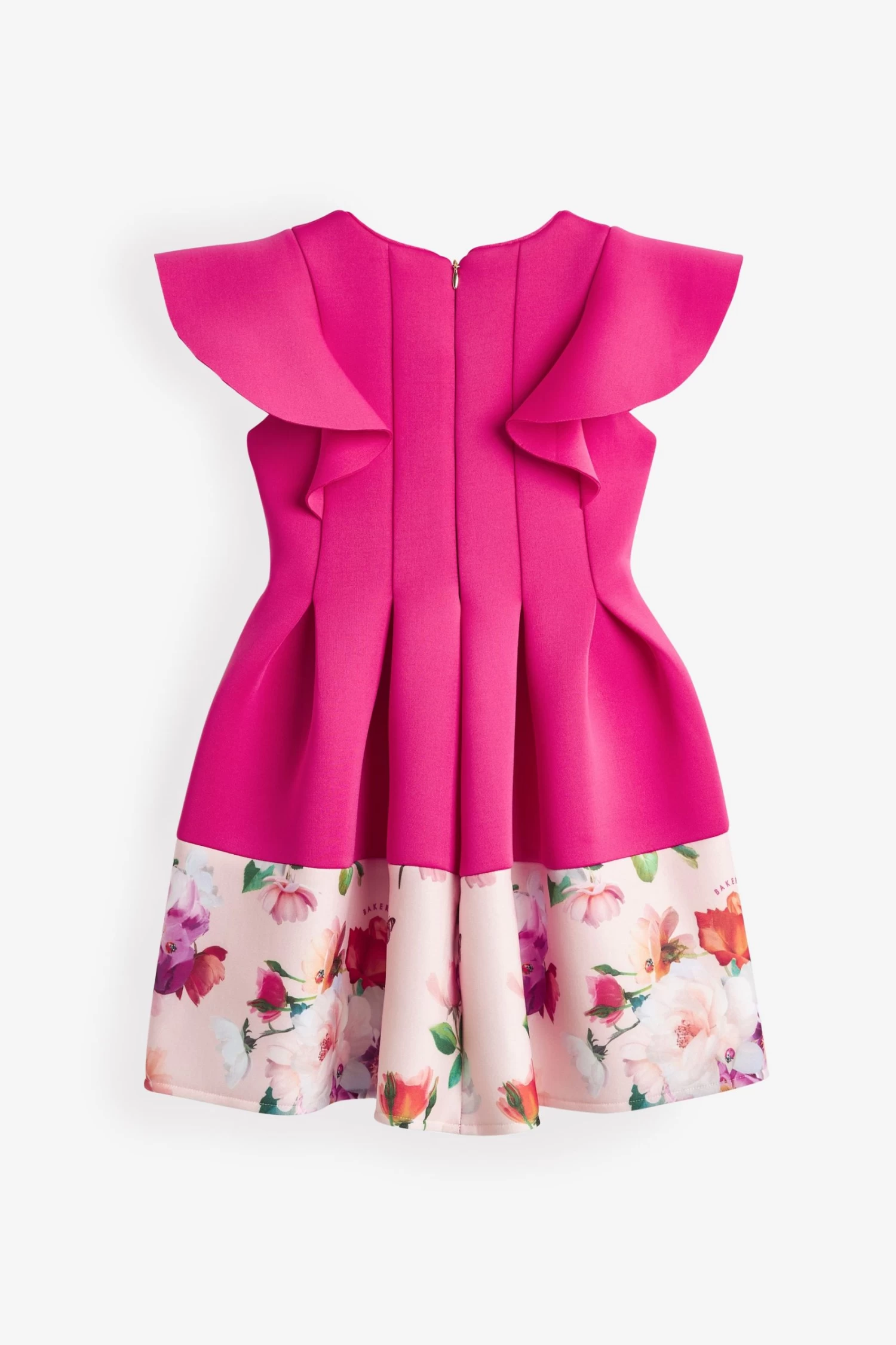 A gorgeous dress from Baker by Ted Baker your little girl will adore wearing. Finished in a glorious shade of pink and made with a scuba fabric, this dress that is perfect for all of her special events boasts a full skirt with pleats and a floral panel on the hem along with frilled shoulders and a concealed zip fastening at the back.