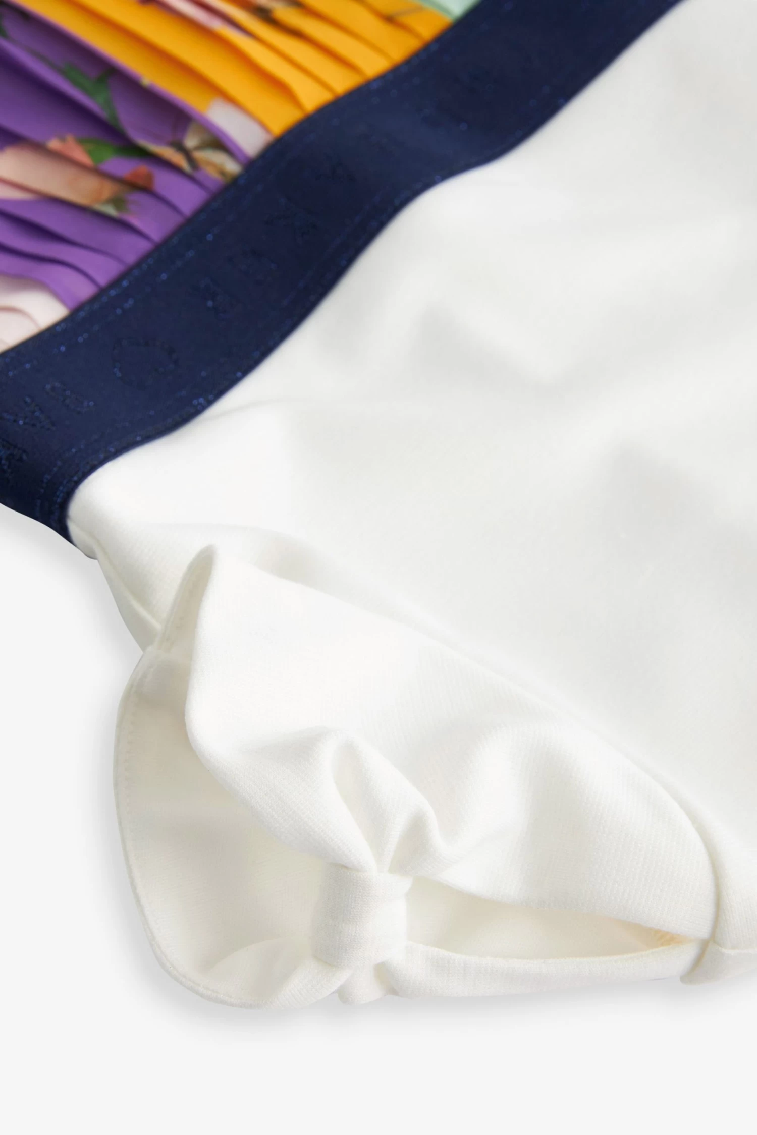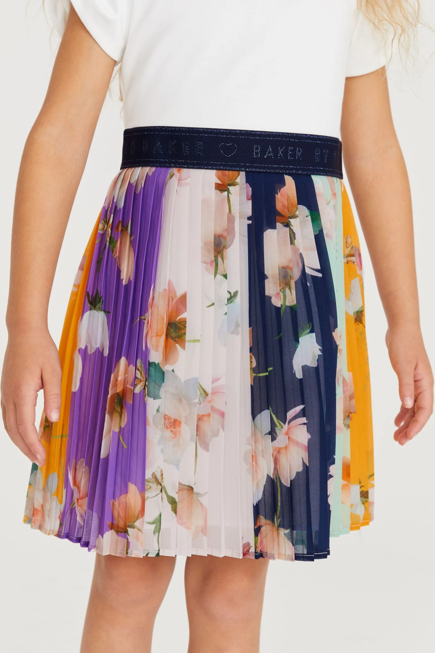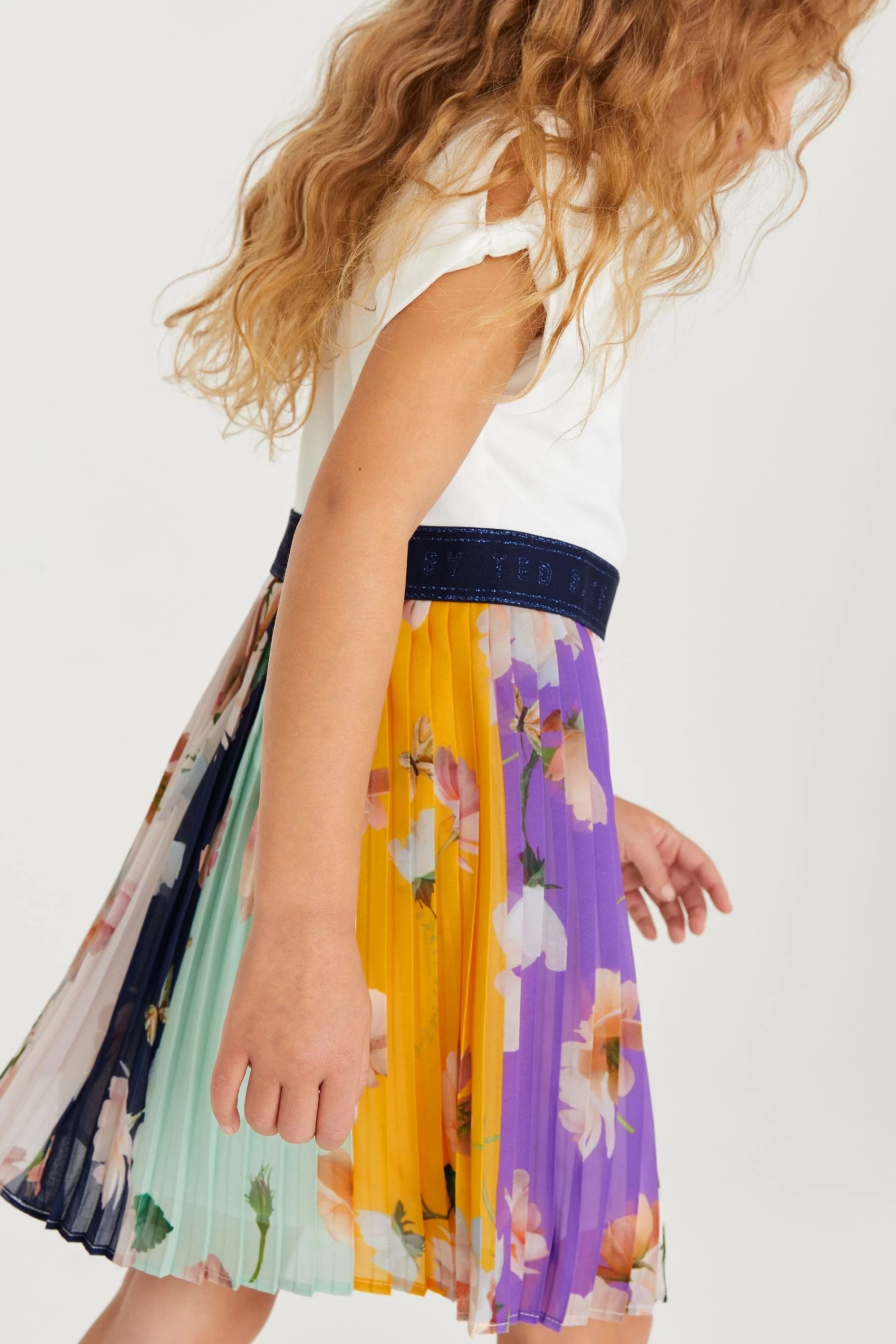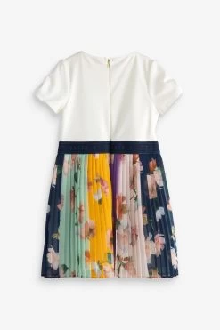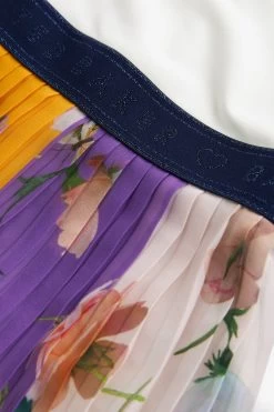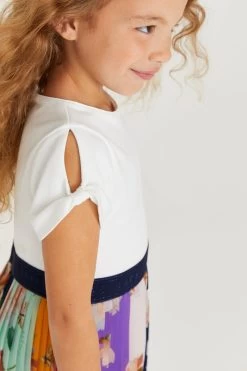 Enjoy dressing up your little lady in this adorable dress from Baker by Ted Baker. The mockable piece has a classic t-shirt top half with knot detailing on the sleeves and a hidden zip fastening at the back and is contrasted with a bold colourful pleated skirt. Perfect for parties, this charming outfit is finely finished with a shimmery branded waistband through the middle.