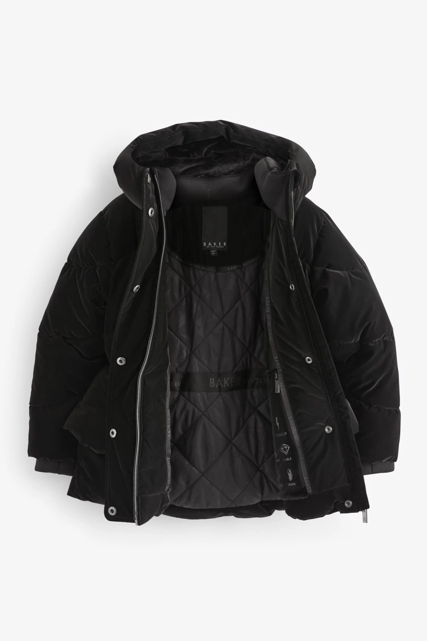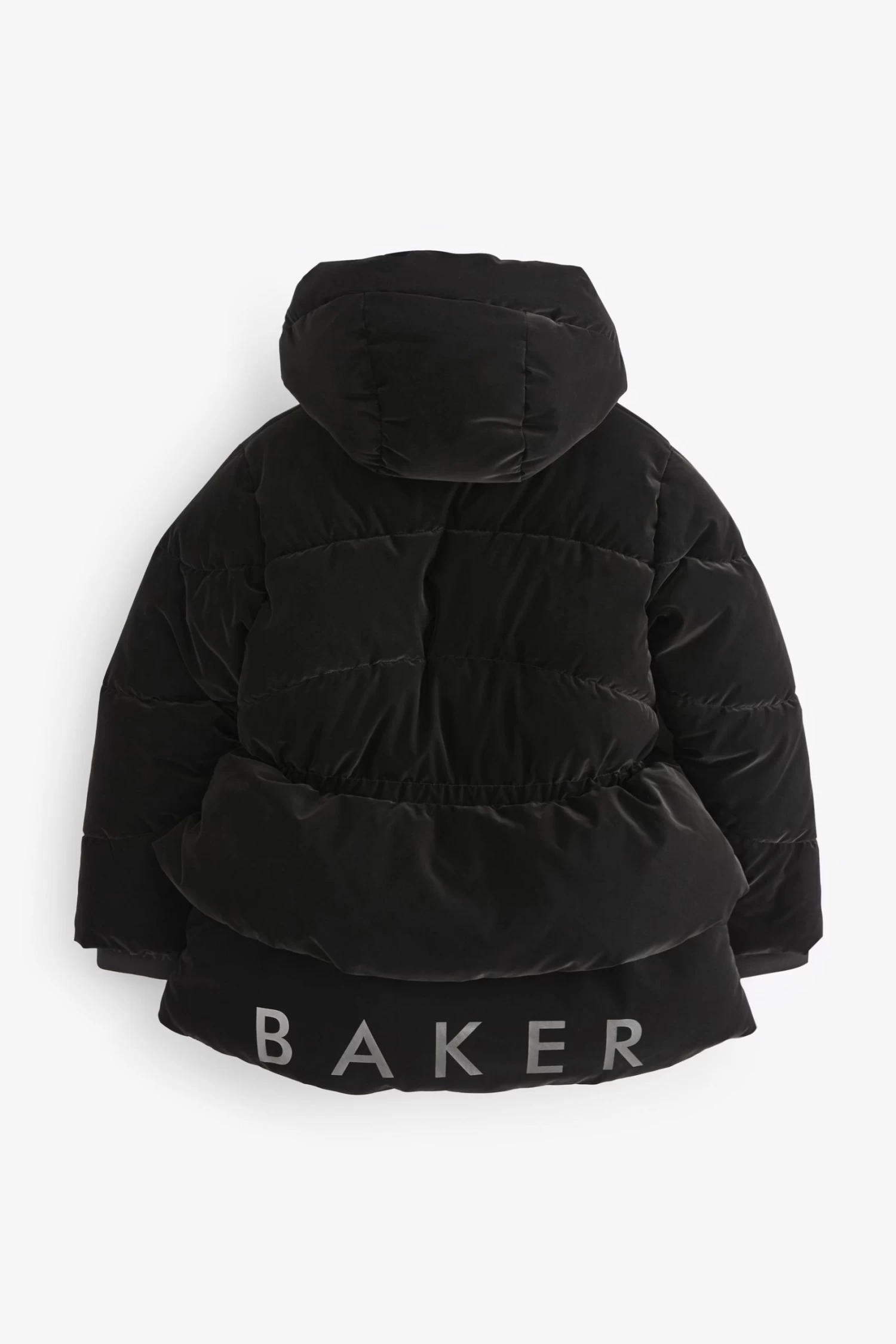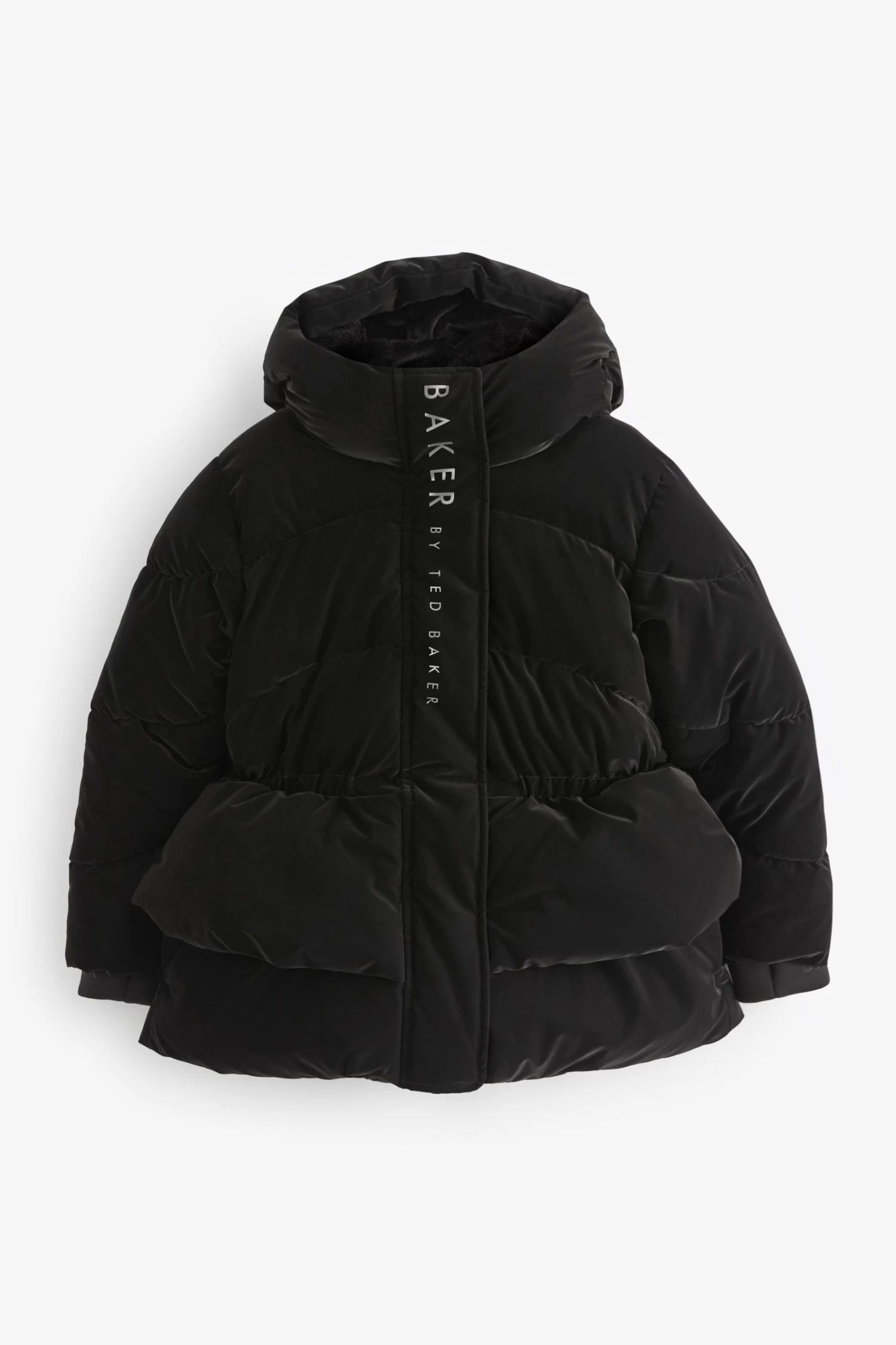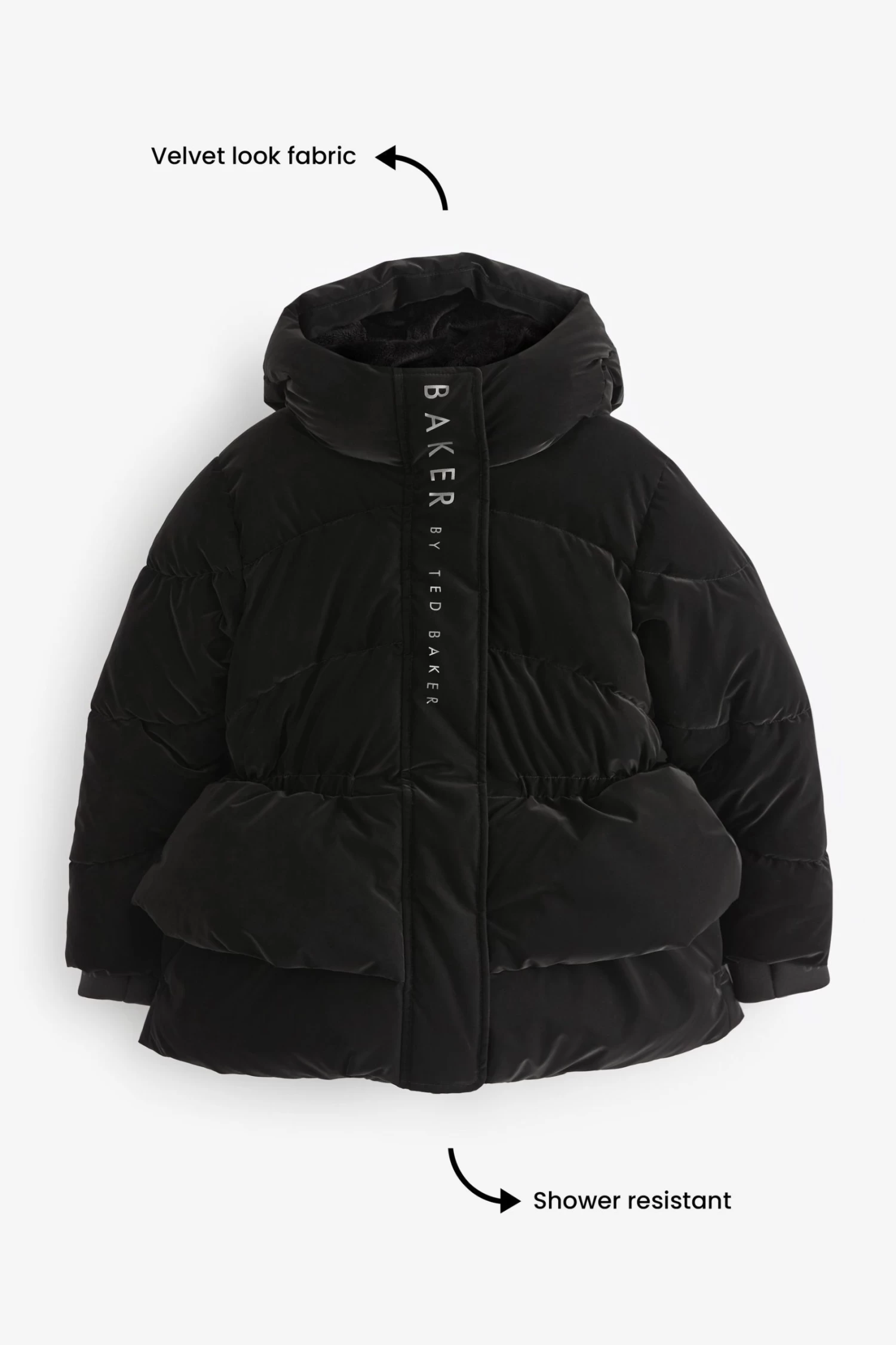 Keep out the cold in style with this classic coat designed for your little one from Baker by Ted Baker. Boasting a soft velvety outer with a sleek peplum detail on the waist, this charming coat is also fully waterproof to protect her from the elements and padded for extra warmth. It is secured with a traditional zip fastening that features a branded zip and all the hardware has a stylish grey gunmetal finish. A cosy hood completes this fashionable and functional piece that will be a lovely addition to her wardrobe.