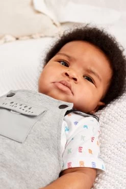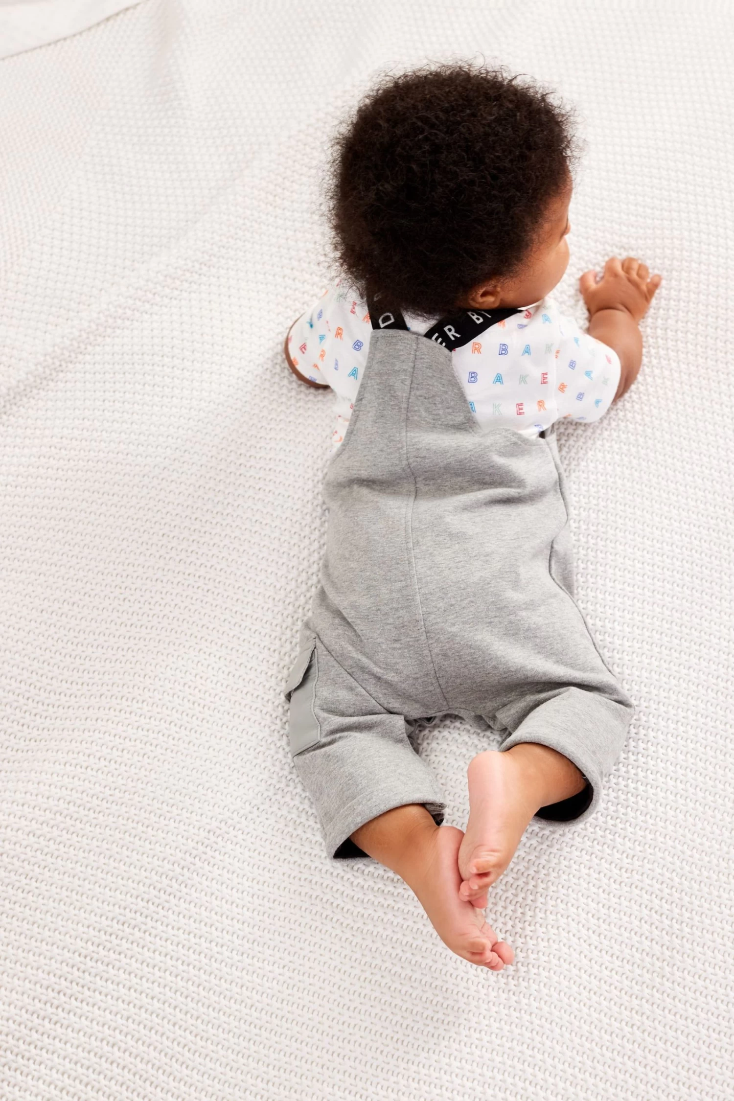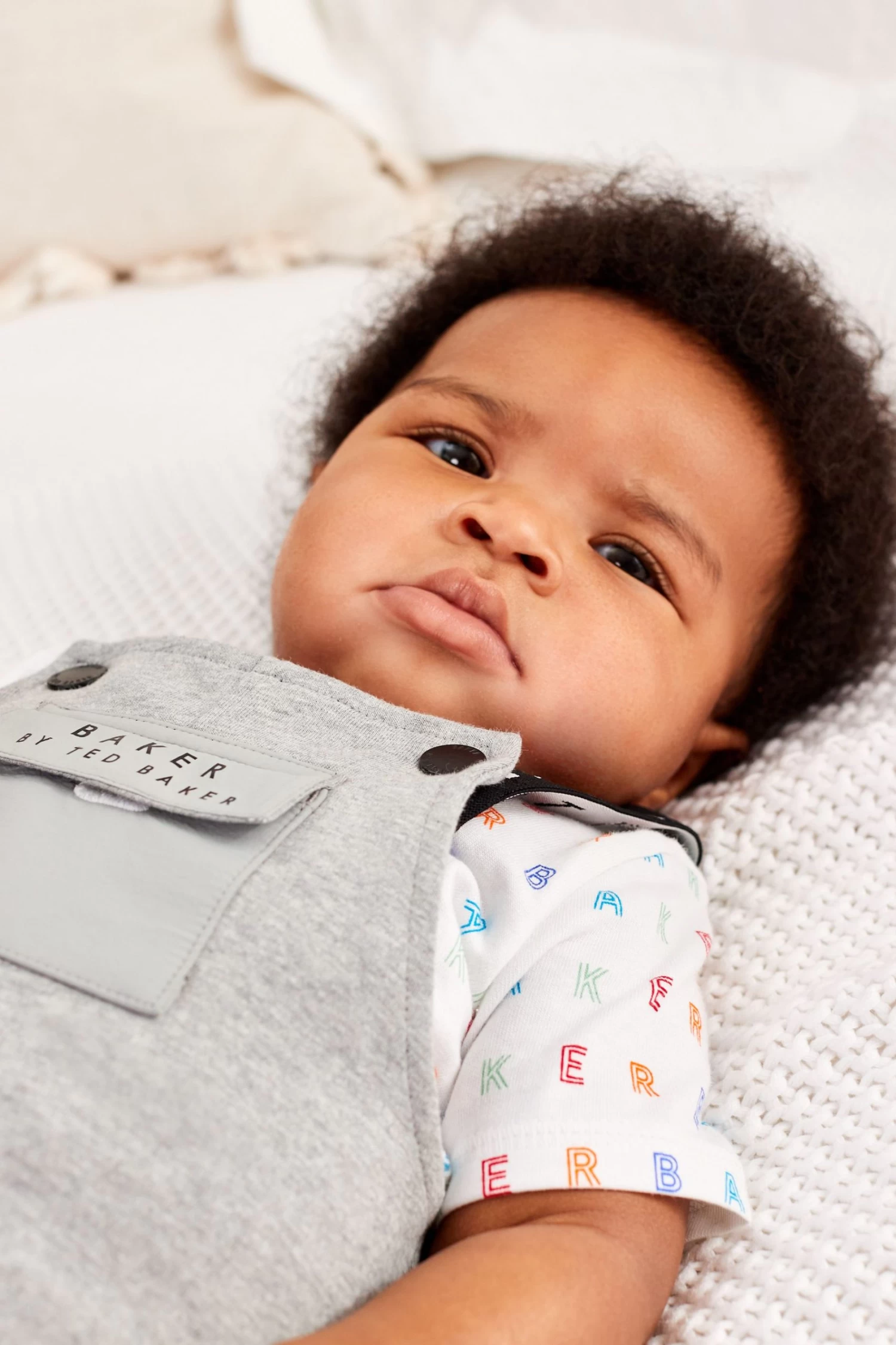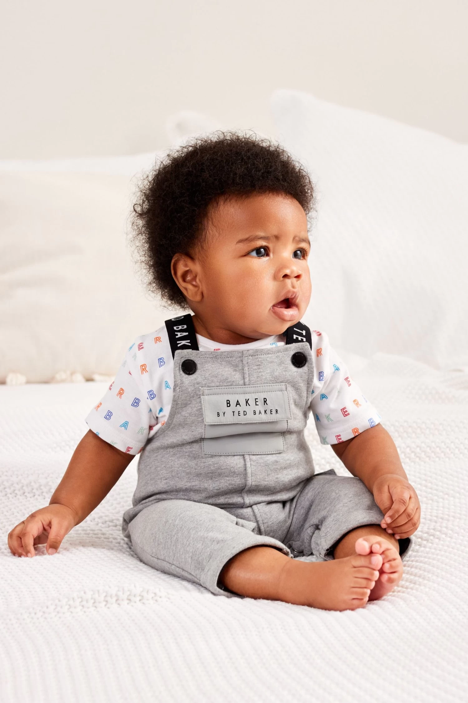 A gorgeous little ensemble for your little man to enjoy wearing that is designed by Baker Ted Baker. The two-piece outfit includes a cute light grey pair of dungarees that has branded adjustable straps with a branded pocket on the chest and another pocket on the leg and it comes with an equally adorable branded bodysuit. Made from soft cotton, this outfit will keep him in comfort and style throughout the day.