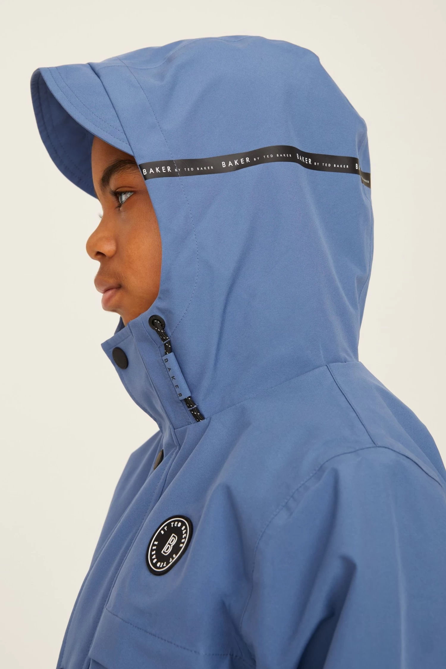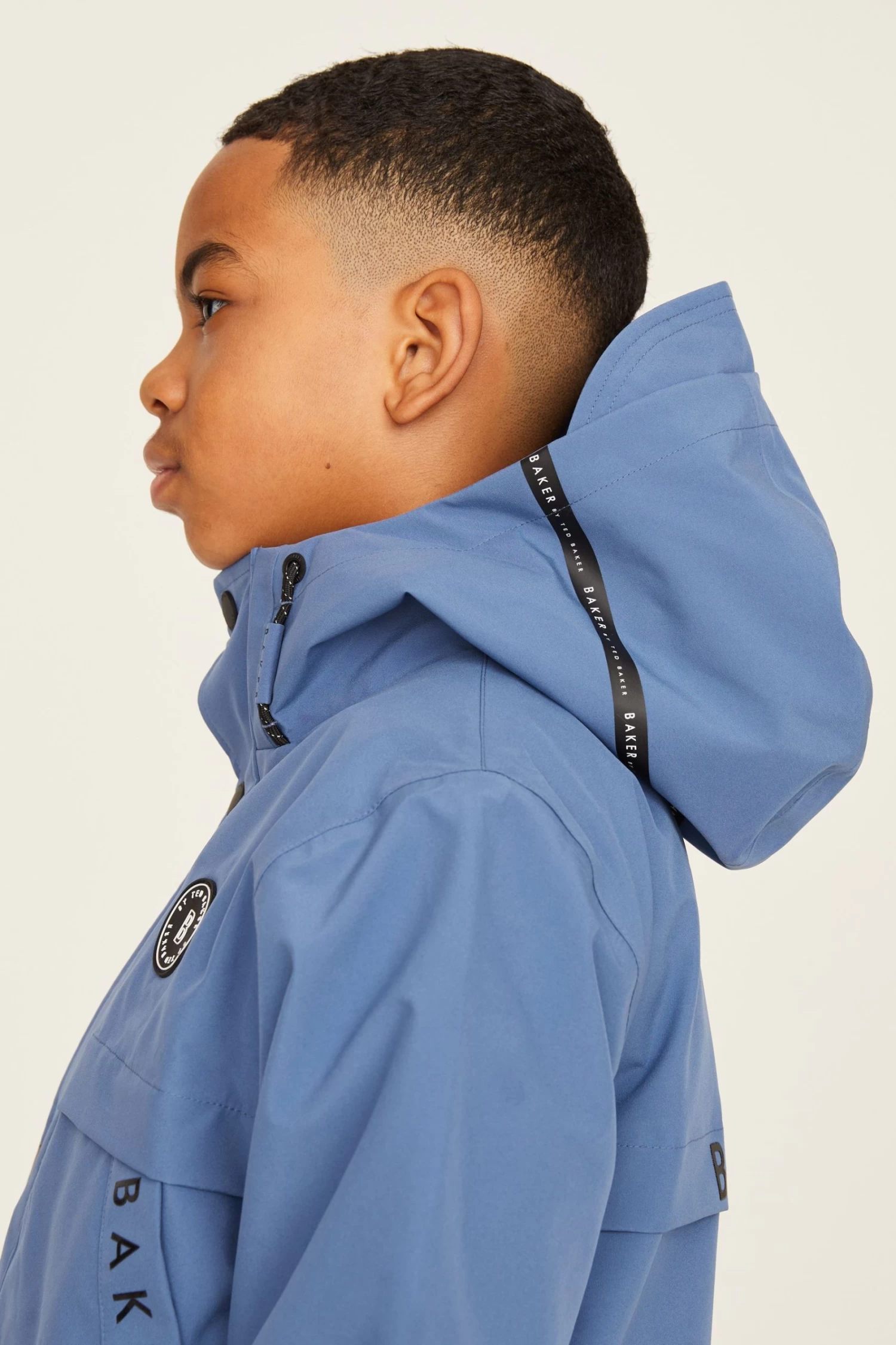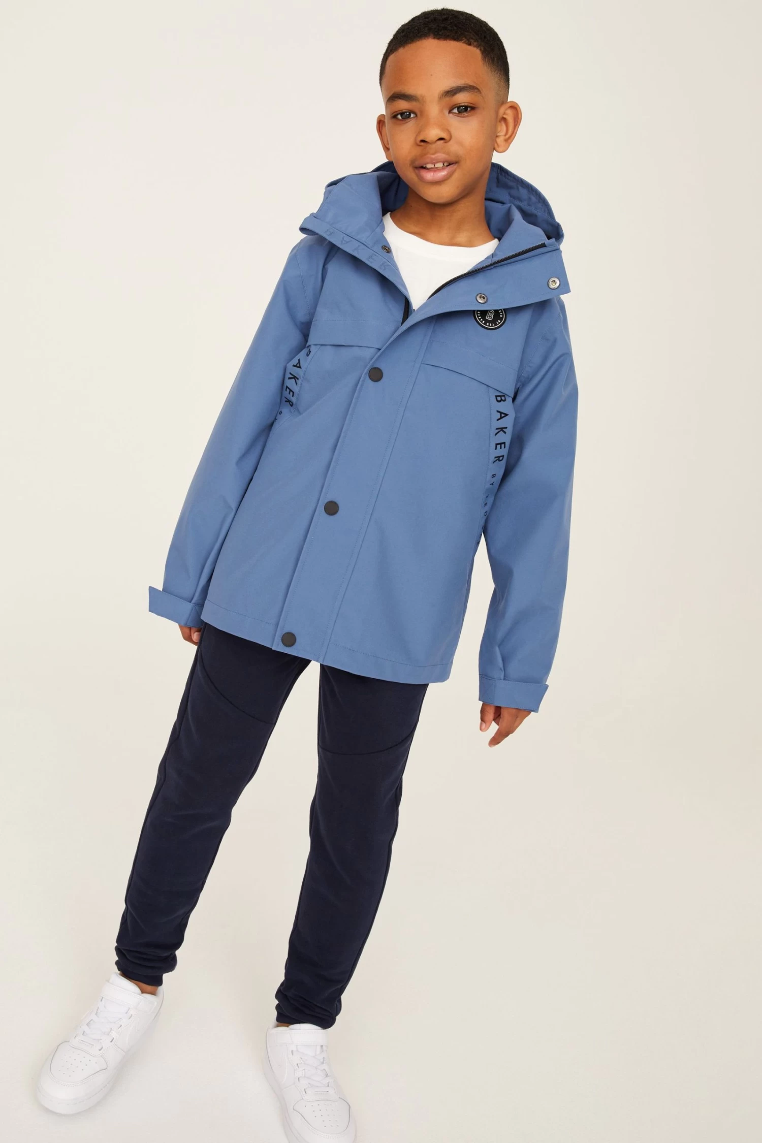 Tackle wet weather days with ease in this fashionable and functional jacket from Baker by Ted Baker. Waterproof to protect against showers, the slick black outerwear has branded details on the pocket openings with a branded chest badge on the front and a zip fastening with metal poppers to keep them cosy. Adjustable wrist straps will ensure a comfortable fit on their arms and the hood is finely finished with branded drawcords.