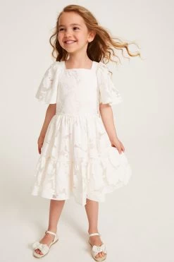 Take care of your little lady’s special occasionwear style this season with this charming dress from Baker by Ted Baker. The classic white silhouette made from a light viscose blend has floaty sleeves with a tiered skirt and it features sheer panels in between floral details that are further enhanced with a soft pink lining showing through underneath. The back of the dress has a beautiful v-shaped detail that is finely finished with a pretty bow and a concealed zip fastening. Pair this dreamy dress with some ballet flats and she is guaranteed to be the best dressed guest.
