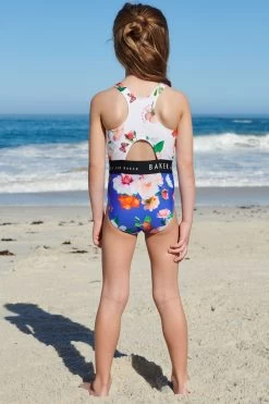 She will look and feel fabulous on the beach in this statement swimsuit from Baker by Ted Baker. Boasting a charming floral printed body with a white background on the top and blue on the bottom, this designer suit is further complemented with a black branded waistband through the middle and a slick racer back. Made from a soft and stretchy nylon blend, this swimsuit offers comfort and style in equal measure.