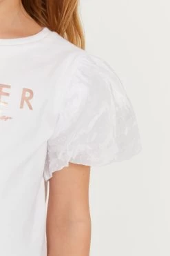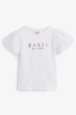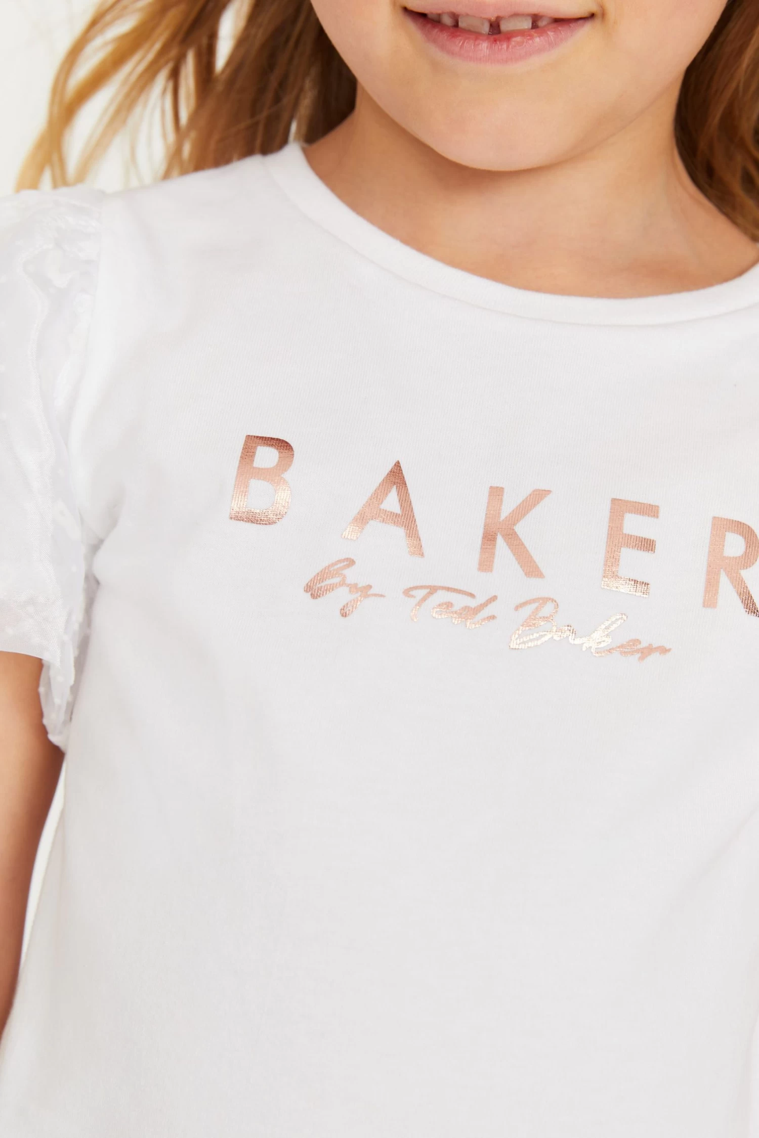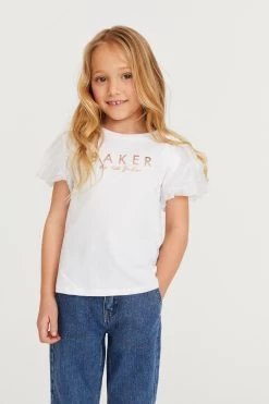 Elevate her everyday look with this pretty t-shirt from designer Baker by Ted Baker. Cutting a classic silhouette, this wardrobe essential is levelled up with beautiful organza puffed sleeves and the iconic branding printed across the chest in rose gold foil. Team it with jeans for an adorable weekend look.