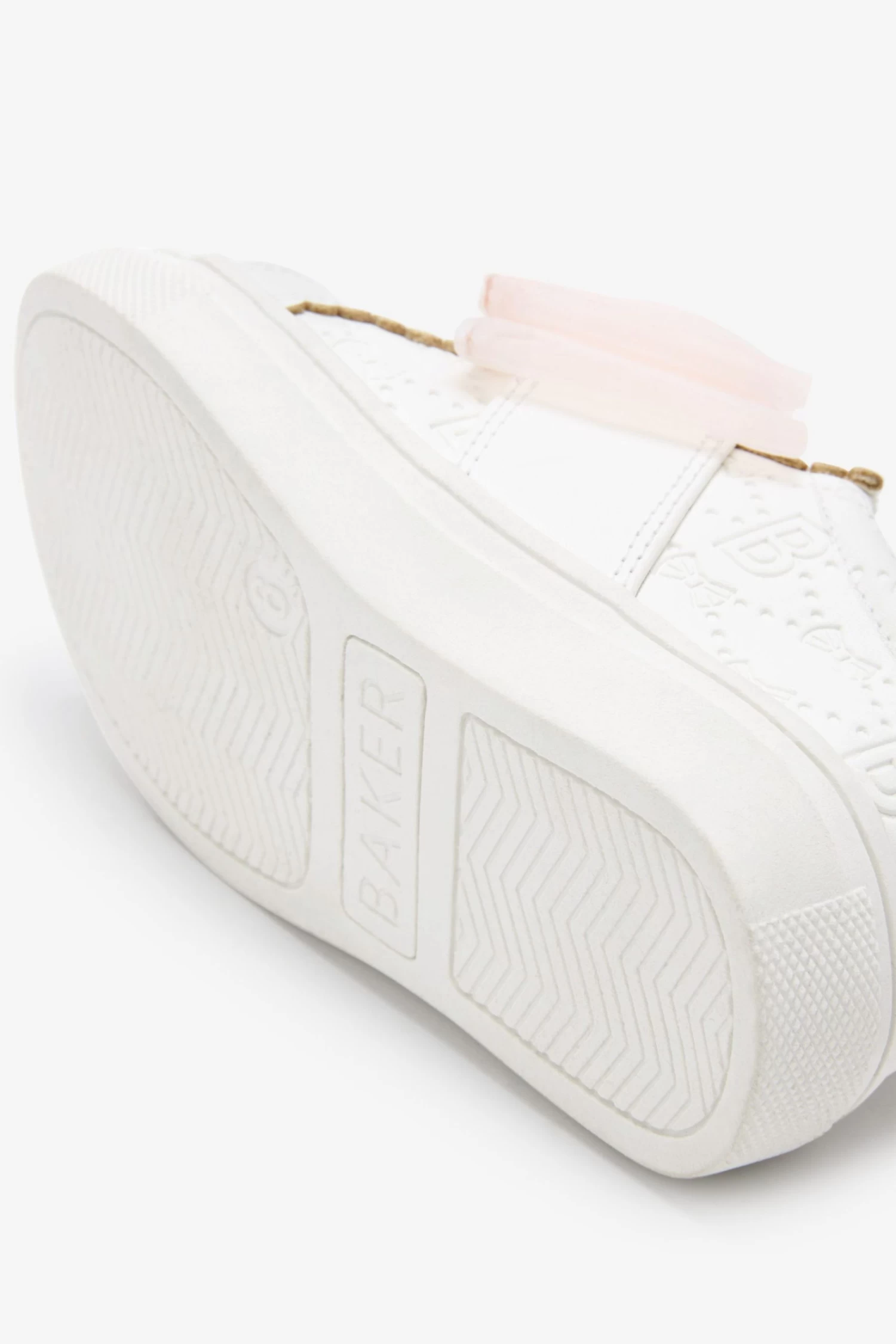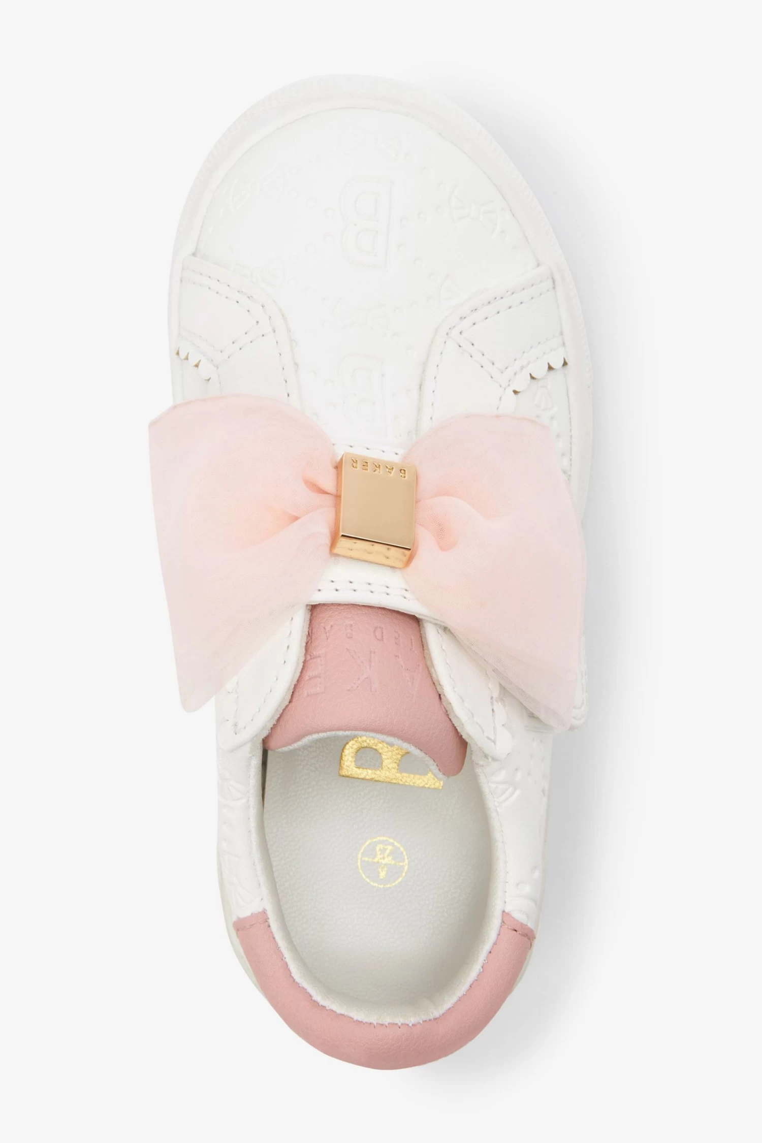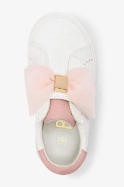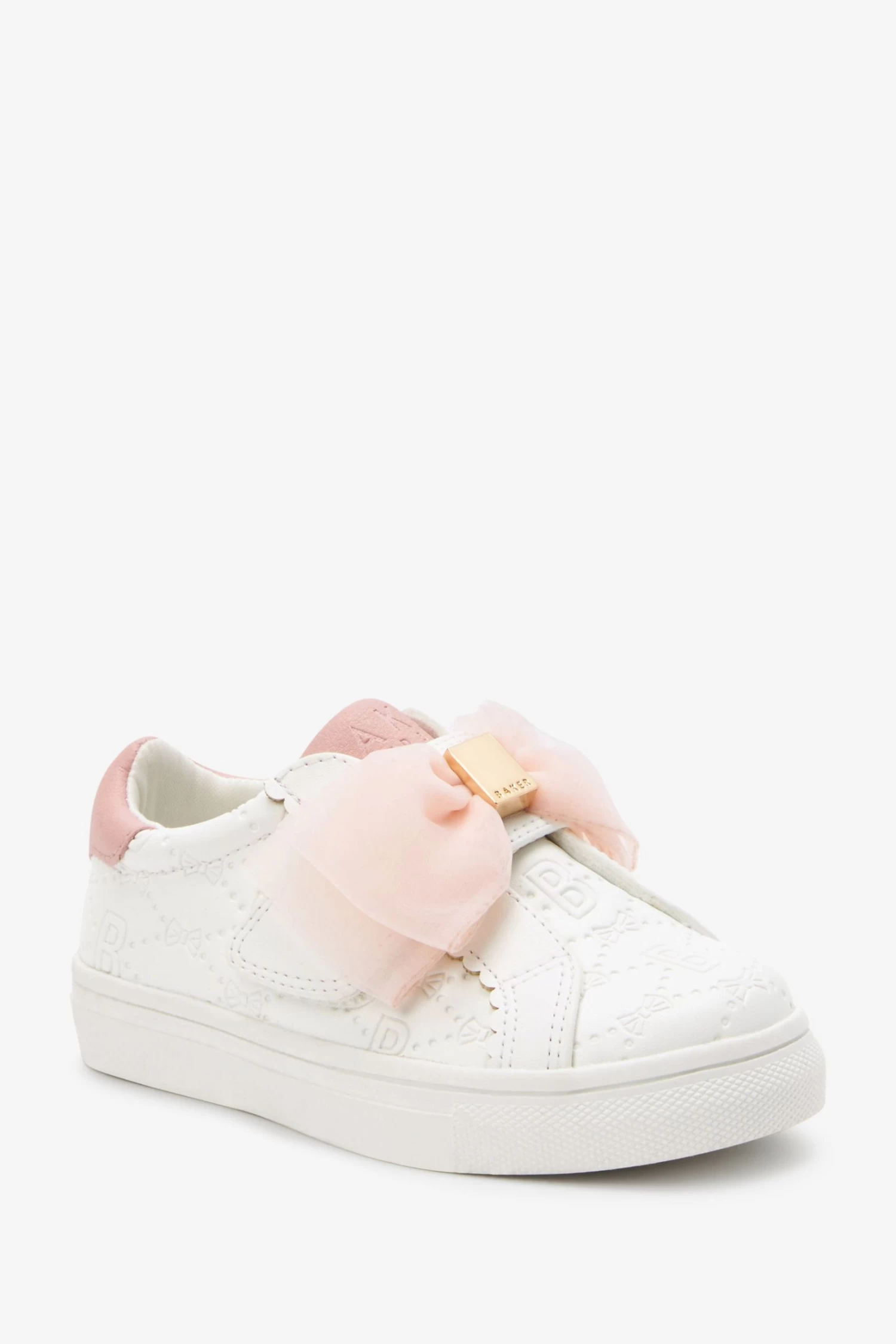 Keep her tiny toes looking stylish this season with these adorable trainers from Baker by Ted Baker. The fresh white silhouette boasts a debossed branded detailing all over it and is further complemented with a stunning pink organza bow on the front with pink trim on the heel and tongue. This charming slip on shoe is made for days out playing and will elevate her look to designer levels in an instant.