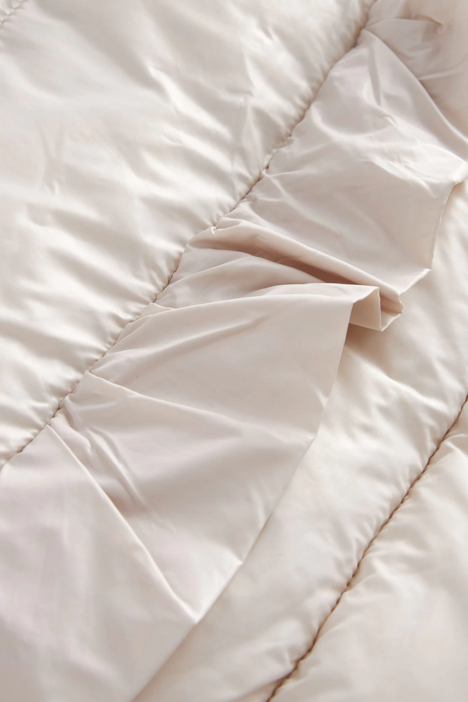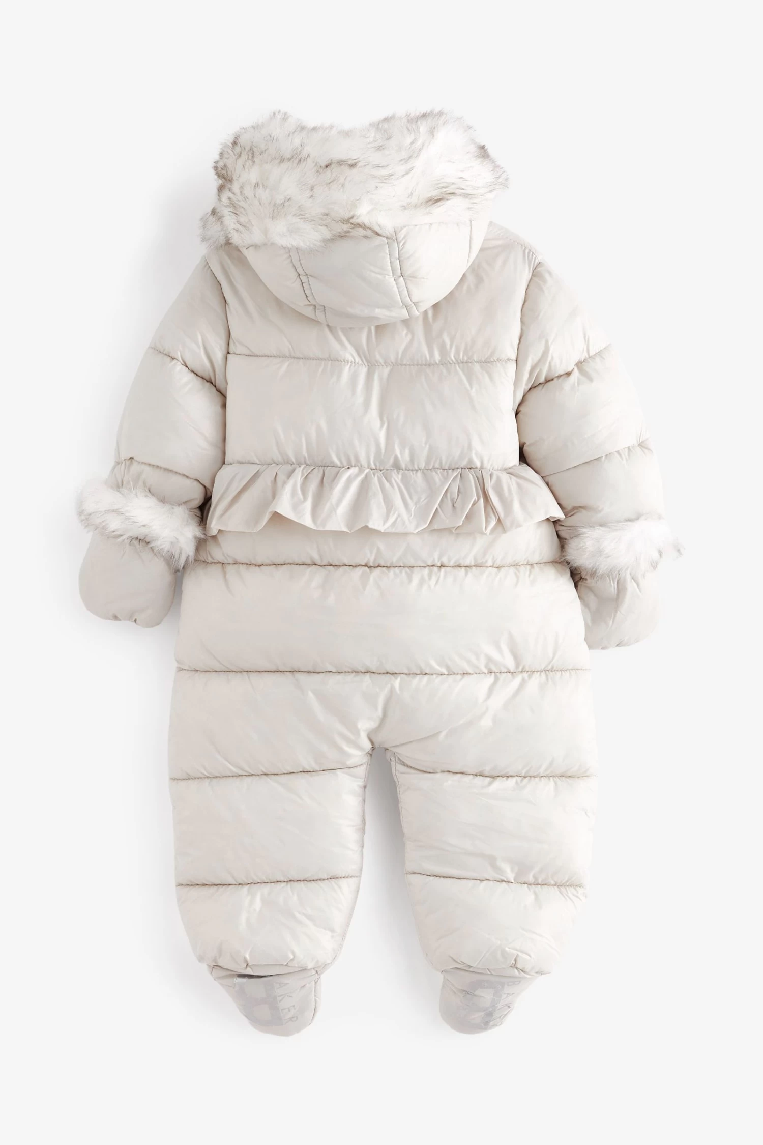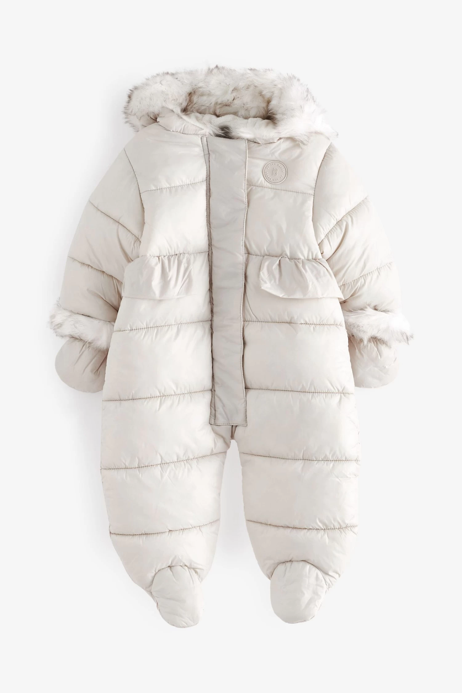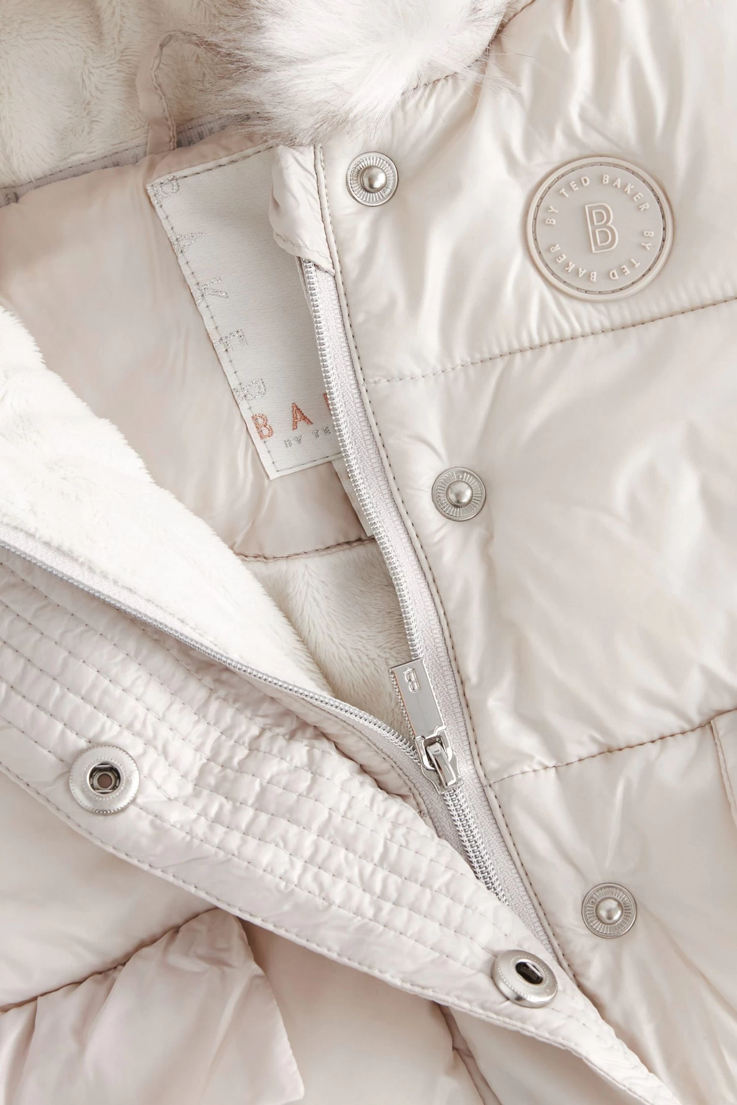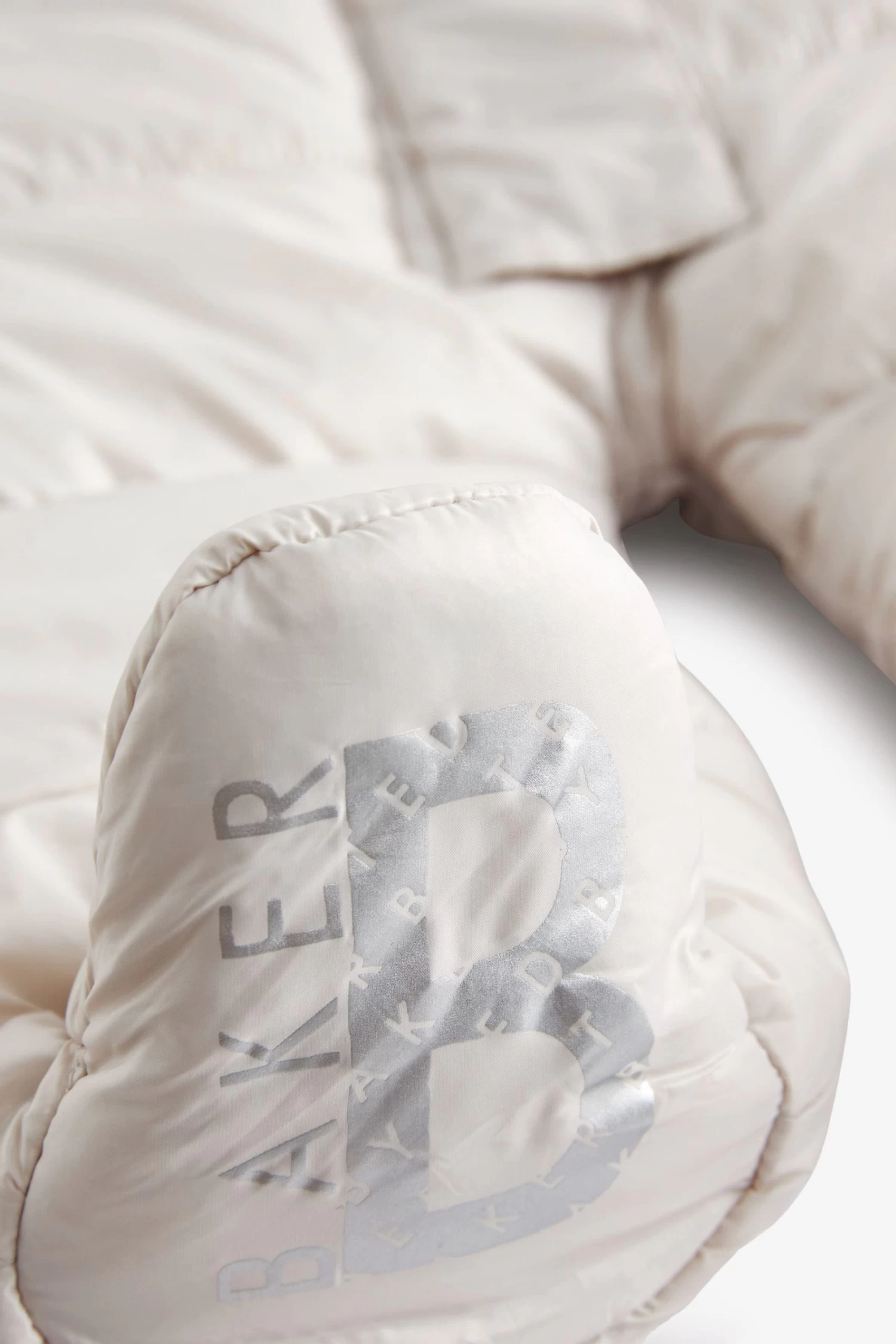 Make light work of winter and wrap your little bundle in this adorable white snowsuit from Baker by Ted Baker. Padded for extra warmth with a pretty frill detail around the waist and designed with a cosy faux fur trimmed hood and cuffs, this fashionable and functional suit is finely finished with a branded badge on the chest and a front zip fastening. Newborn up to 9-12mnth sizes have feet. 12-18mnth and 18-24mnth sizes do not have feet.