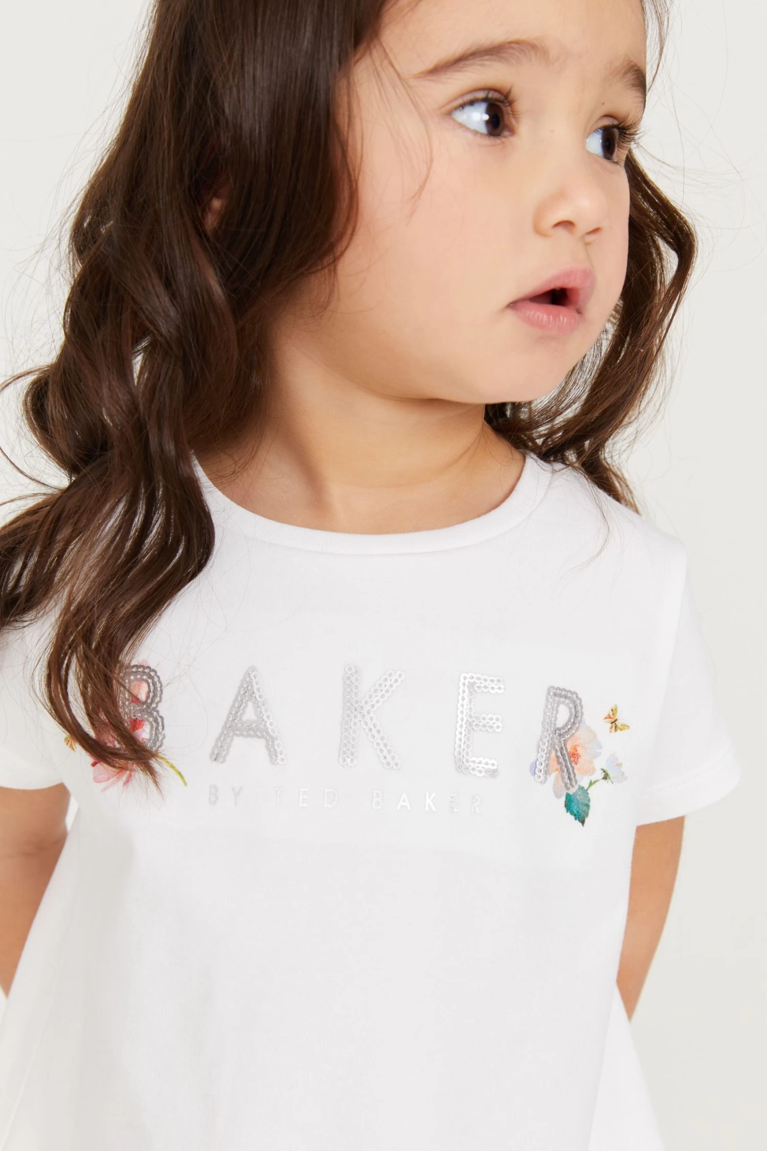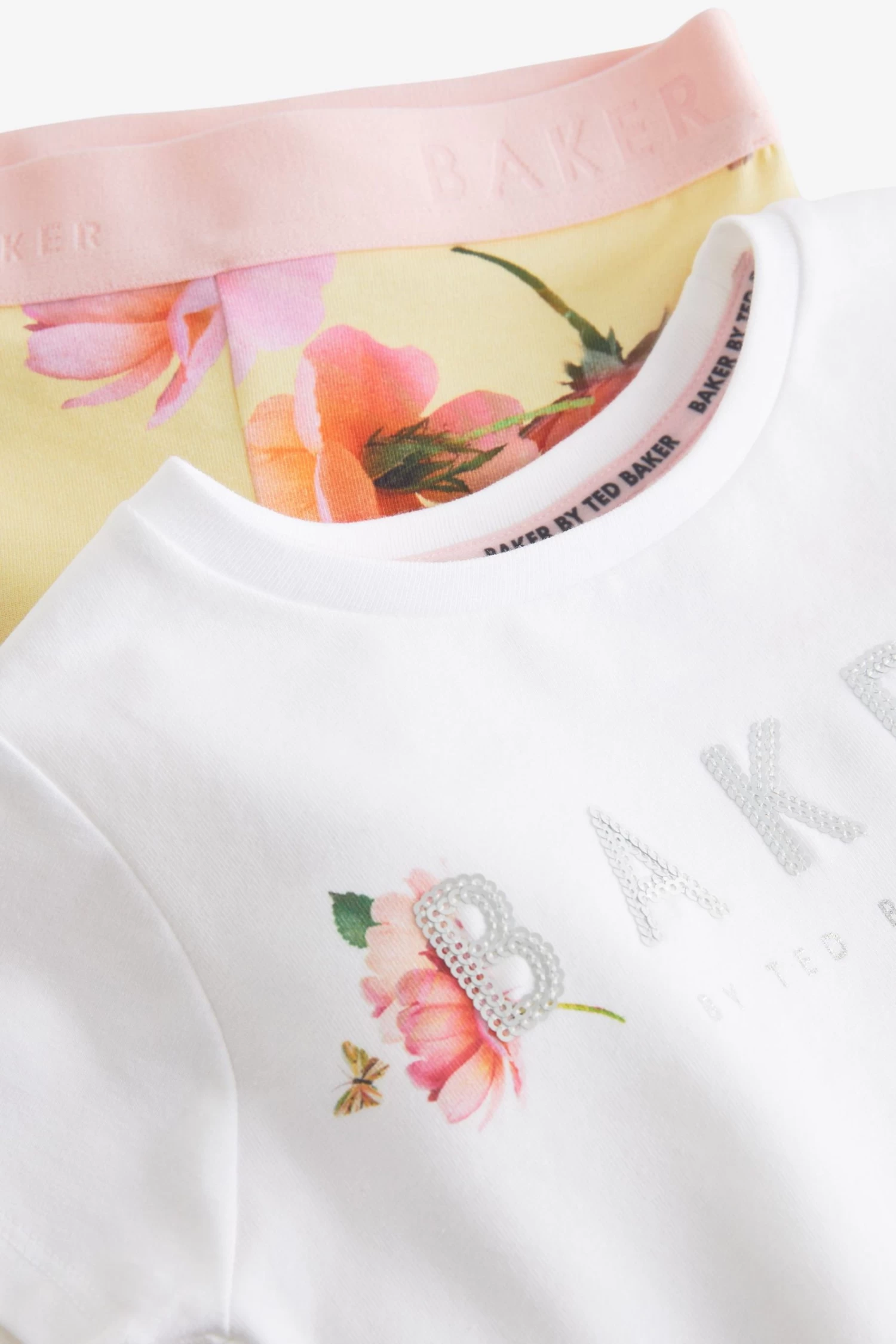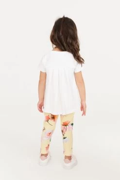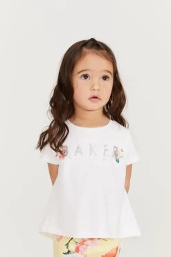 Dress up your little fashionista in head to toe designer with this cute outfit from Baker by Ted Baker. The stylish two piece includes a fresh white t-shirt that has a pretty pleated back and Ted Baker sequin branding appliquéd on the front. Matching yellow floral leggings have a soft elasticated waistband for a comfortable fit.