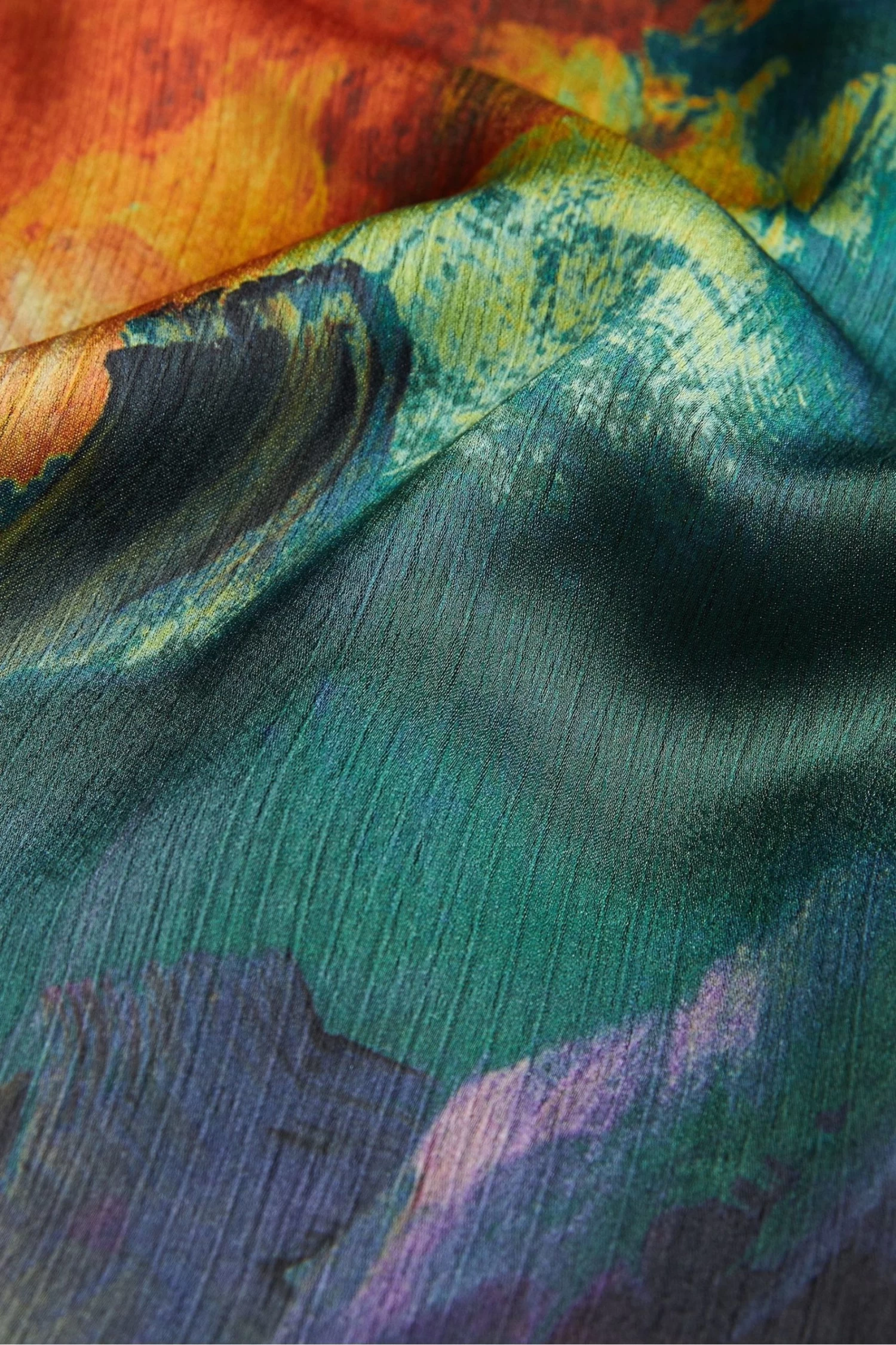Delicate and eye-catching, AVERIEE is a modern twist on the classic A-line silhouette. Our art print adds a splash of colour to your every step, while a high pleated neckline switches it up from the norm. The fabric of this product is made of 100% recycled polyester. Using recycled polyester helps divert plastic waste from ending in landfills and helps us to reduce our dependancy on virgin materials.