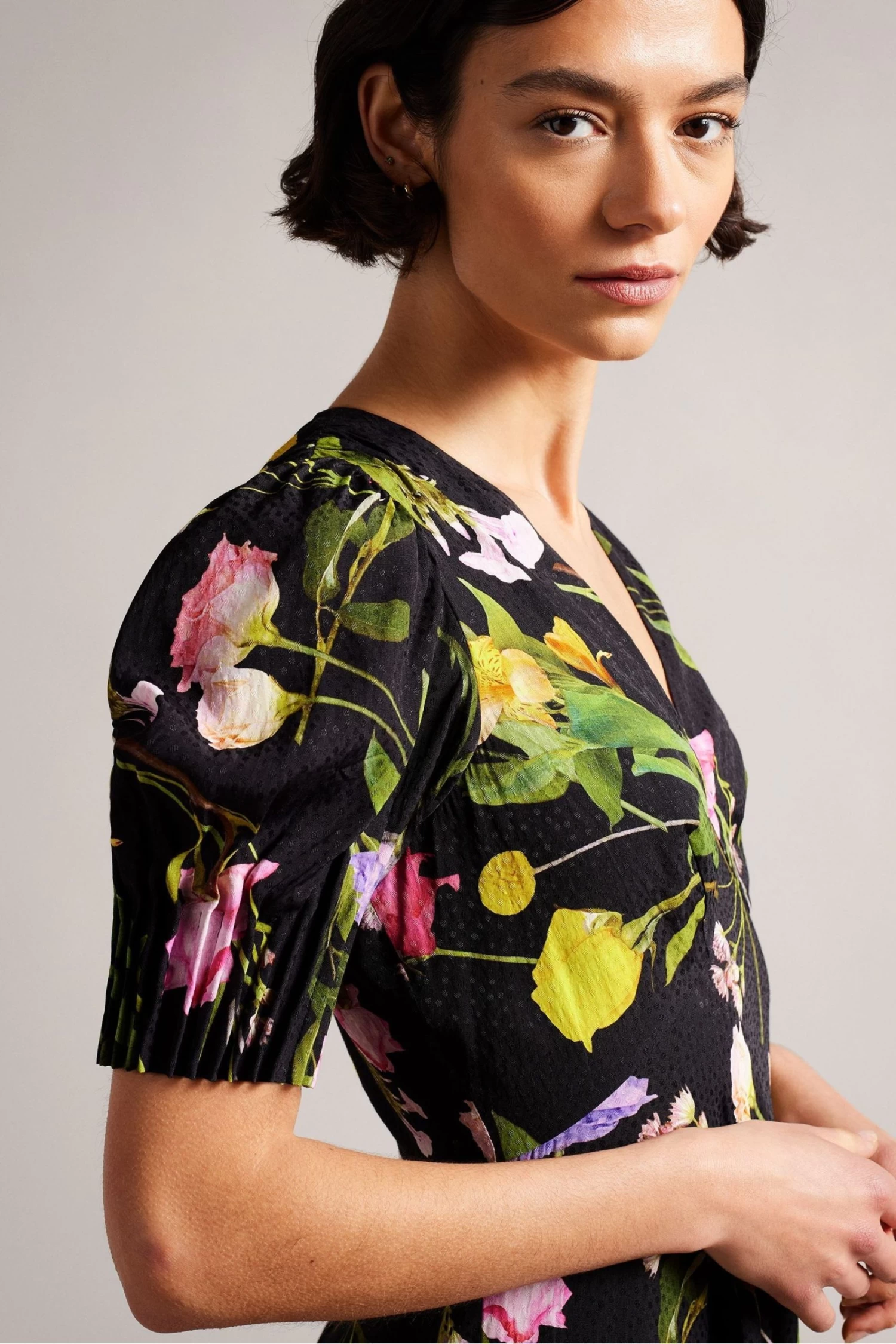 OPALLIE is a dress can pull double duty as both a party dress and a casual sundress. It features a v-neck and short puff sleeves with pleats for extra volume.