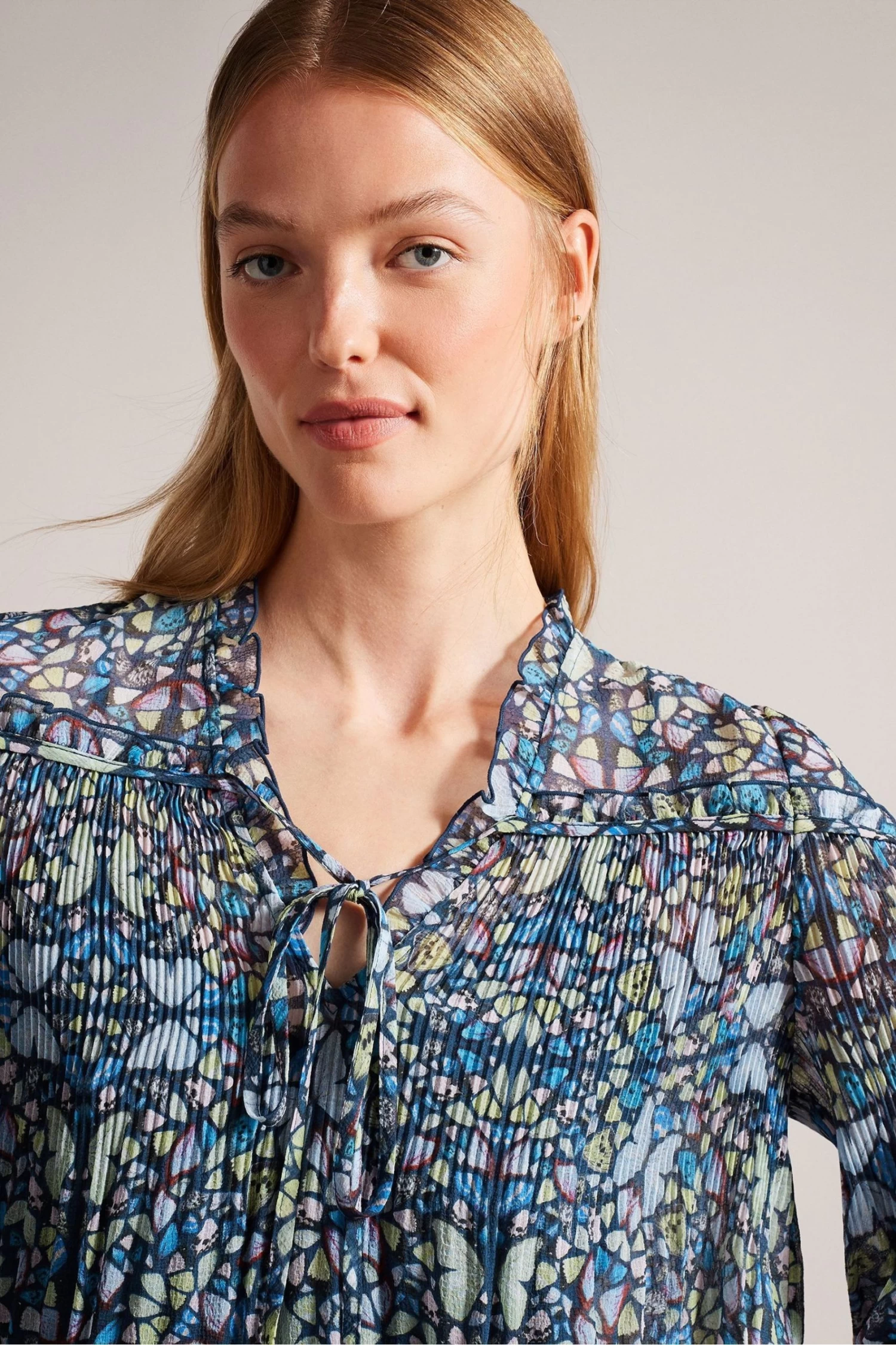 Ted Baker Blue Florrei Swing Blouse With Ruffle Detail And Neck Tie