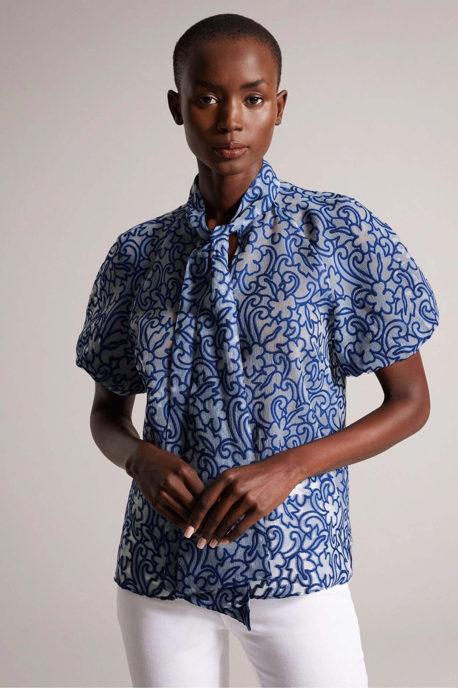 Add a touch of texture and colour to your outfit with the dreamy MELODIY top. Its paisley design is sure to stand out, while puff sleeves and a necktie enhance the silhouette.