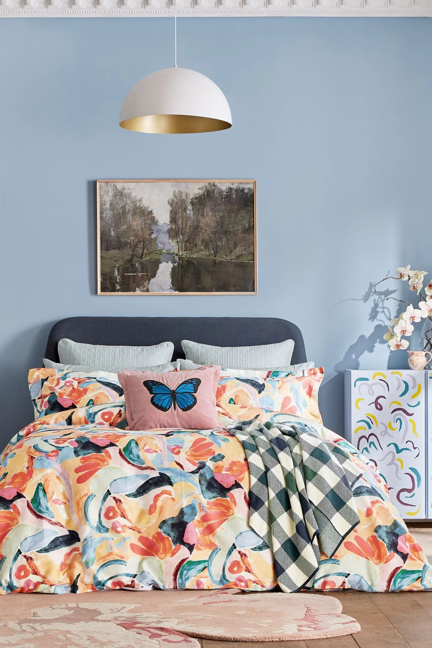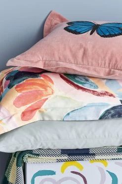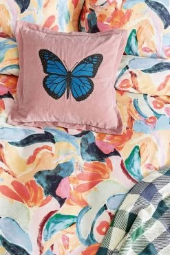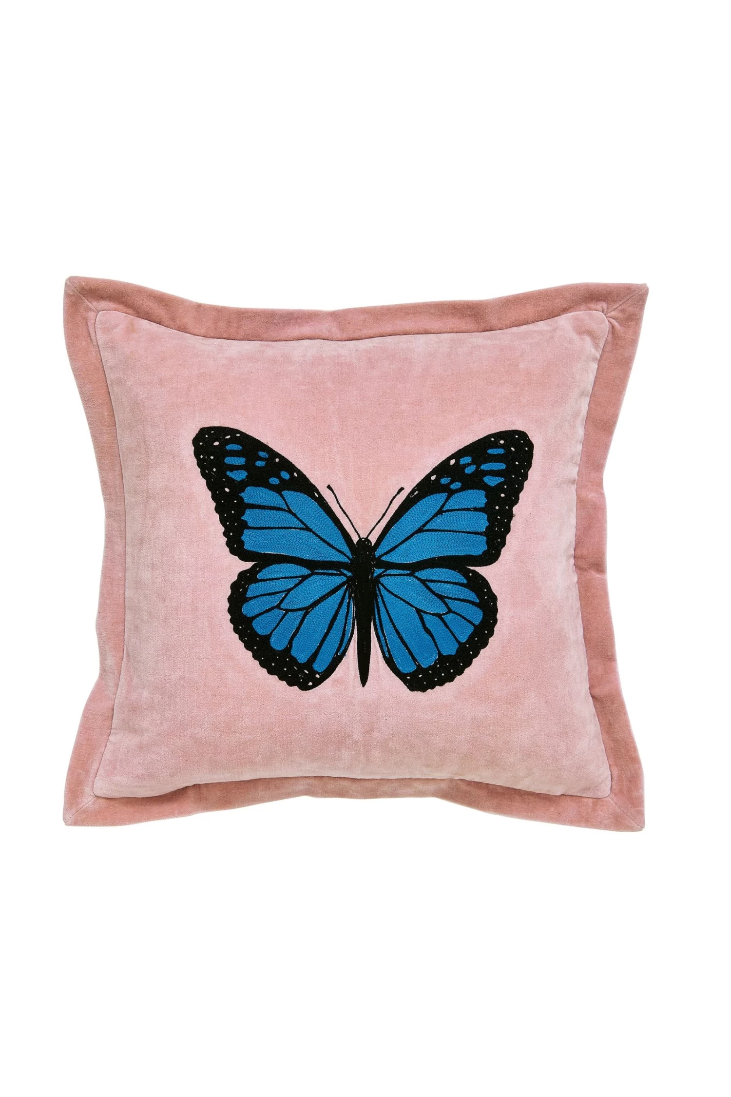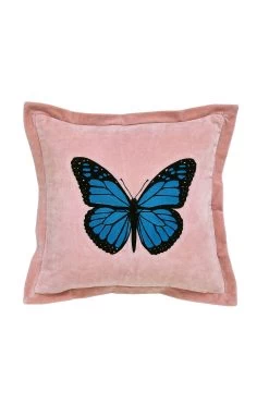 Layer up the Abstract Art bedding range with the embellished velvet cushion to complete this floral paradise. The cushion features a crewel embroidered butterfly design on a pale pink velvet background.