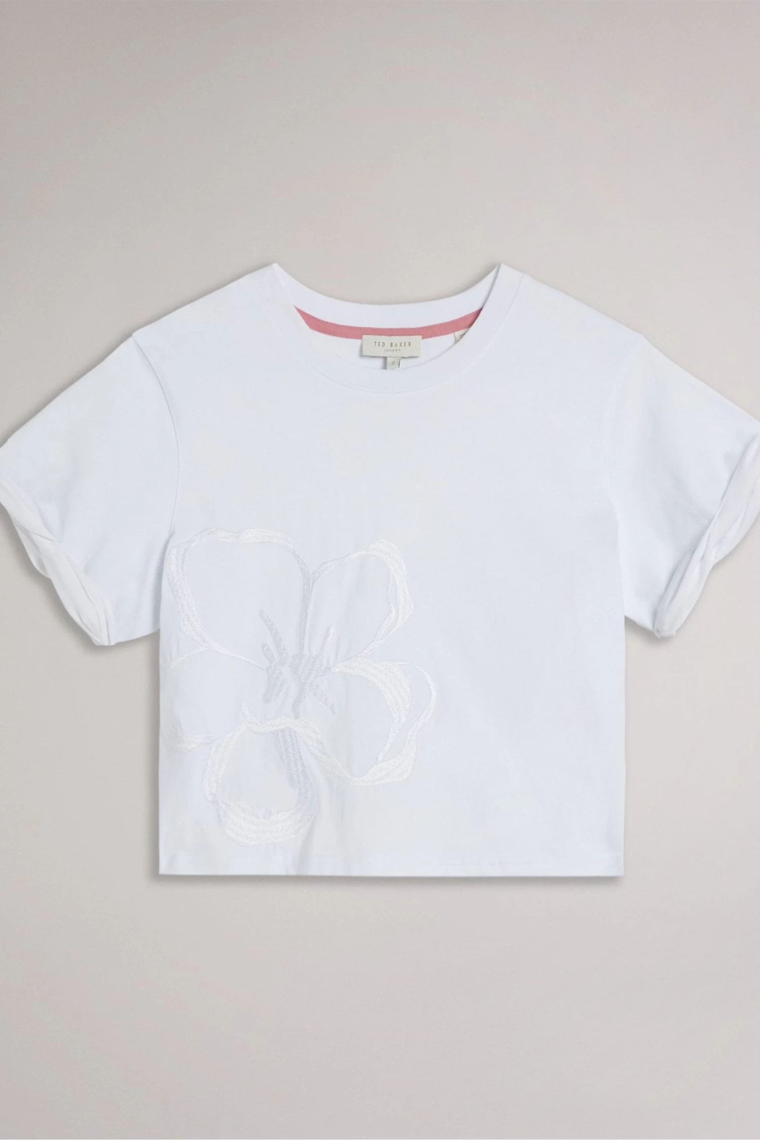 Ted Baker Carmyn White Roll Sleeve T-Shirt With Satin Stitch Magnolia
