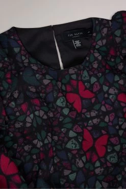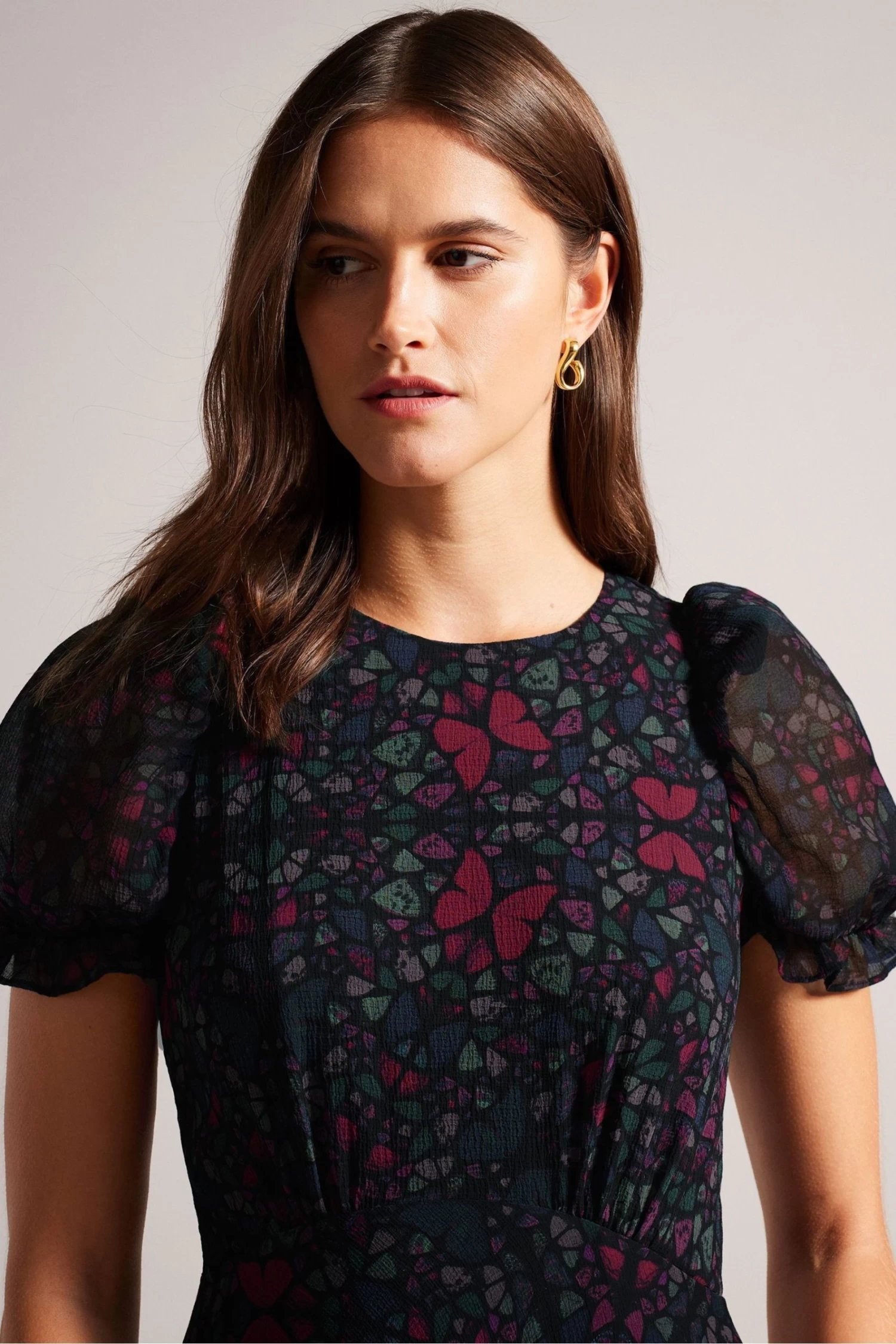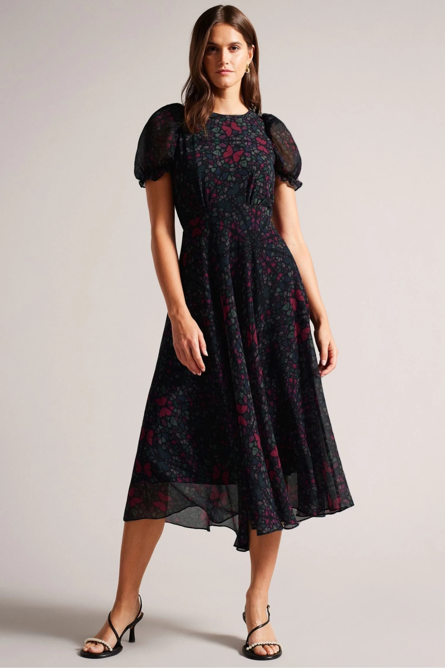 Ted Baker Daniaa Graduated Black Midi Dress With Ruched Puff Sleeve