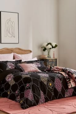 This bed makes a bold, modern style statement with a black seersucker ground contrasting against geometric panels of printed floral patterns in pink and yellow tones. Ted always has an eye on the detail, with branded buttons and an embroidered magnolia patch logo on the duvet covers. Poly cotton seersucker, 200 thread count.