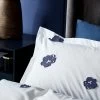 The black and cream embroidered floral cushion in cotton velvet is trimmed with fringed detailing, adding further interest.