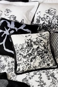 The black and cream embroidered floral cushion in cotton velvet is trimmed with fringed detailing, adding further interest.