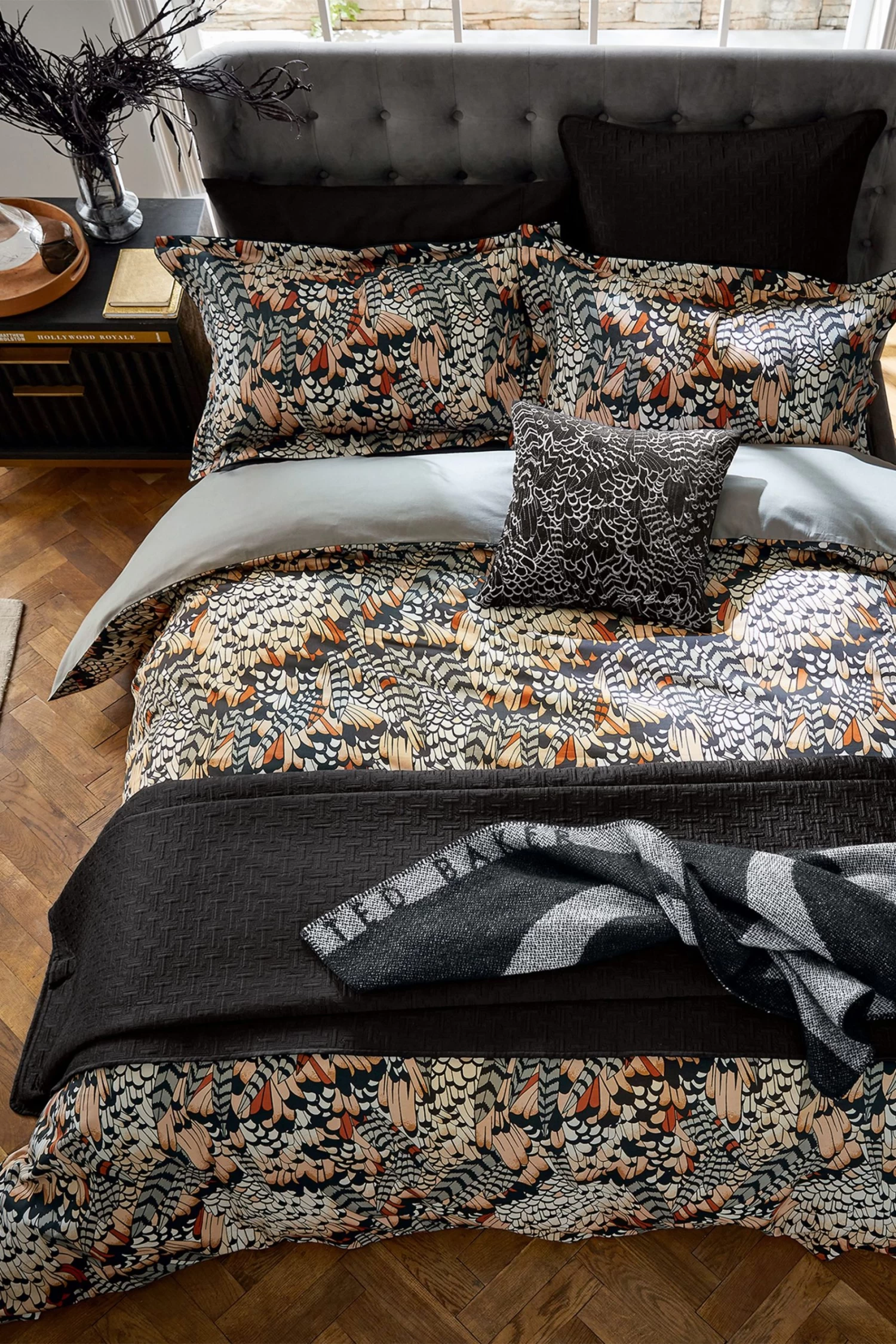 Add sumptuous luxe with the 100% cotton velvet cushion with embroidered feather design, highlighted with metallic thread.