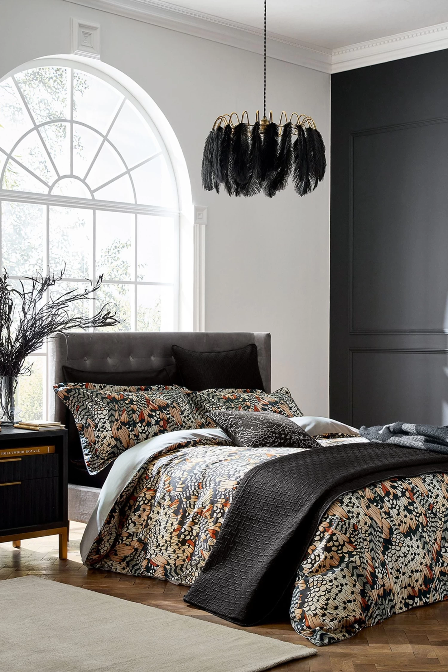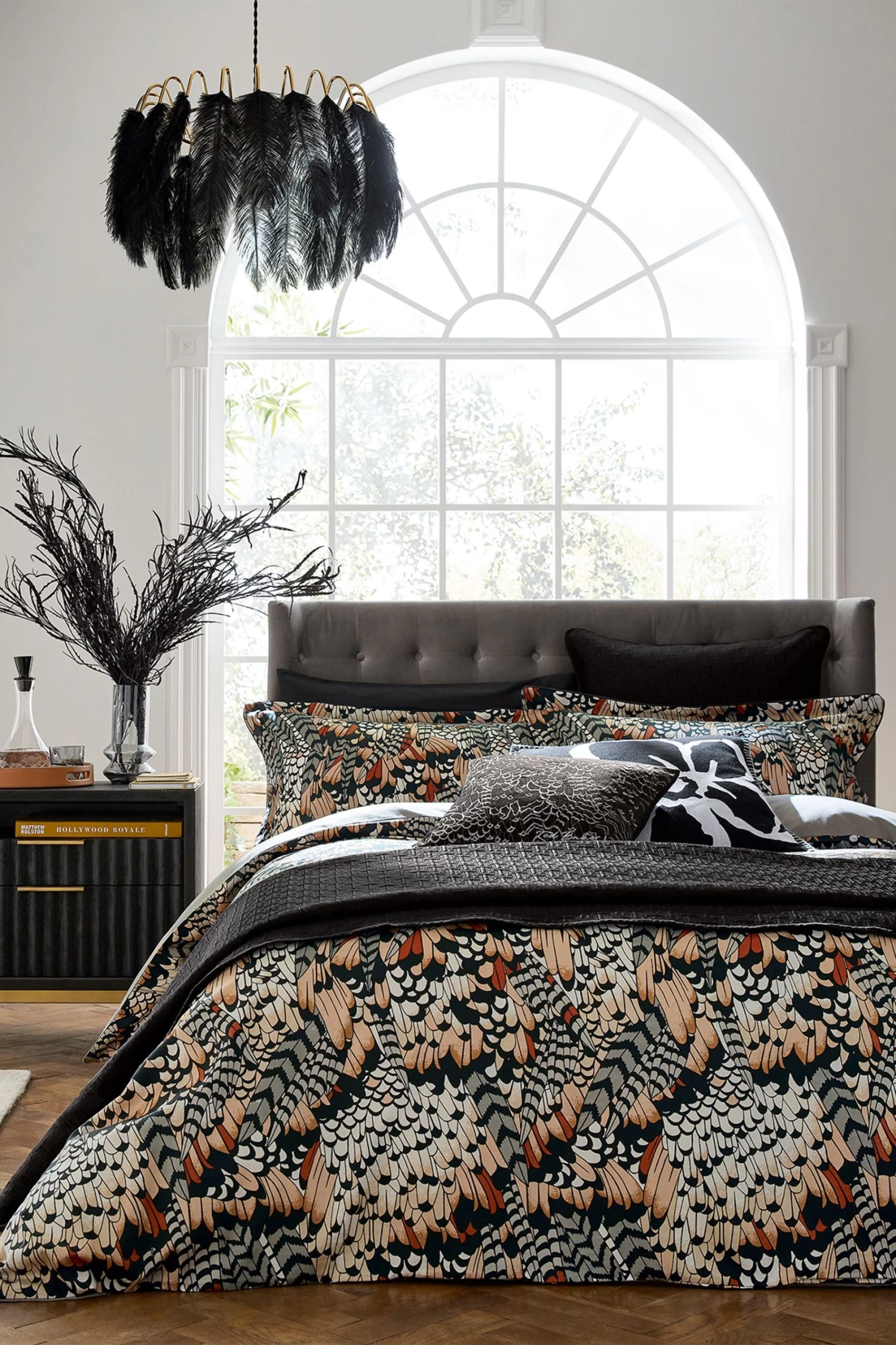 An intricate all over feather print exuding daring opulence. The detailed feathers pop in shades of black, cream, brown and orange for a cosy autumnal feel. The bedding reverse is kept simple in plain black.