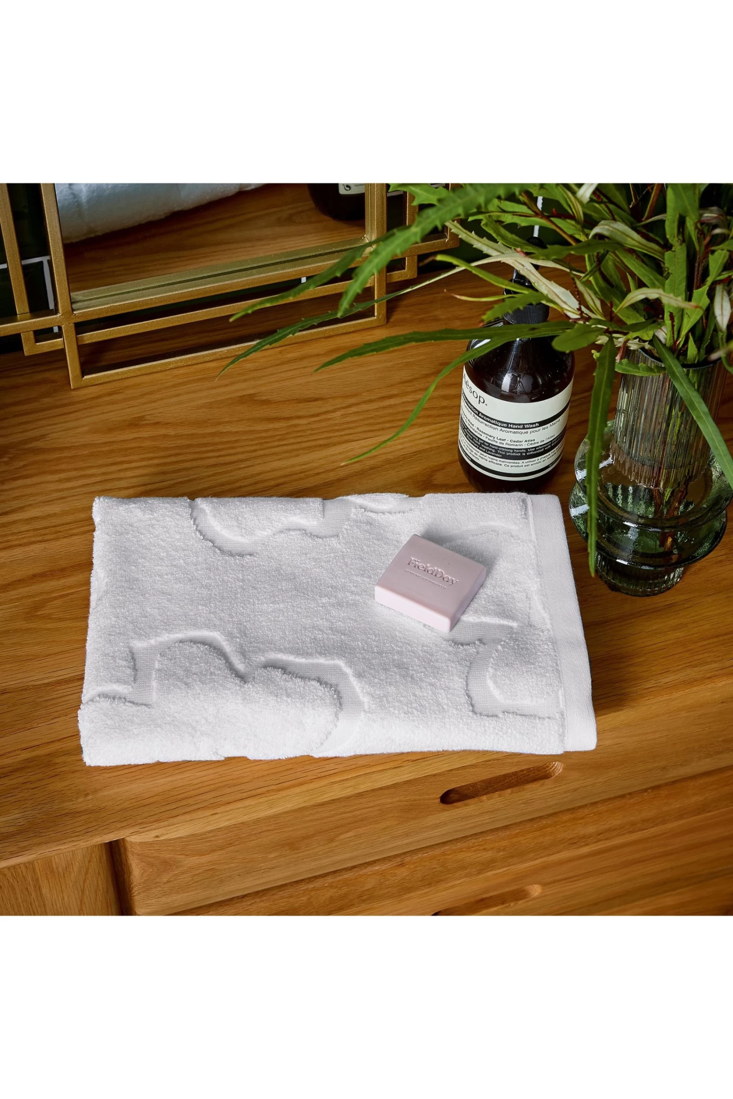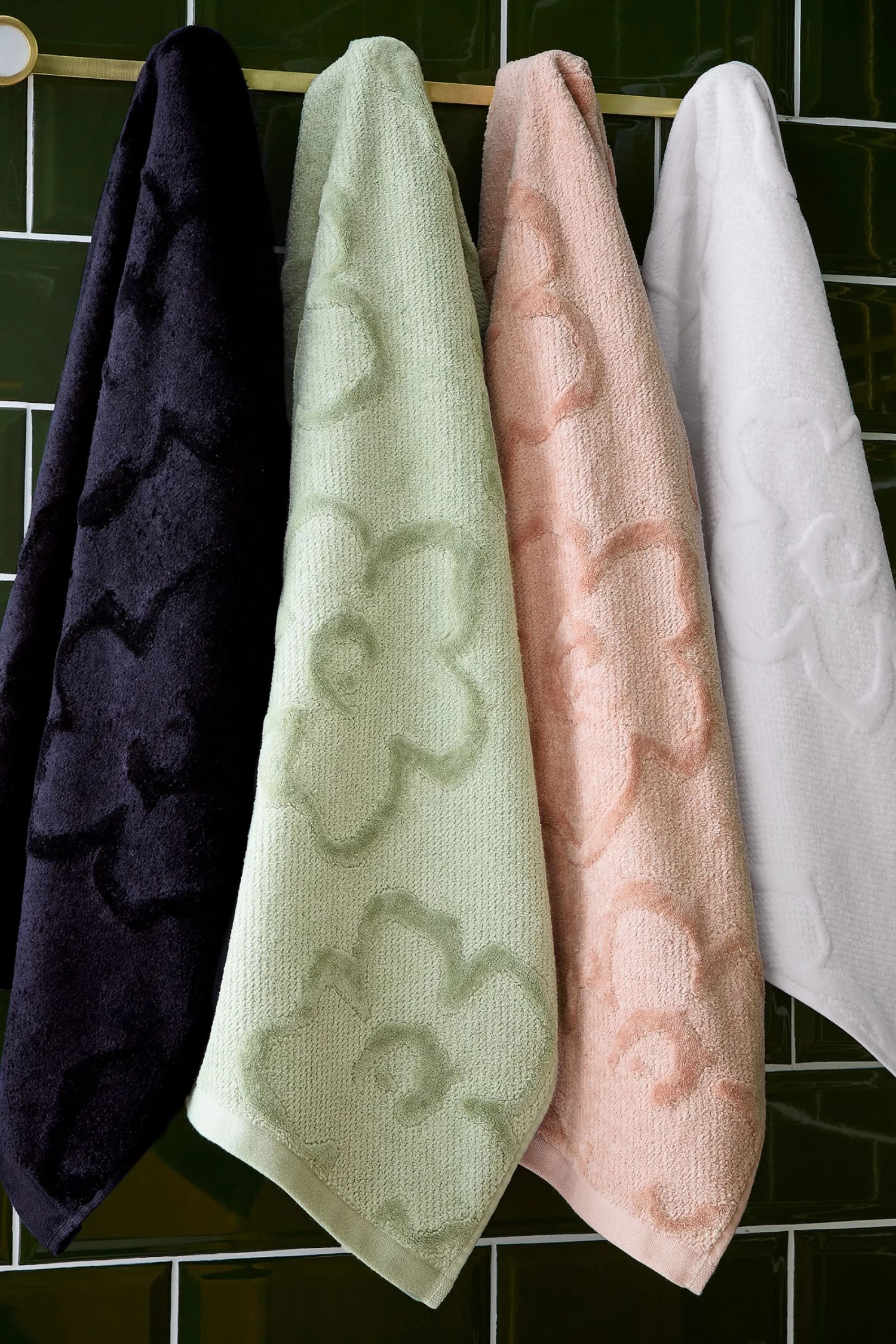 A supremely soft jacquard style towel. Beautifully made to give a textured feel in cotton velour with a soft diagonal pattern on the base. Made from 100% cotton, it’s available in a choice of navy, white, soft pink or sage with a plain hem top and bottom. Each towel is complete with the Ted Baker embroidered patch logo.