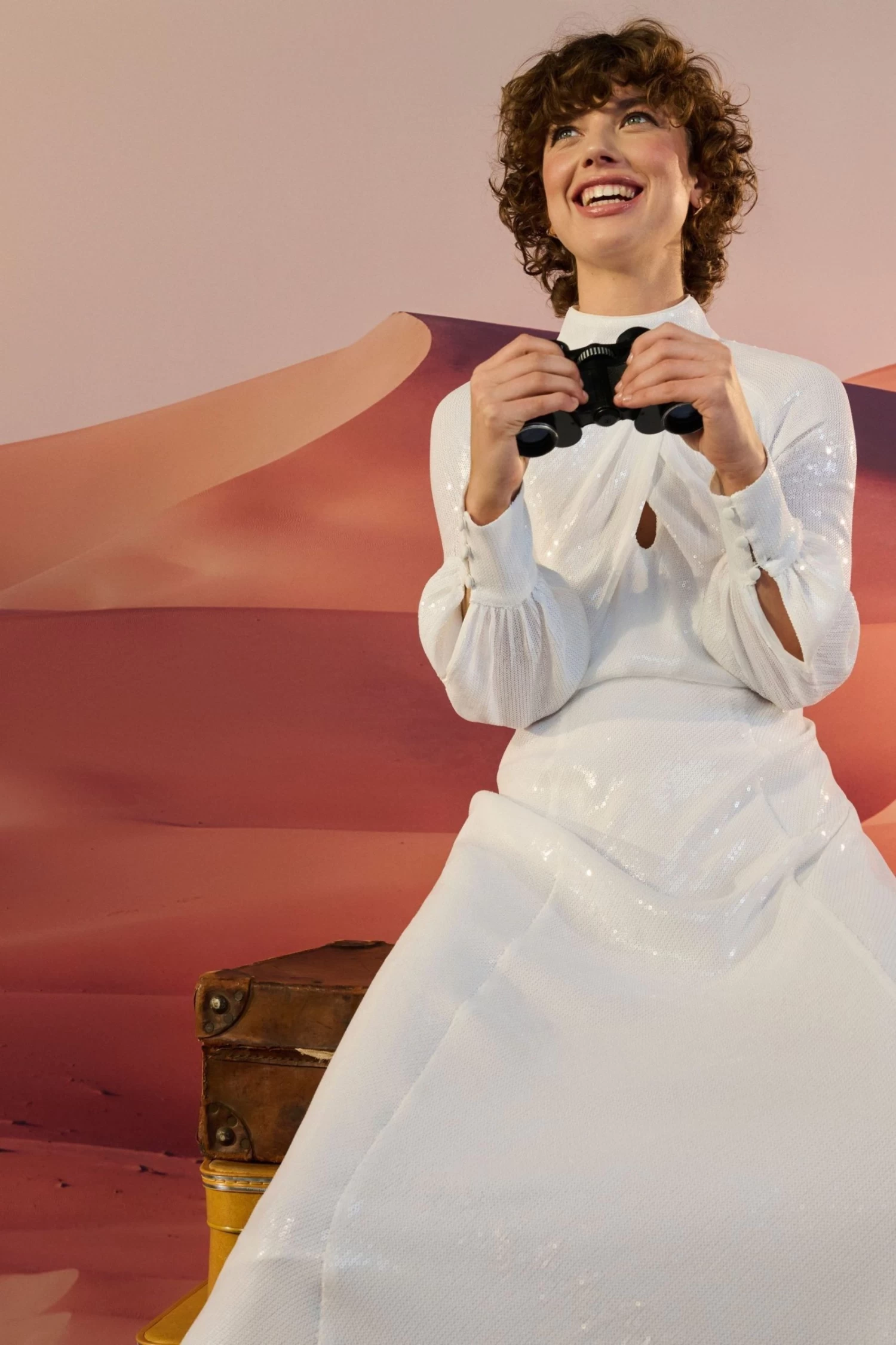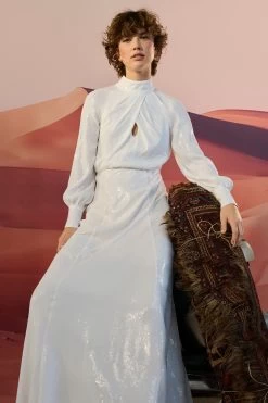 MAYROSE is a showstopper. This maxi dress is pure glamour with its all-over sequins and flattering details. The high neck, long sleeves, and split back hem add a touch of elegance to this party dress.