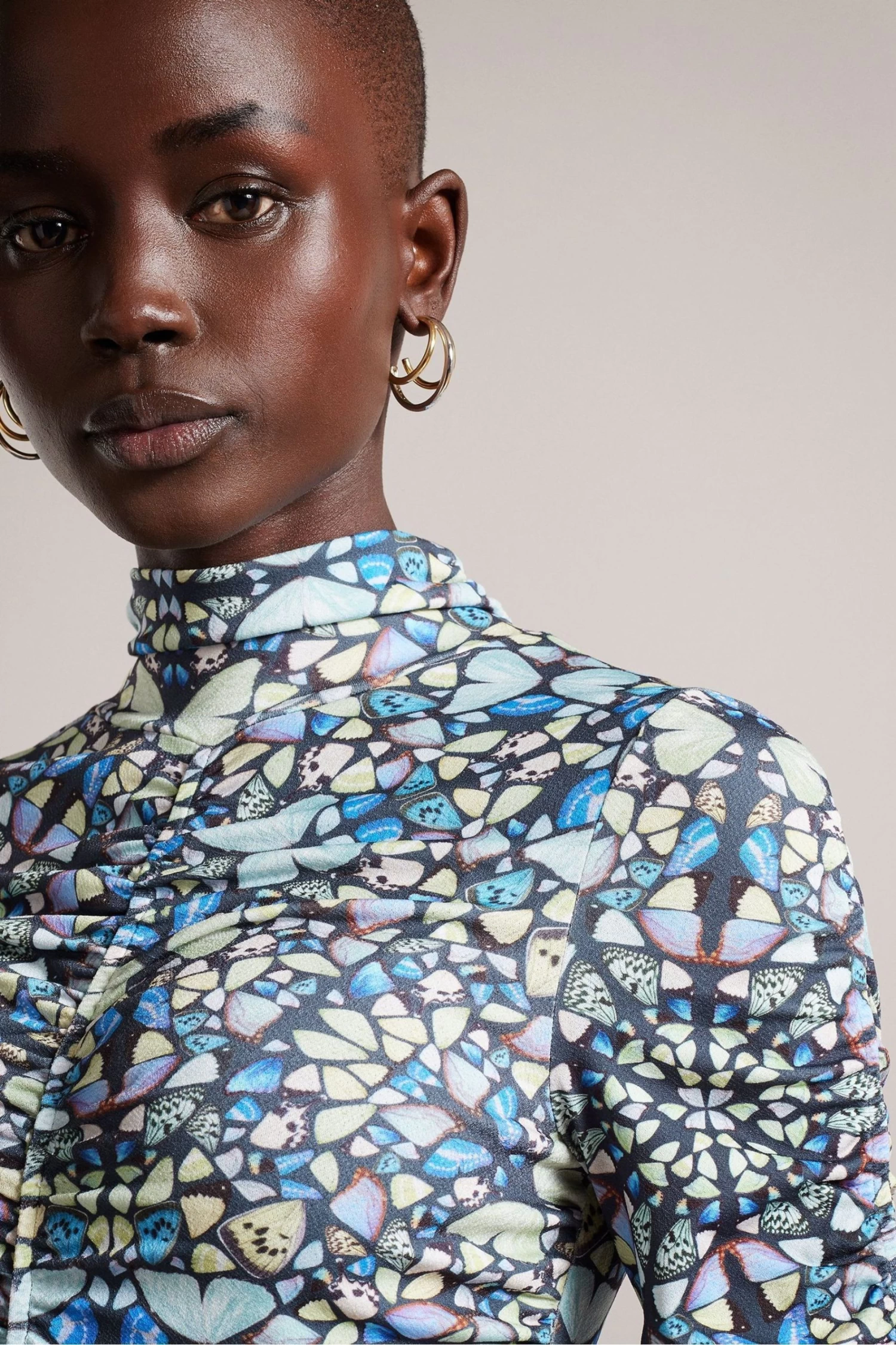 The GIANIE top is a statement piece, featuring a kaleidoscope butterfly print and playful ruched details. A cute addition to your everyday wardrobe, it’s made with stretch fabric for added comfort and has long sleeves for added warmth.