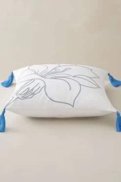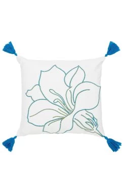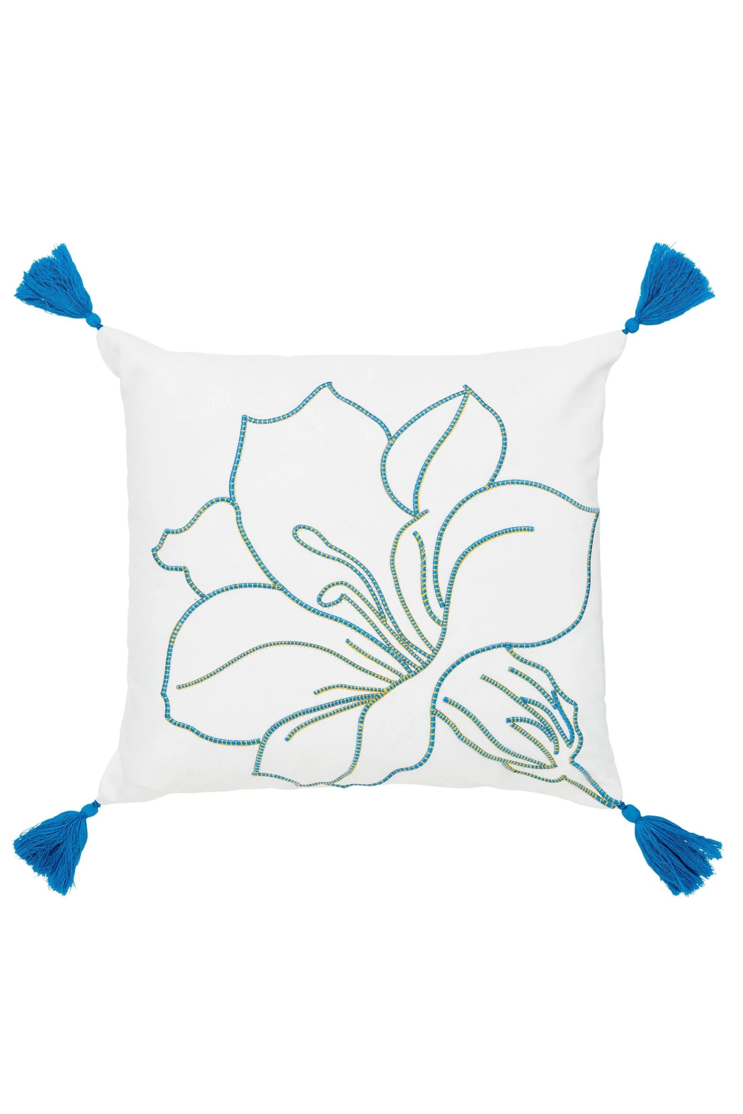 This embroidered floral cushion is accented with hints of yellow, with each corner given a quirky large scale blue tassel.