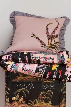 A digitally printed patchwork design to the front of this throw is quilted in a large diamond pattern. Reverse in contrast plain dyed black. 100% BCI Cotton Sateen.