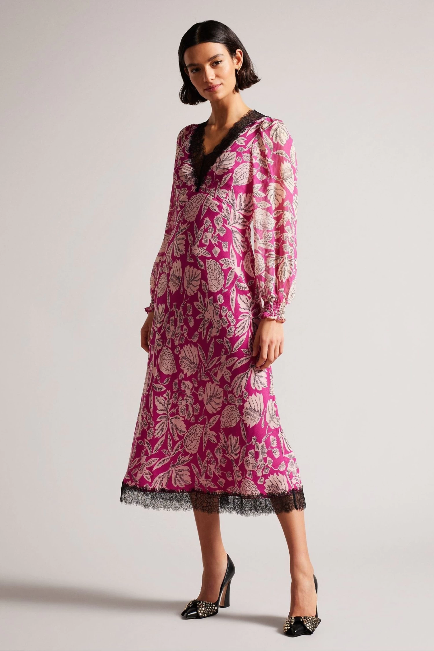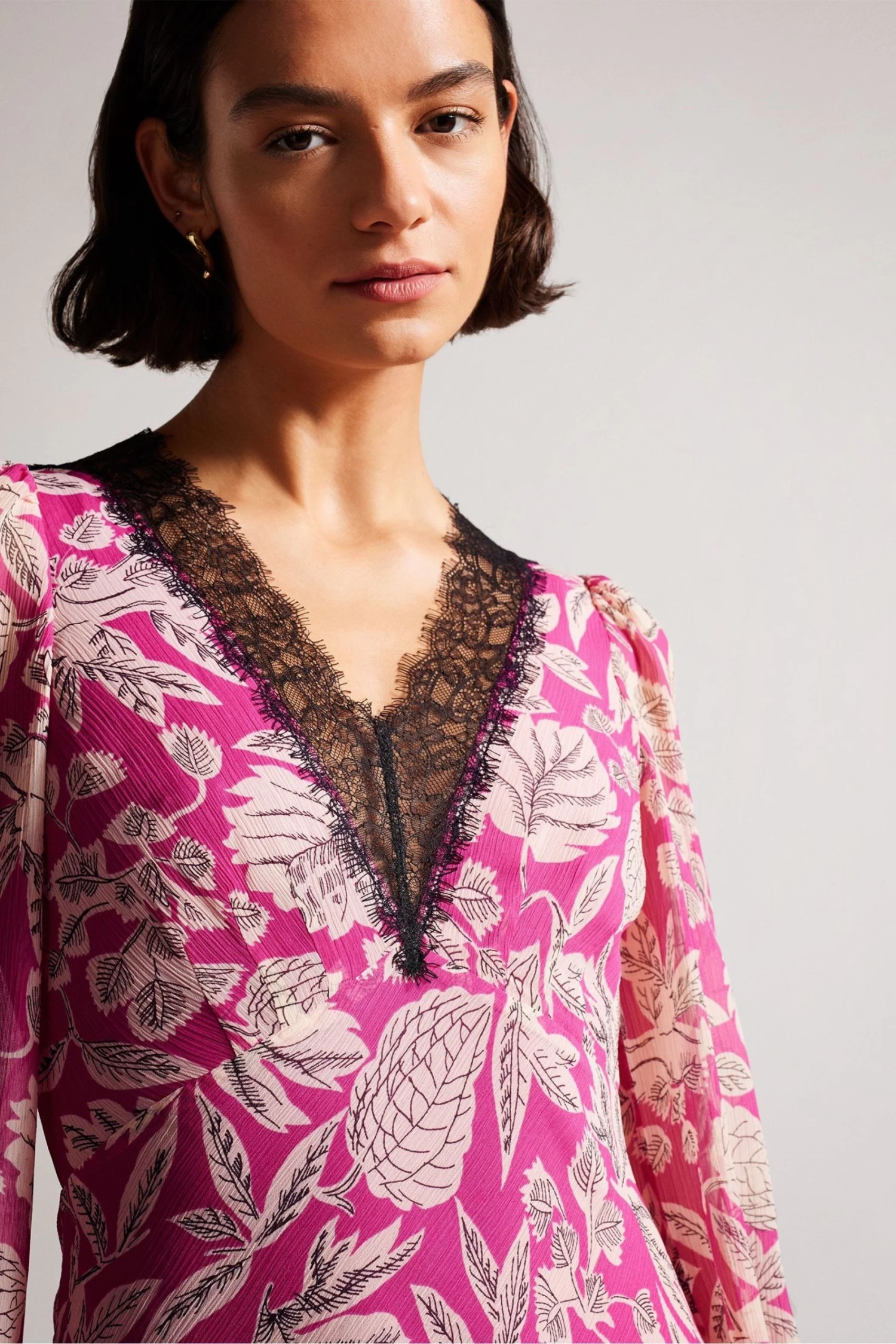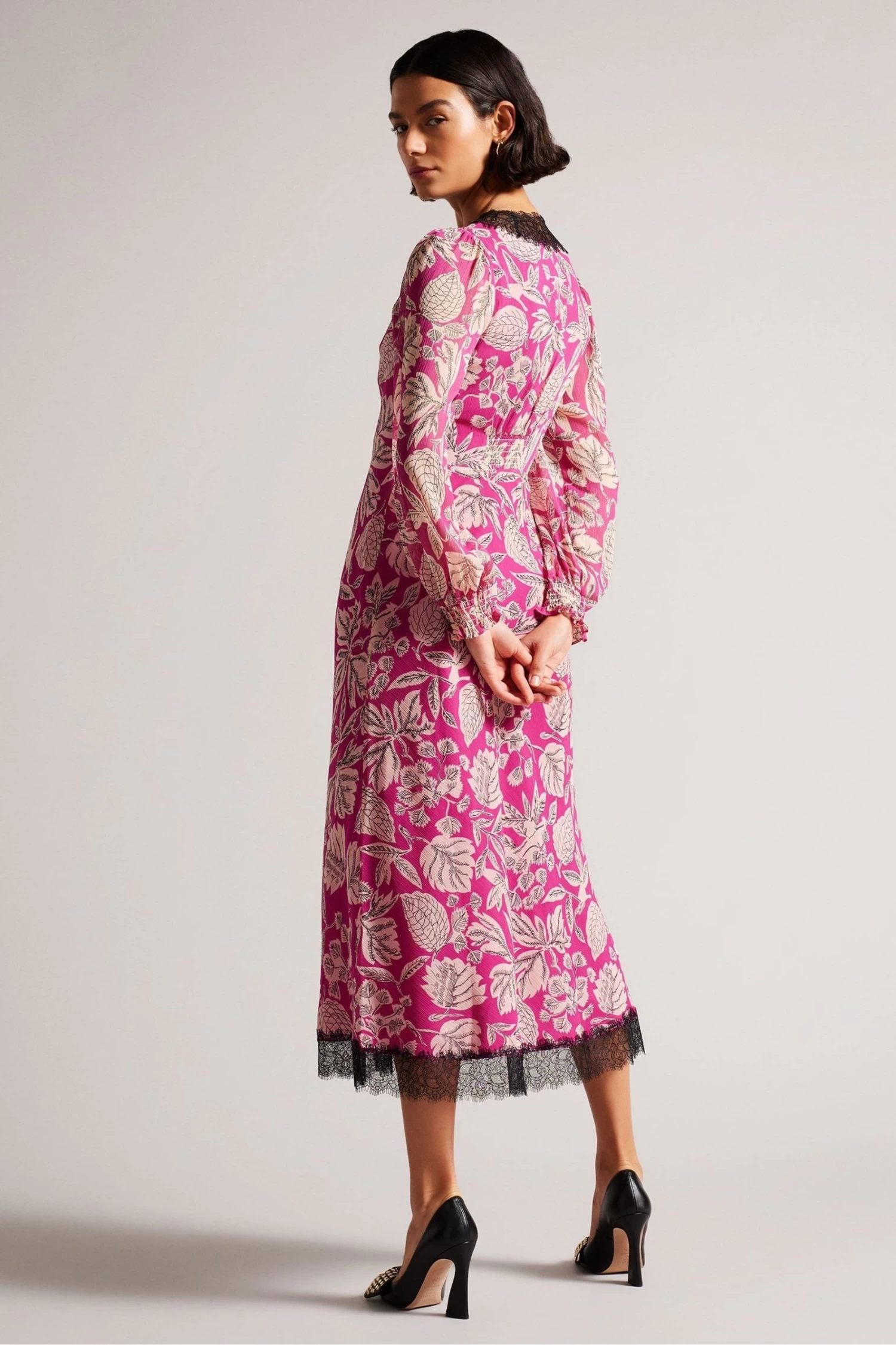 Ted Baker Pink Izobele Long Sleeve Midi Dress With Lace Trim
